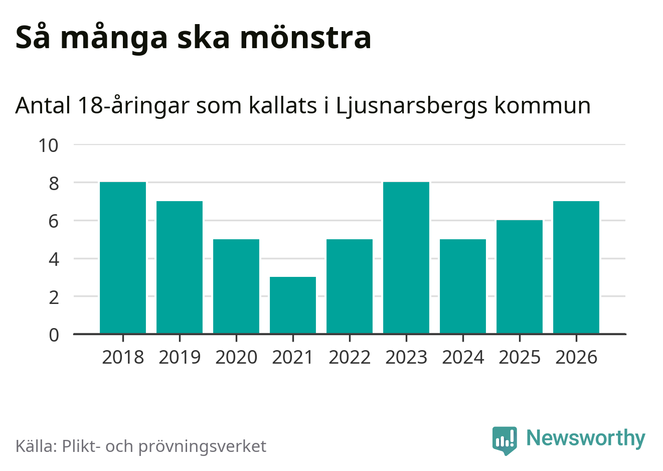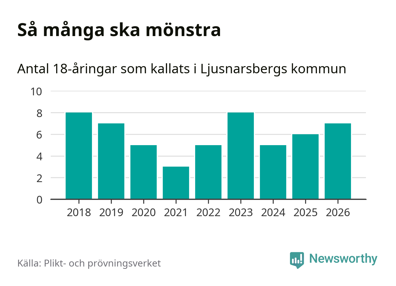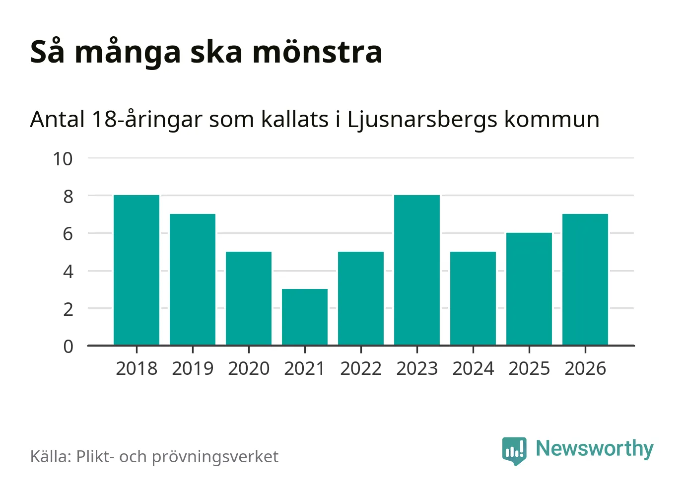Sju personer är en fler än 2025. Som mest har åtta personer från en årskull kommunen mönstrat (2023 och 2018). Totalt från Örebro län kallas 850 personer i år.