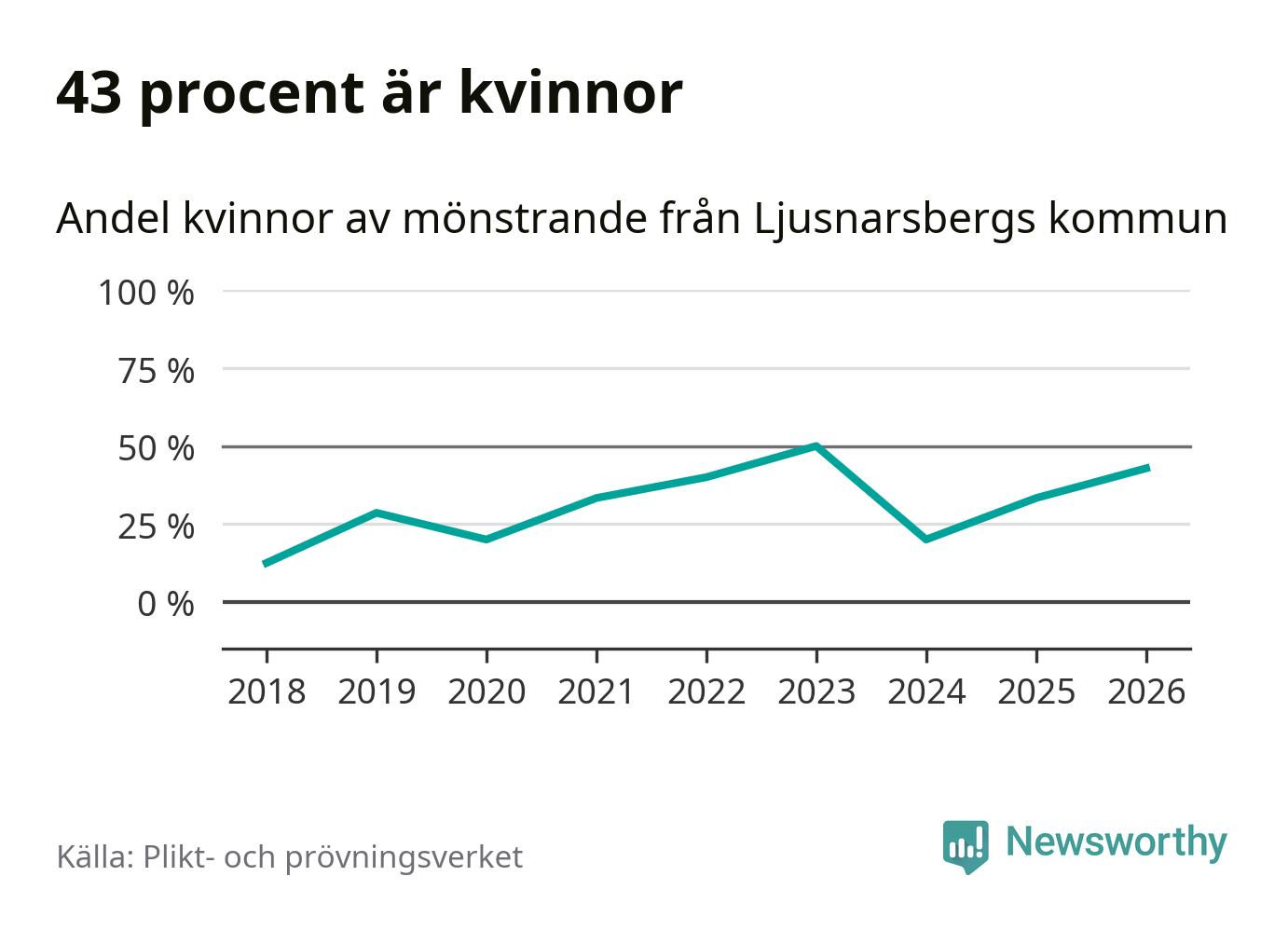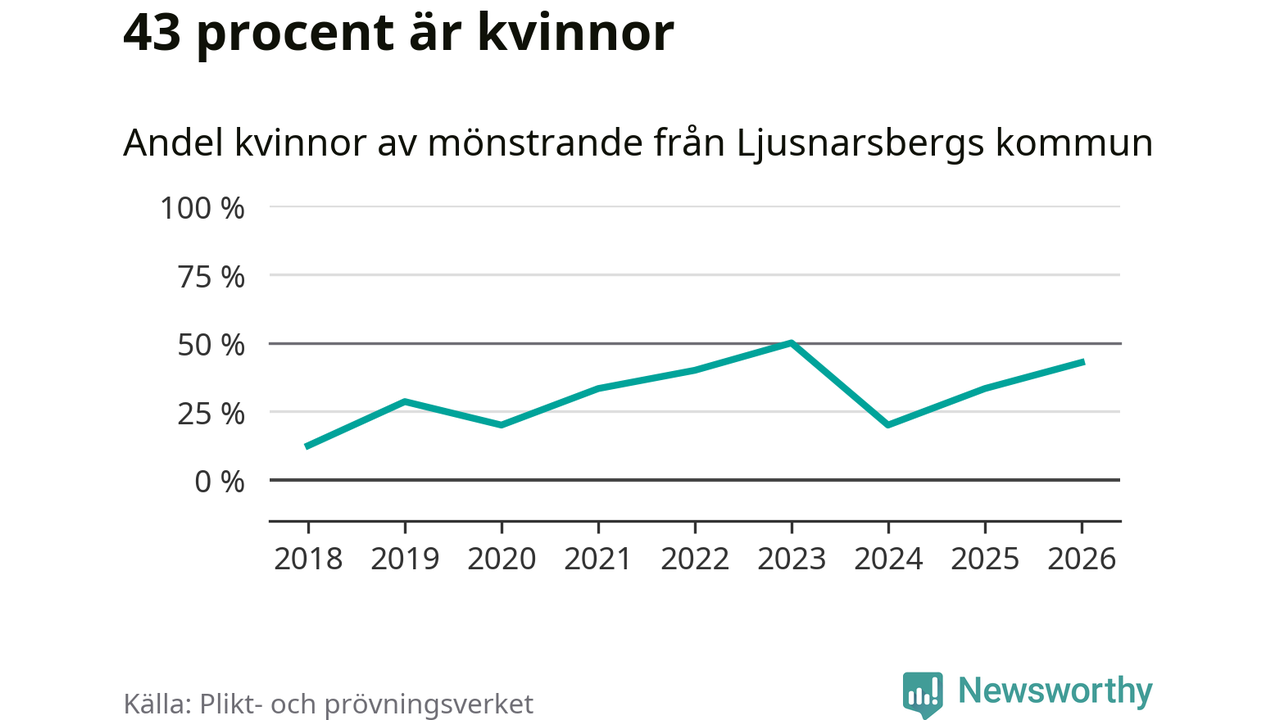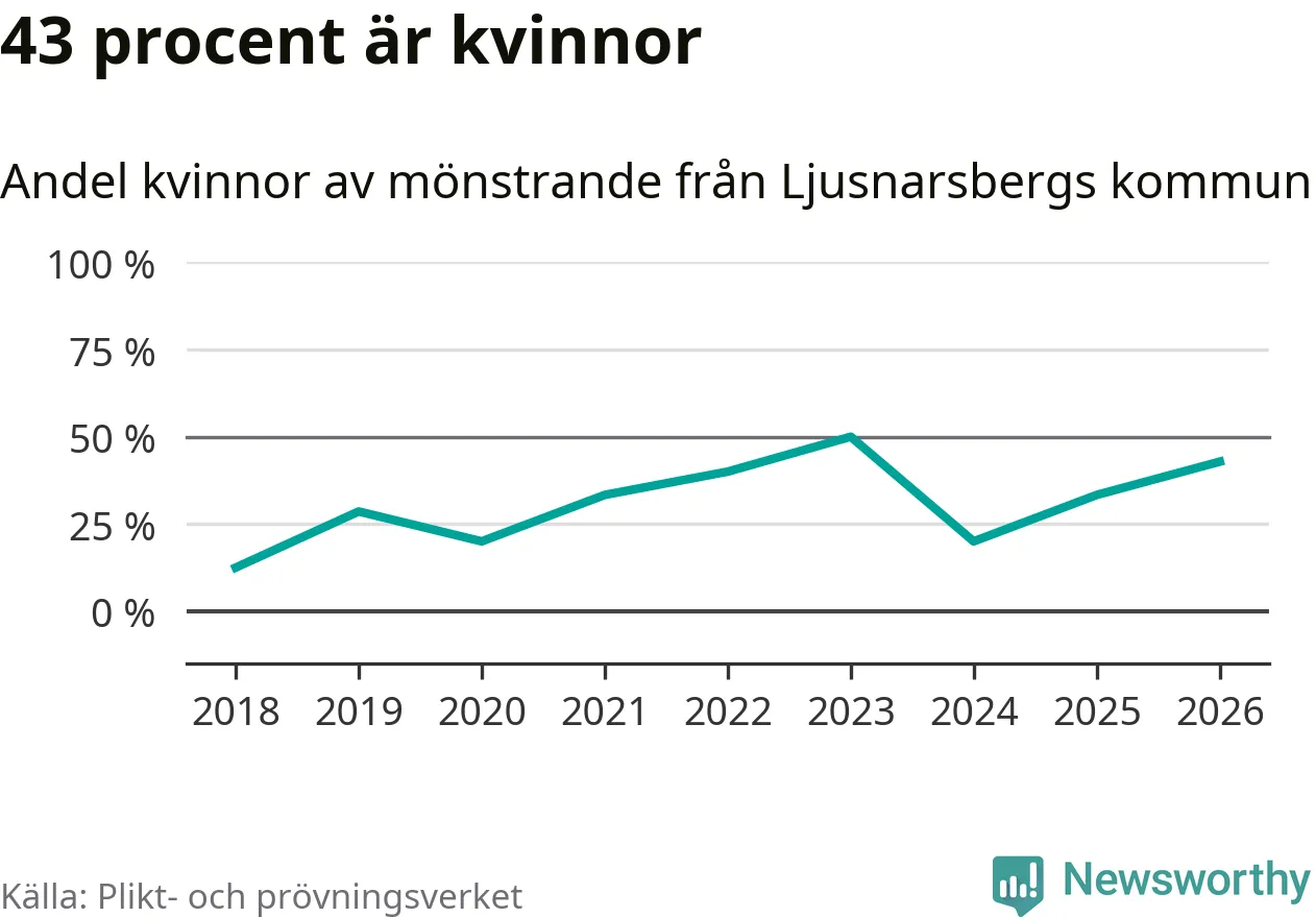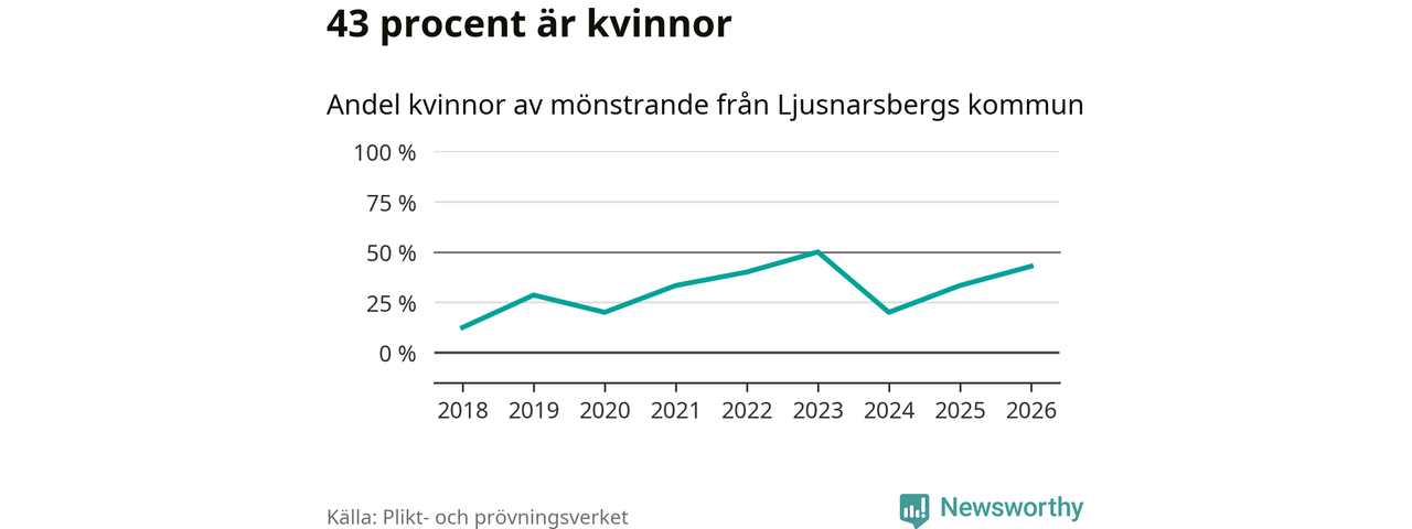 Tre av de som kallats till mönstring från Ljusnarsberg är kvinnor, vilket motsvarar 43 procent av de mönstrande. Som mest har fyra kvinnor kallats från kommunen (2023). I riket som helhet är 28 procent av de mönstrande tjejer.