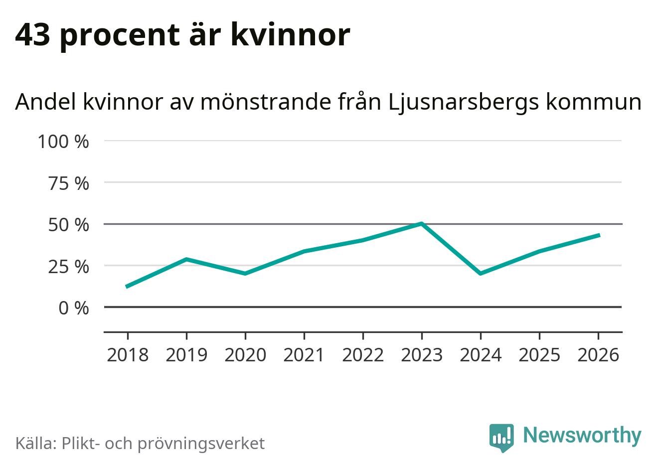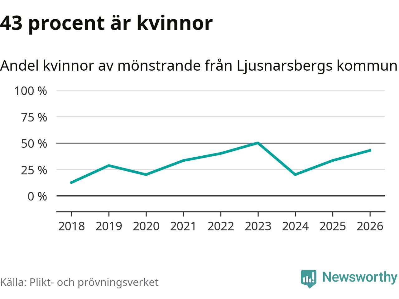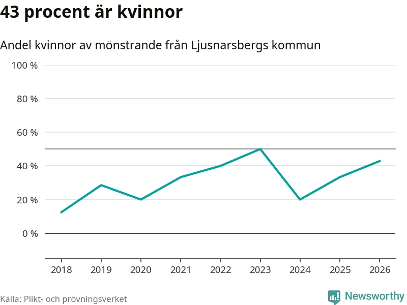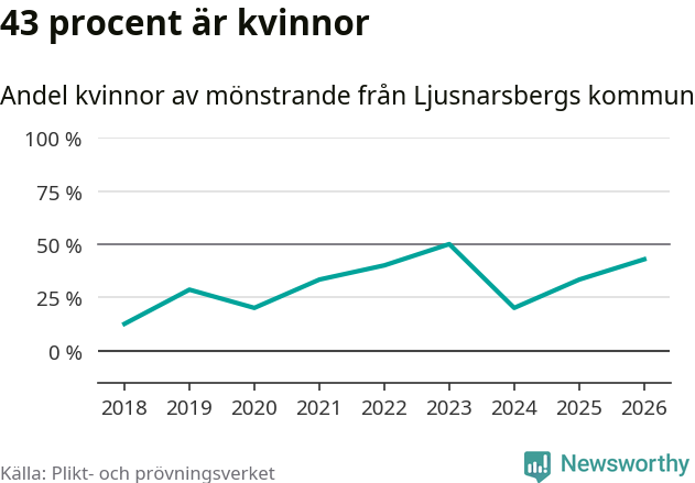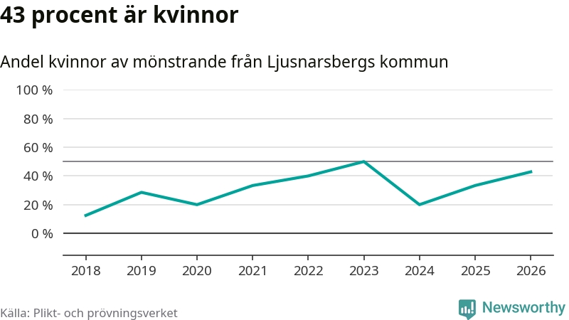 Tre av de som kallats till mönstring från Ljusnarsberg är kvinnor, vilket motsvarar 43 procent av de mönstrande. Som mest har fyra kvinnor kallats från kommunen (2023). I riket som helhet är 28 procent av de mönstrande tjejer.