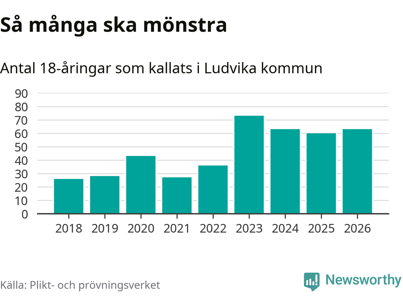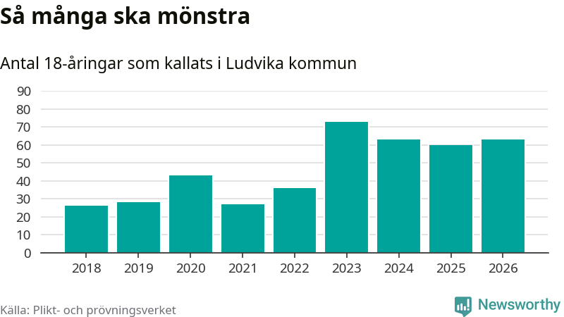 63 personer är tre fler än 2025, men sett som andel av respektive åldersgrupp är skillnaden liten. Som mest har 73 personer från en årskull kommunen mönstrat (2023). Totalt från Dalarnas län kallas 741 personer i år.