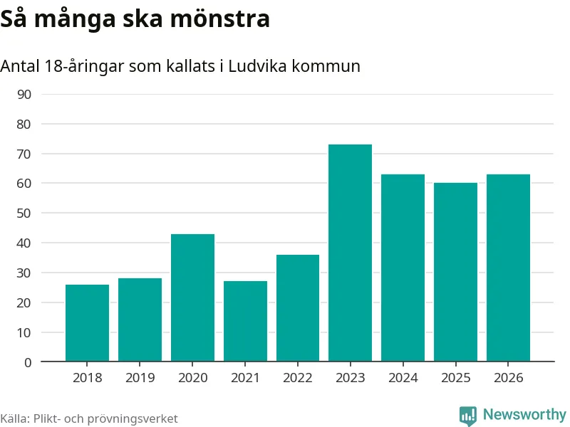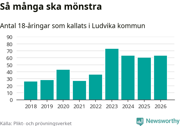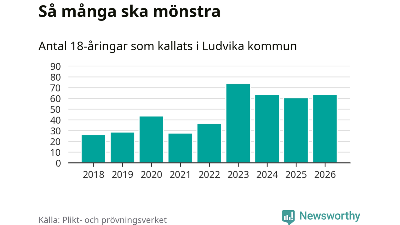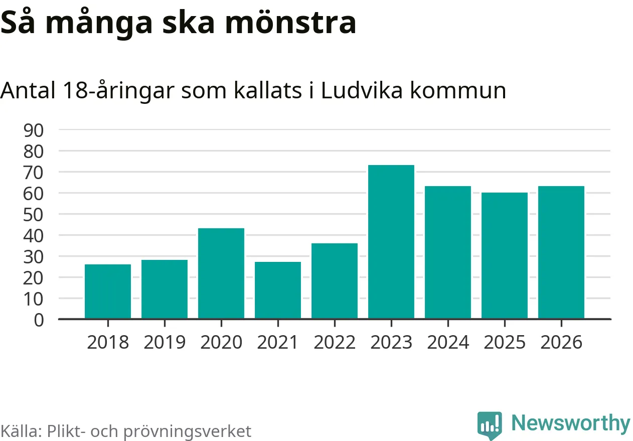 Nu kallas omkring 30 000 svenskar födda 2008 till mönstring. Och 63 av dem kommer från Ludvika, enligt ny statistik från Plikt- och prövningsverket. Det innebär att var femte invånare i åldersgruppen i kommunen kallas till mönstring. Det är ungefär lika stor andel som i Dalarna totalt. I riket som helhet kallas nästan var fjärde person i årskullen.