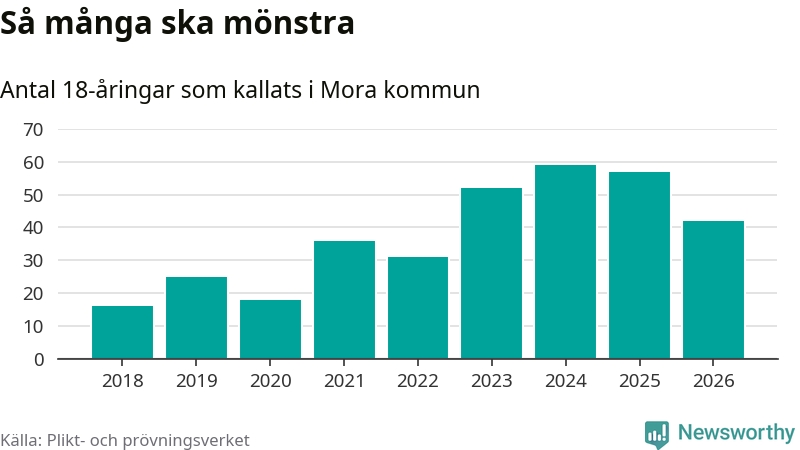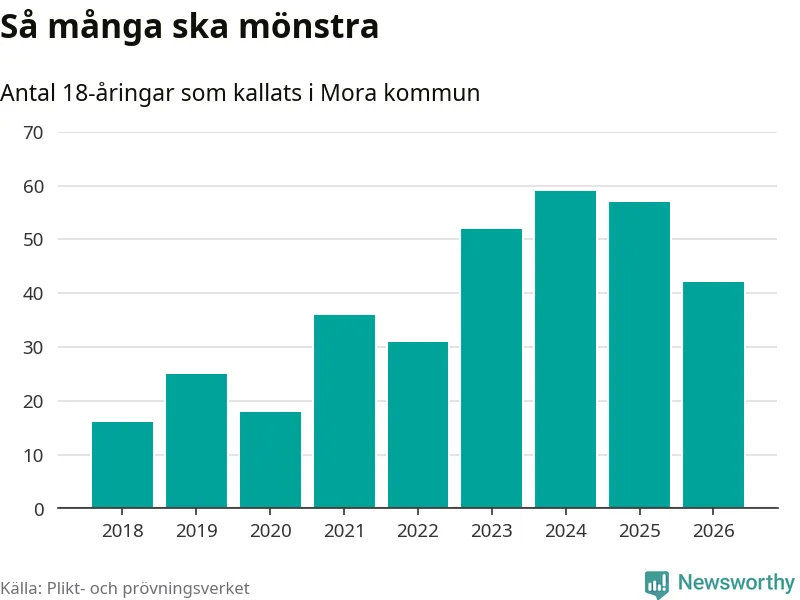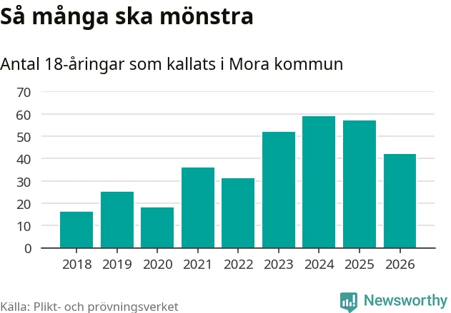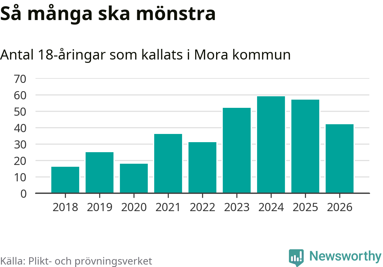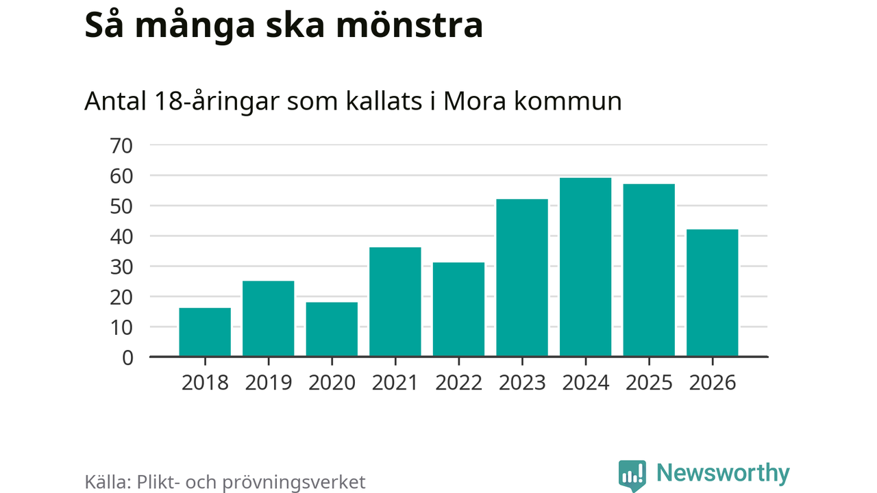 Nu kallas omkring 30 000 svenskar födda 2008 till mönstring. Och 42 av dem kommer från Mora, enligt ny statistik från Plikt- och prövningsverket. Det innebär att var sjätte invånare i åldersgruppen i kommunen kallas till mönstring. Det är en lägre andel än i Dalarna totalt. I riket som helhet kallas nästan var fjärde person i årskullen.