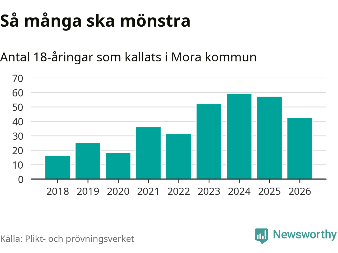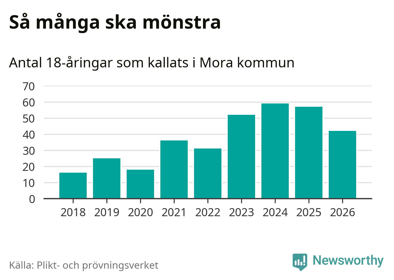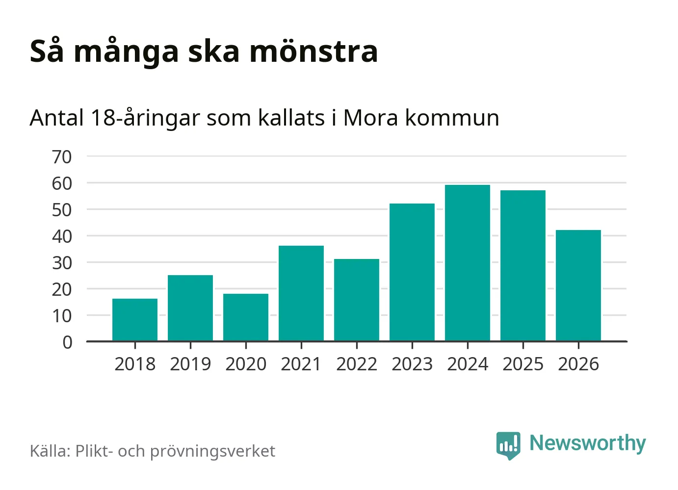 Nu kallas omkring 30 000 svenskar födda 2008 till mönstring. Och 42 av dem kommer från Mora, enligt ny statistik från Plikt- och prövningsverket. Det innebär att var sjätte invånare i åldersgruppen i kommunen kallas till mönstring. Det är en lägre andel än i Dalarna totalt. I riket som helhet kallas nästan var fjärde person i årskullen.