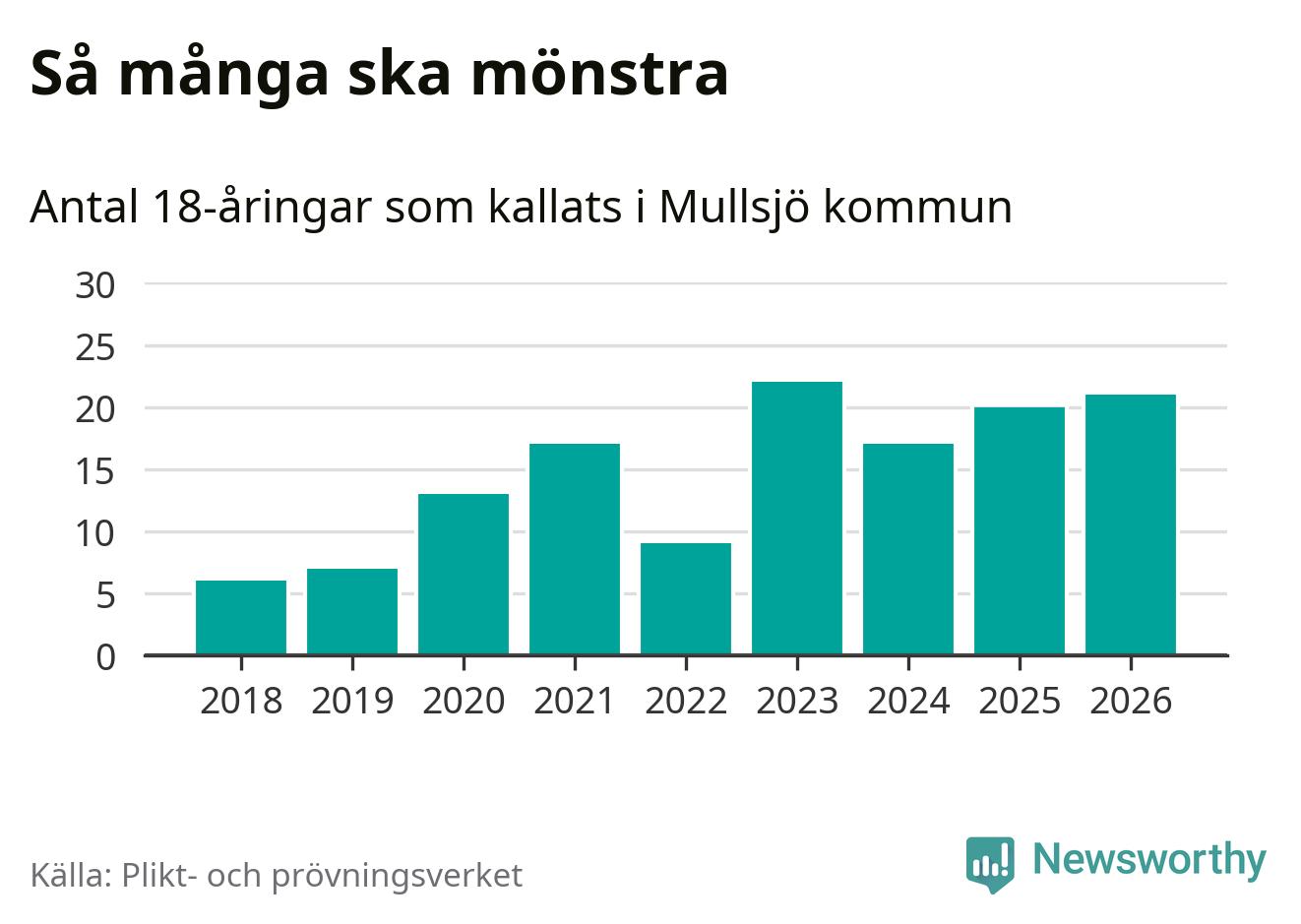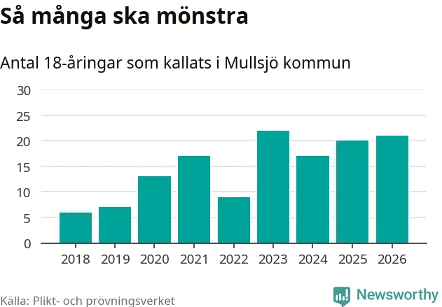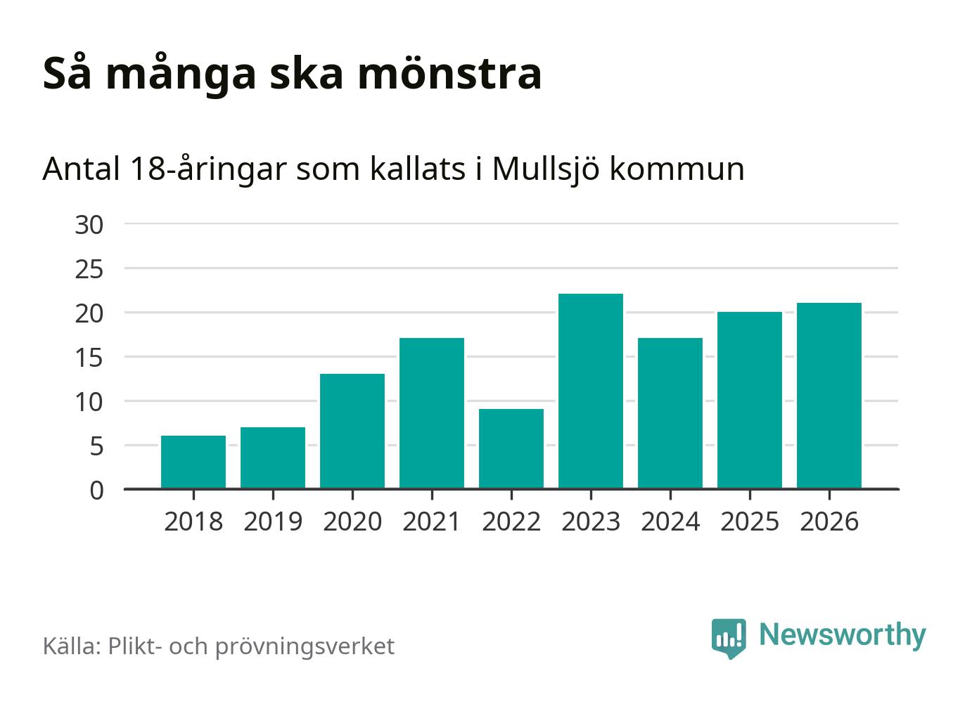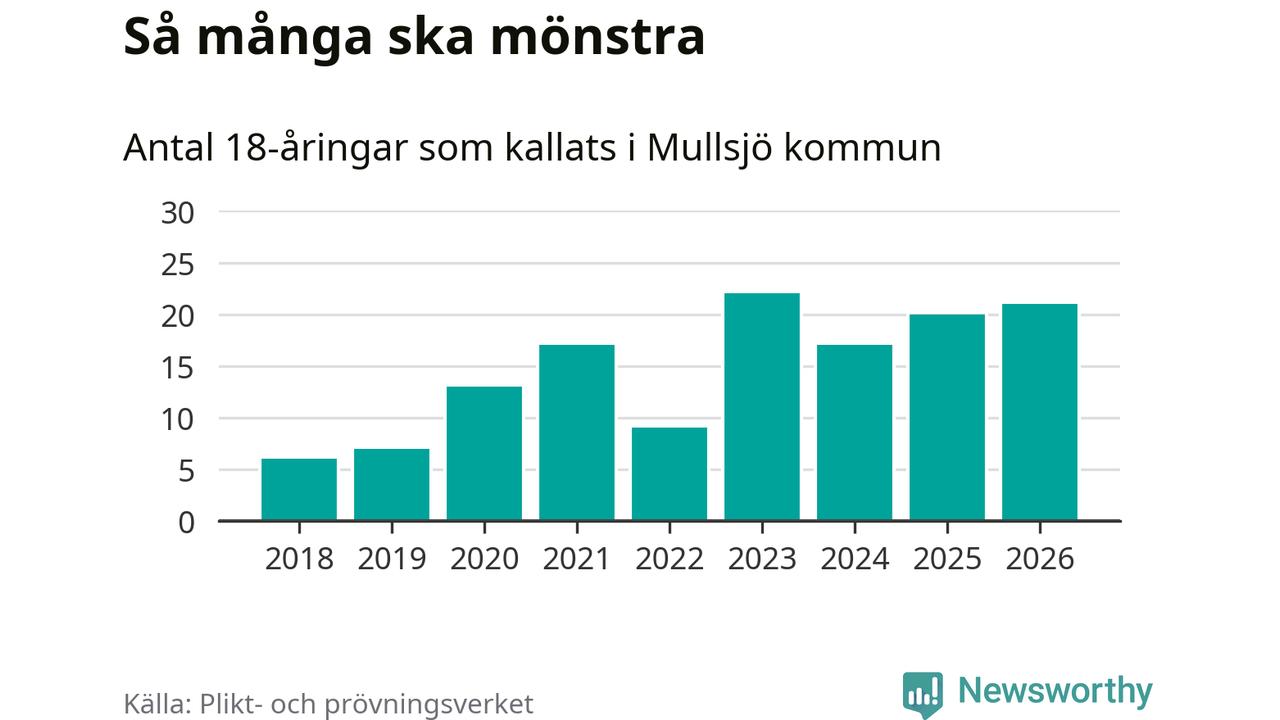 Nu kallas omkring 30 000 svenskar födda 2008 till mönstring. Och 21 av dem kommer från Mullsjö, enligt ny statistik från Plikt- och prövningsverket. Det innebär att var femte invånare i åldersgruppen i kommunen kallas till mönstring. Det är en lägre andel än i Jönköpings län totalt. I riket som helhet kallas nästan var fjärde person i årskullen.