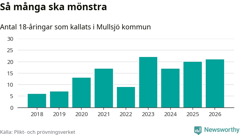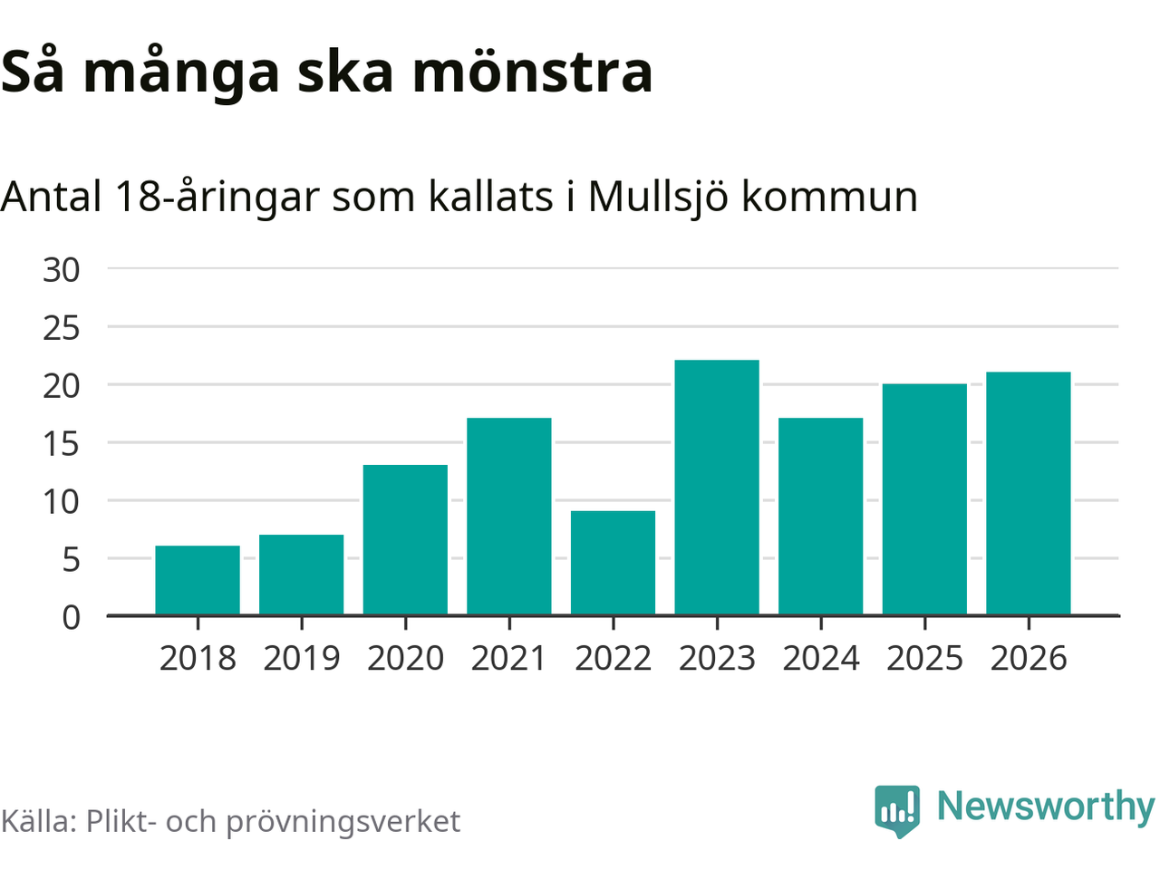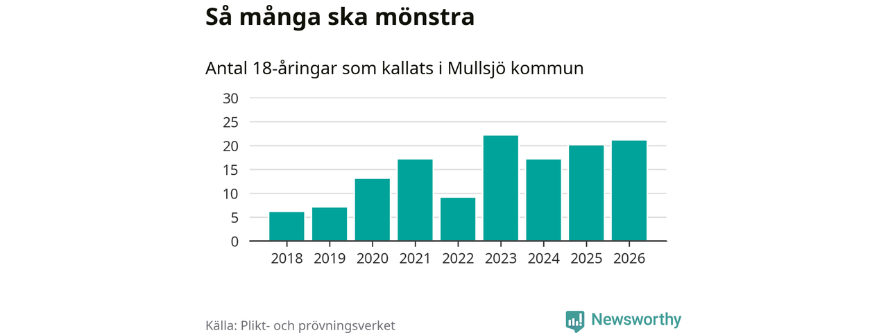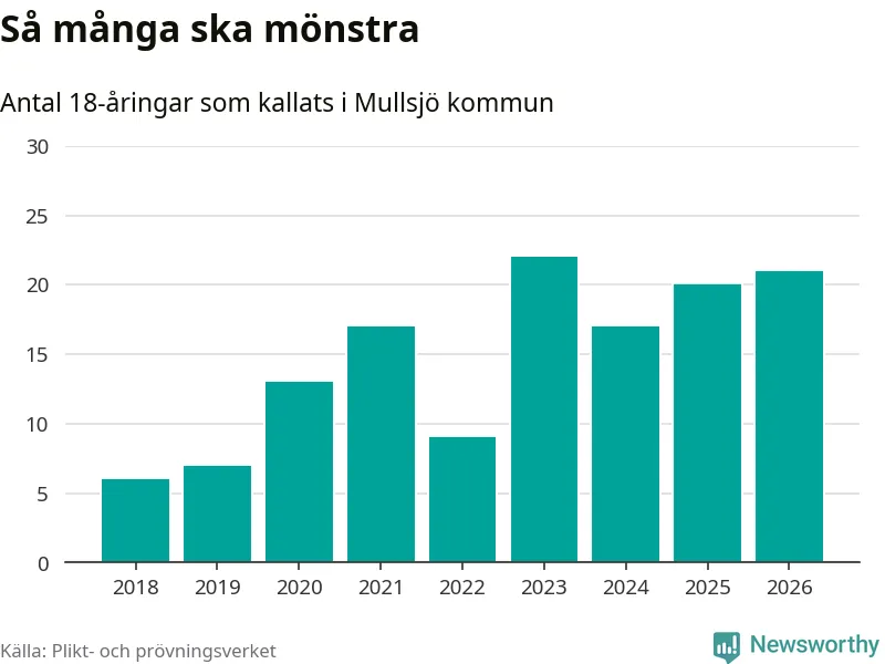 Nu kallas omkring 30 000 svenskar födda 2008 till mönstring. Och 21 av dem kommer från Mullsjö, enligt ny statistik från Plikt- och prövningsverket. Det innebär att var femte invånare i åldersgruppen i kommunen kallas till mönstring. Det är en lägre andel än i Jönköpings län totalt. I riket som helhet kallas nästan var fjärde person i årskullen.