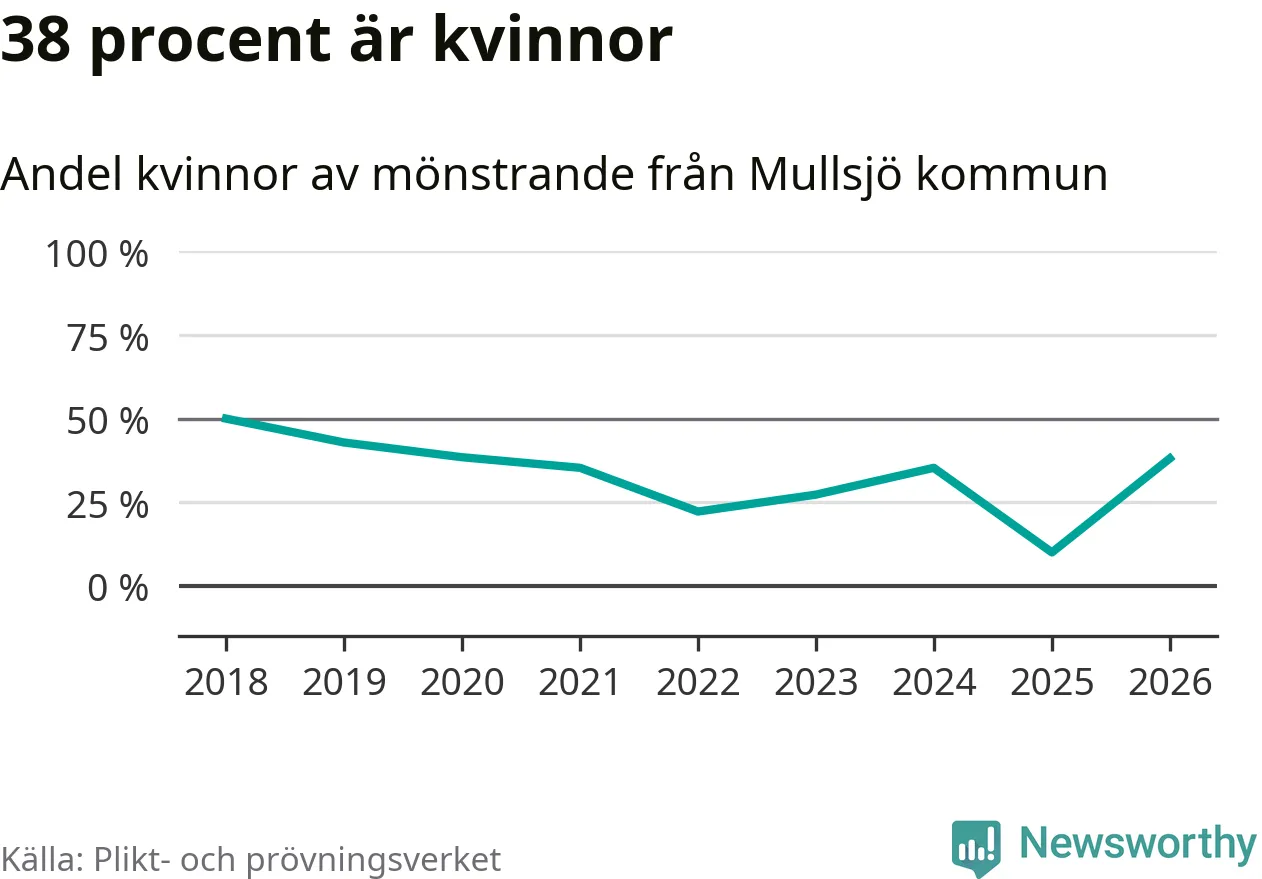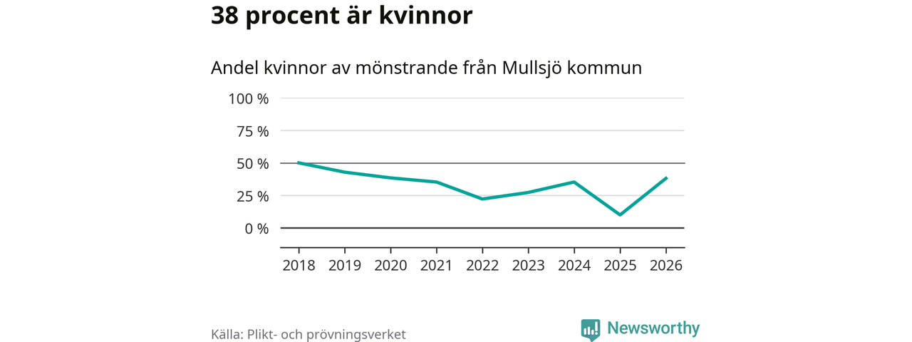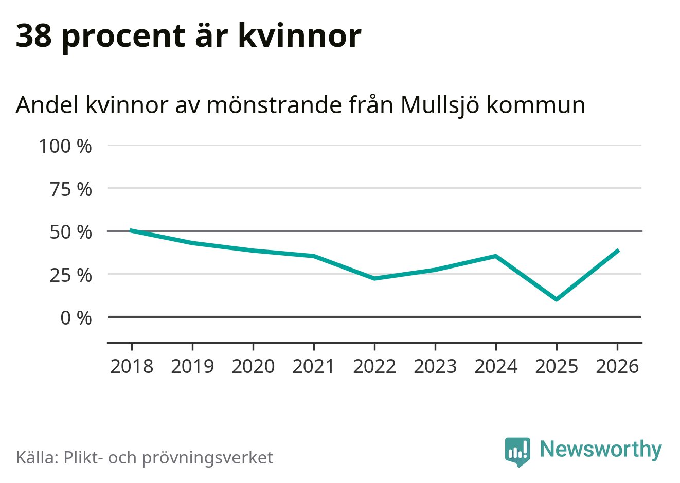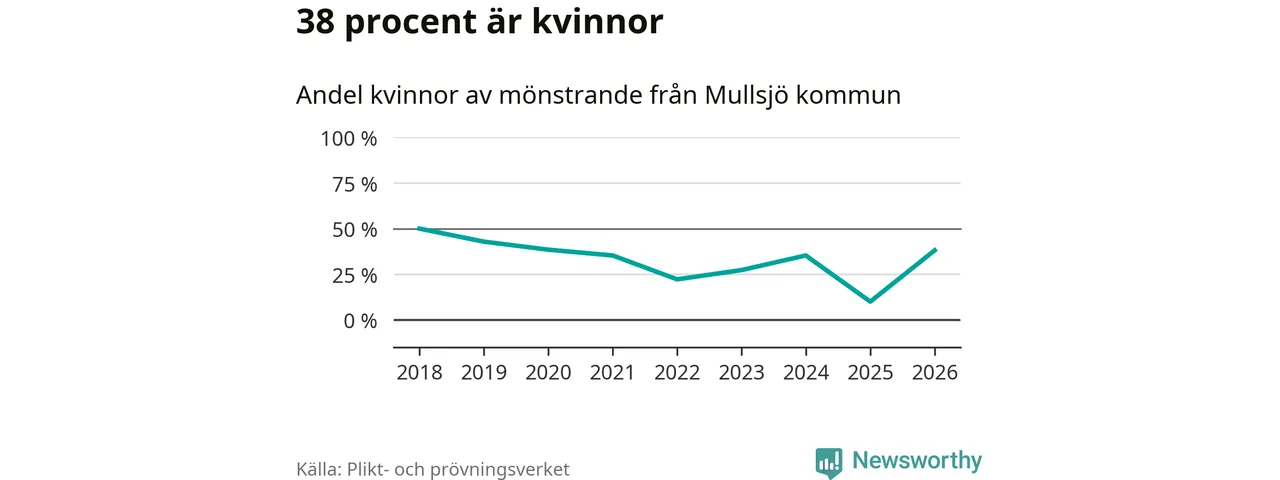 Åtta av de som kallats till mönstring från Mullsjö är kvinnor, vilket motsvarar 38 procent av de mönstrande. I absoluta tal är det fler kvinnor än något år sedan värnplikten återinfördes, men 2018 var en större andel av de mönstrande från kommunen kvinnor (50 procent). I riket som helhet är 28 procent av de mönstrande tjejer.