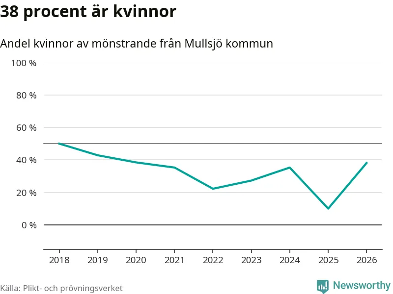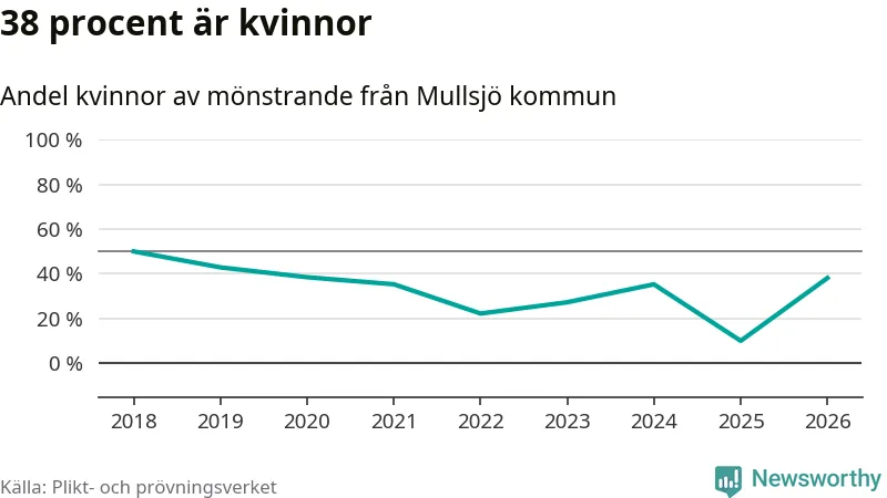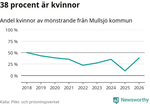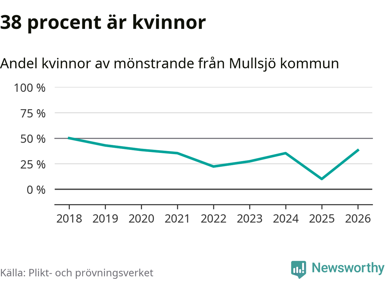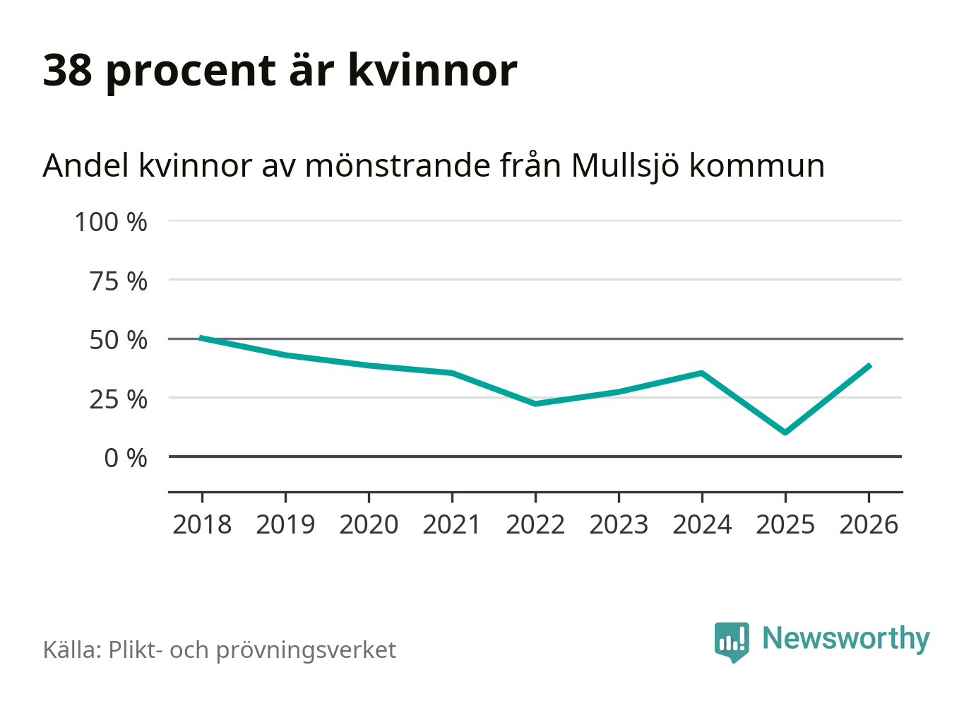 Åtta av de som kallats till mönstring från Mullsjö är kvinnor, vilket motsvarar 38 procent av de mönstrande. I absoluta tal är det fler kvinnor än något år sedan värnplikten återinfördes, men 2018 var en större andel av de mönstrande från kommunen kvinnor (50 procent). I riket som helhet är 28 procent av de mönstrande tjejer.