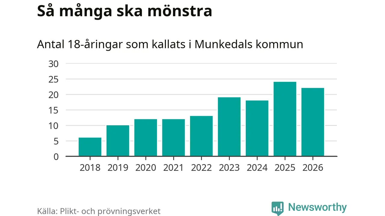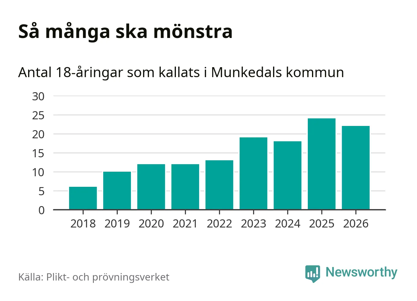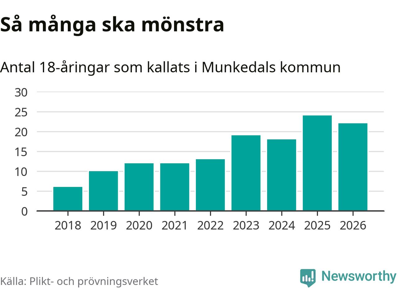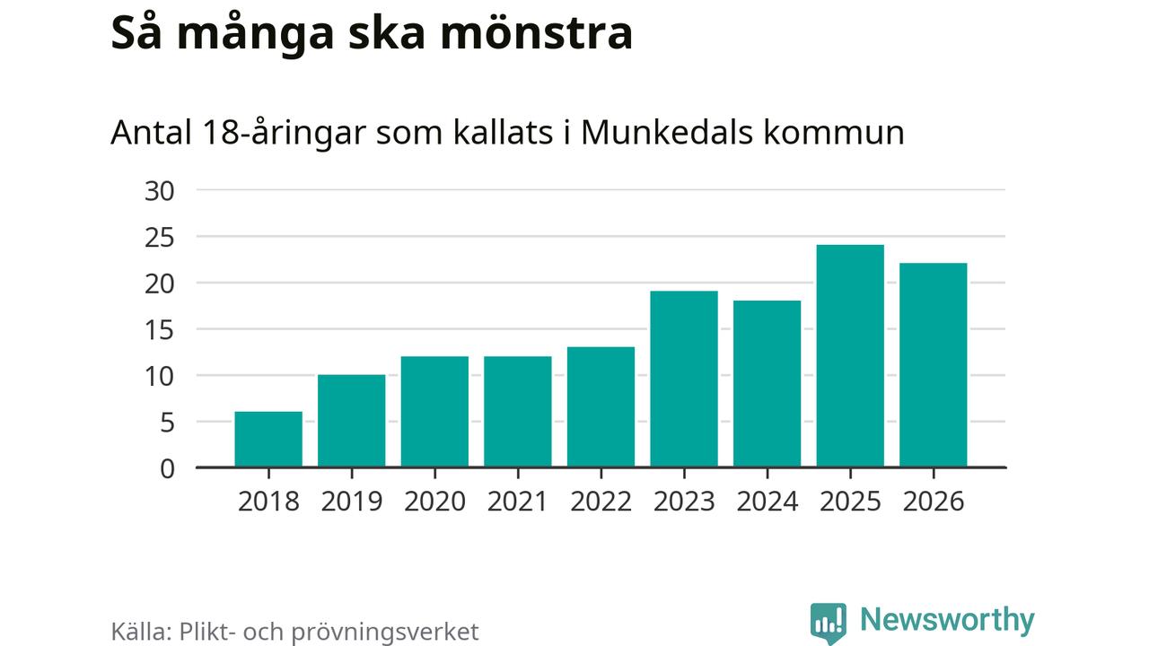 Nu kallas omkring 30 000 svenskar födda 2008 till mönstring. Och 22 av dem kommer från Munkedal, enligt ny statistik från Plikt- och prövningsverket. Det innebär att var sjätte invånare i åldersgruppen i kommunen kallas till mönstring. Det är en lägre andel än i Västra Götaland totalt. I riket som helhet kallas nästan var fjärde person i årskullen.