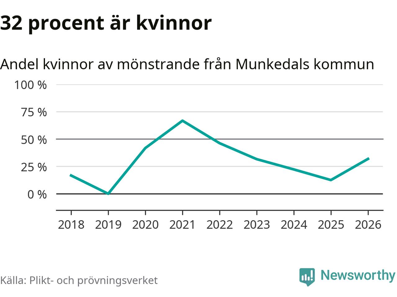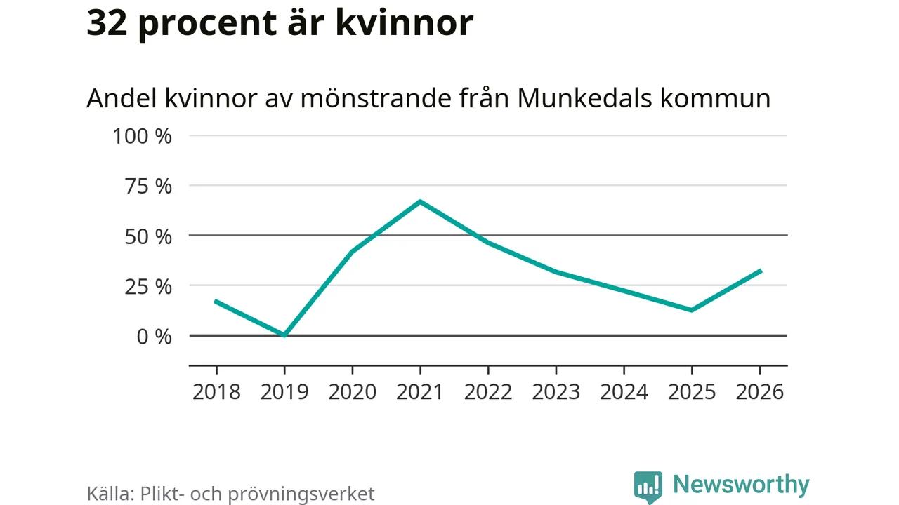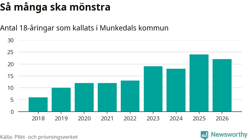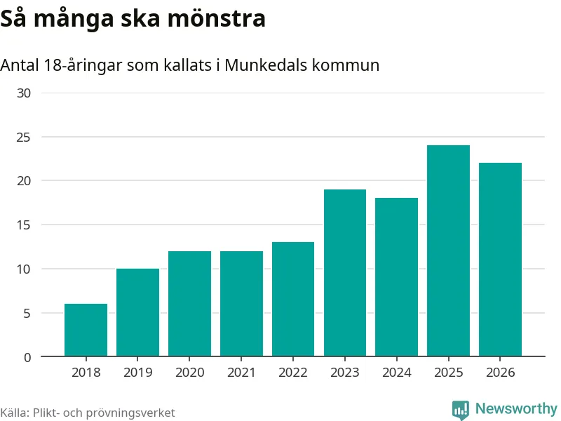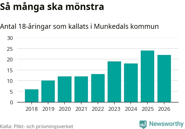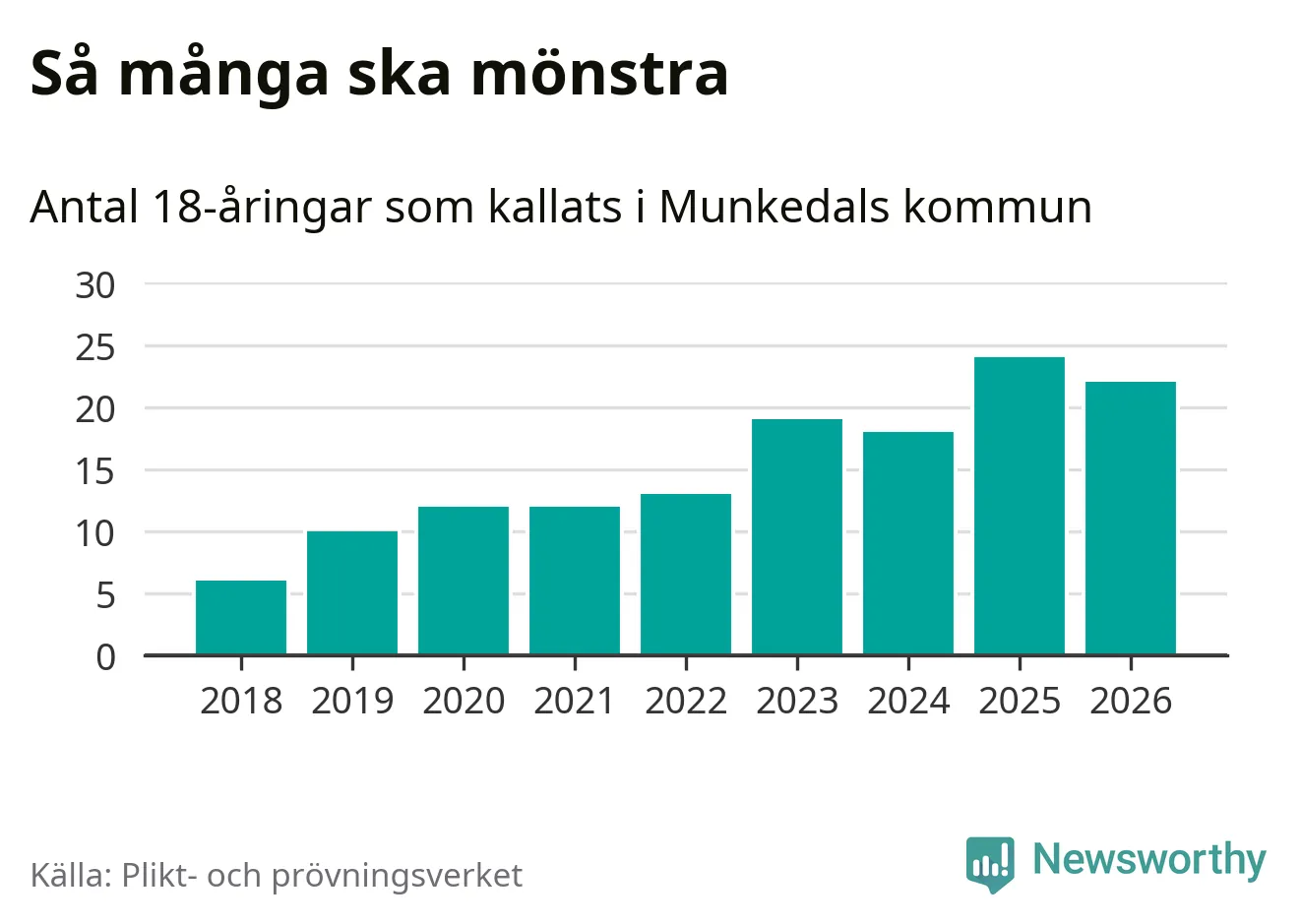 Nu kallas omkring 30 000 svenskar födda 2008 till mönstring. Och 22 av dem kommer från Munkedal, enligt ny statistik från Plikt- och prövningsverket. Det innebär att var sjätte invånare i åldersgruppen i kommunen kallas till mönstring. Det är en lägre andel än i Västra Götaland totalt. I riket som helhet kallas nästan var fjärde person i årskullen.