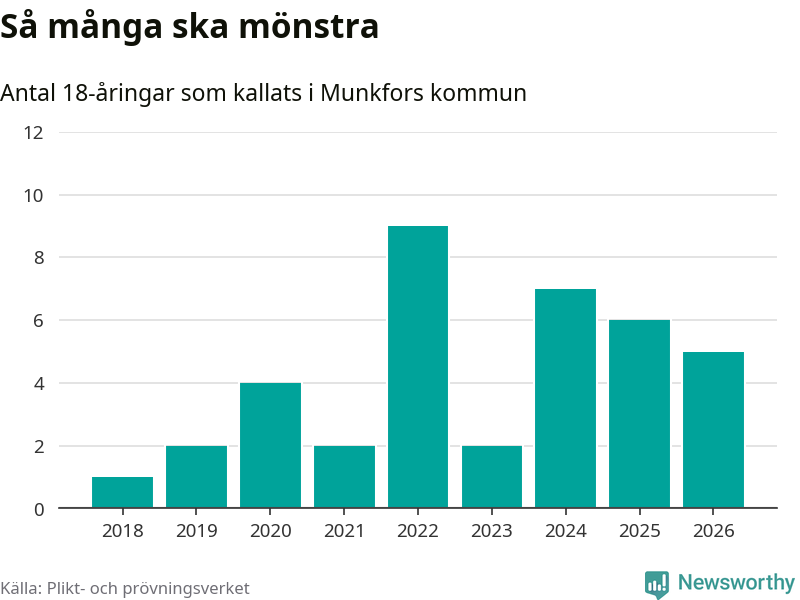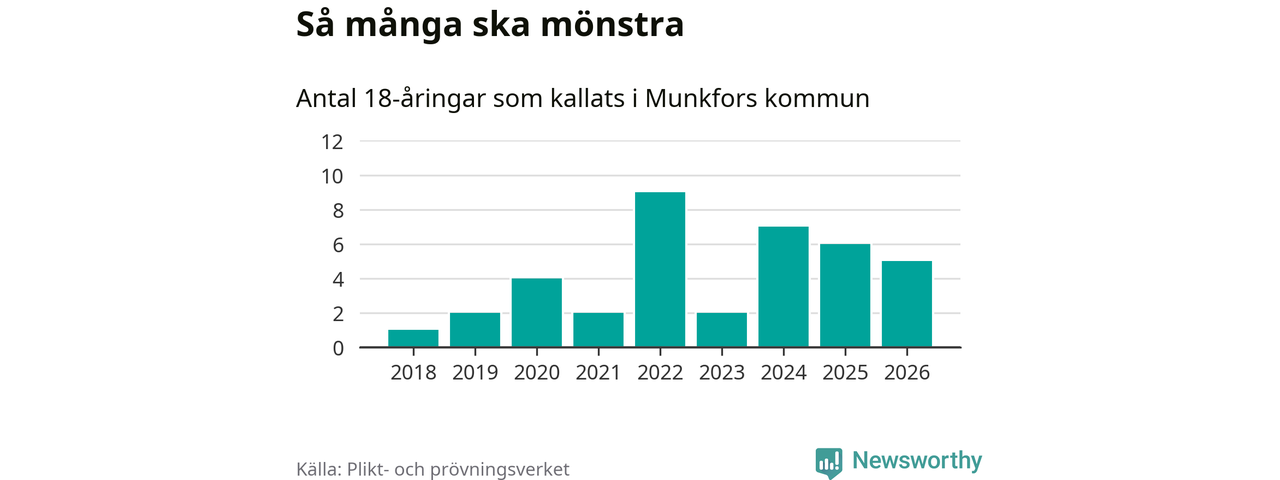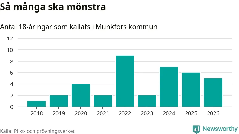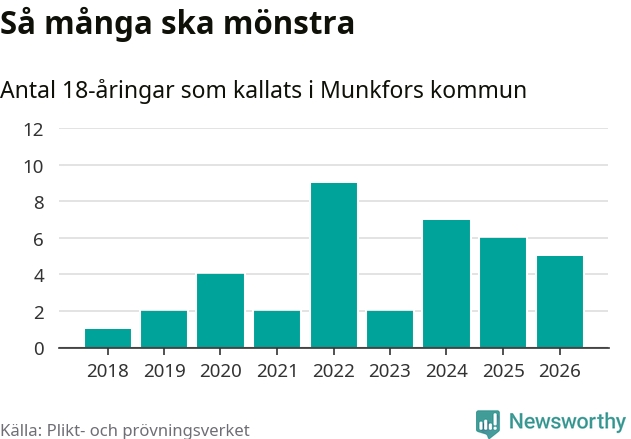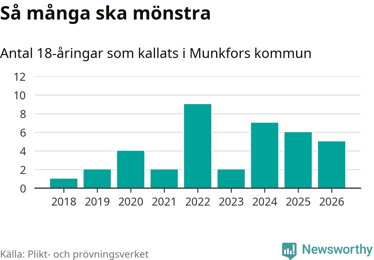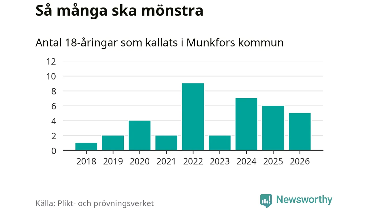 Nu kallas omkring 30 000 svenskar födda 2008 till mönstring. Och fem av dem kommer från Munkfors, enligt ny statistik från Plikt- och prövningsverket. Det innebär att var åttonde invånare i åldersgruppen i kommunen kallas till mönstring. Det är en lägre andel än i Värmland totalt. I riket som helhet kallas nästan var fjärde person i årskullen.