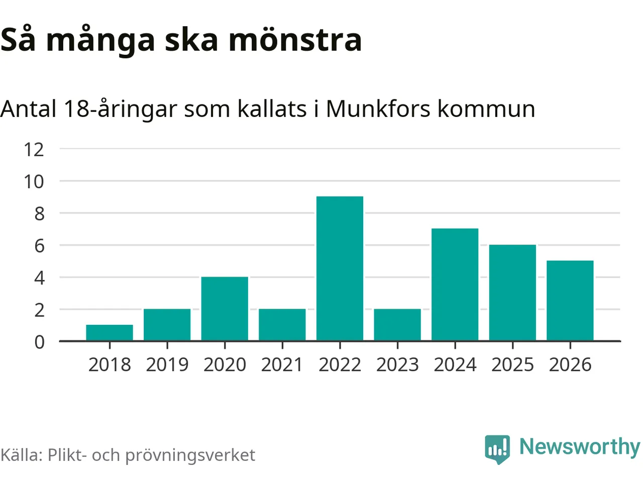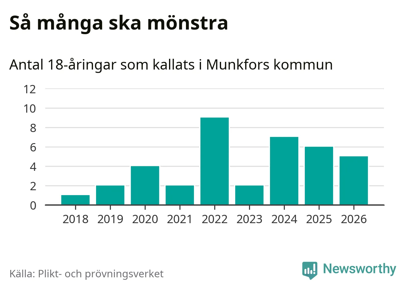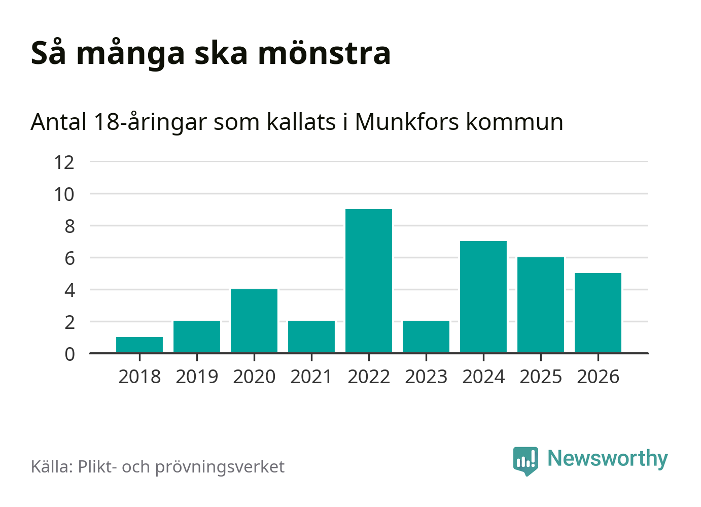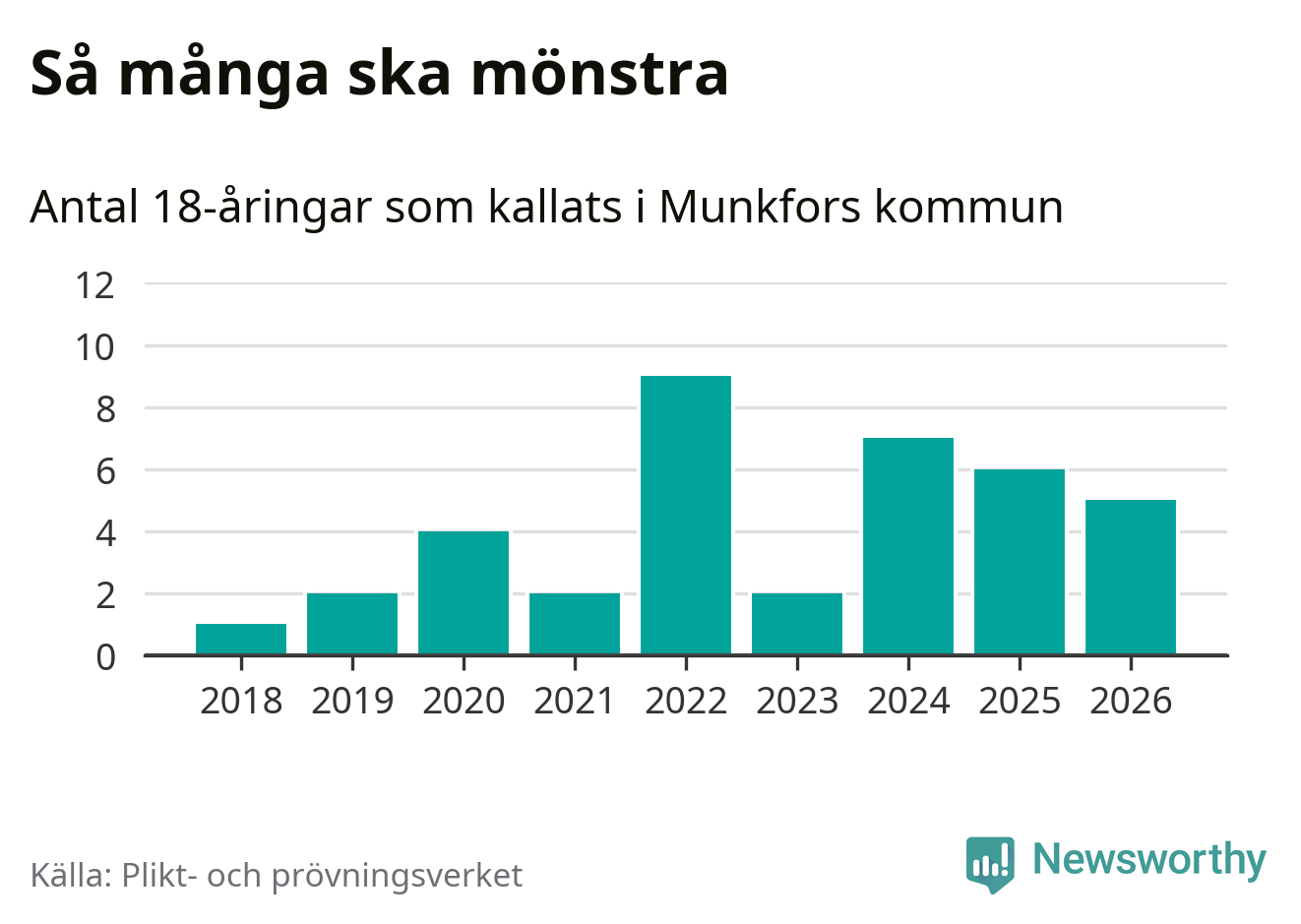Fem personer är en färre än 2025. Som mest har nio personer från en årskull kommunen mönstrat (2022). Totalt från Värmlands län kallas 730 personer i år.