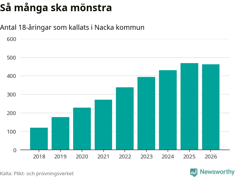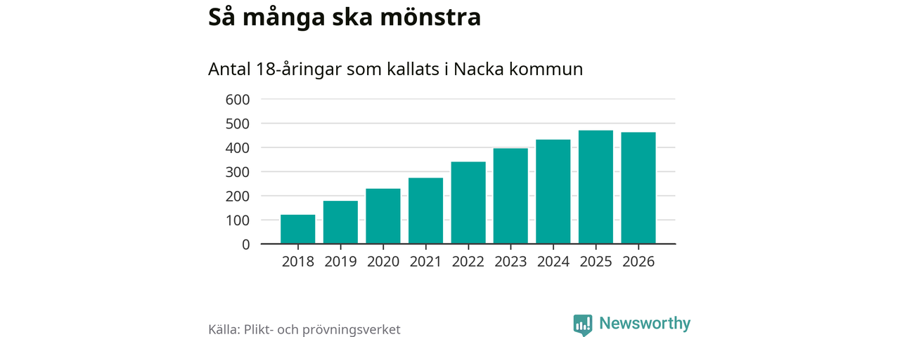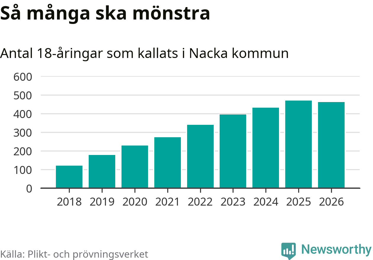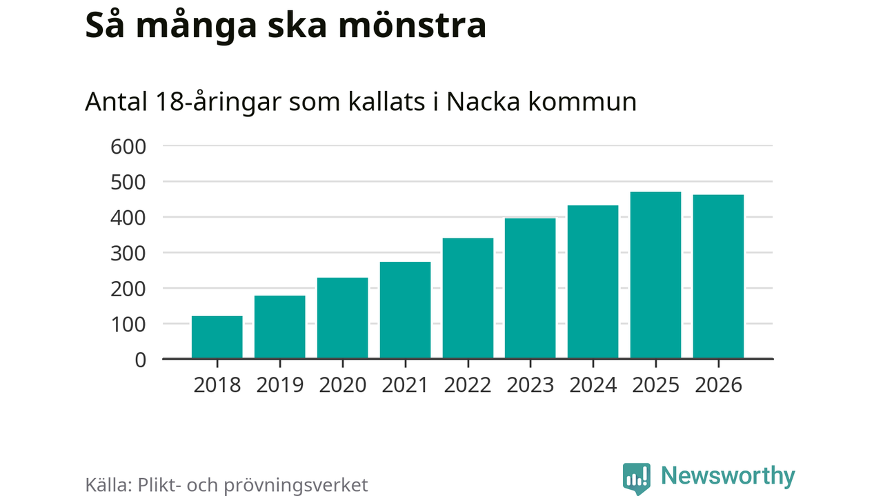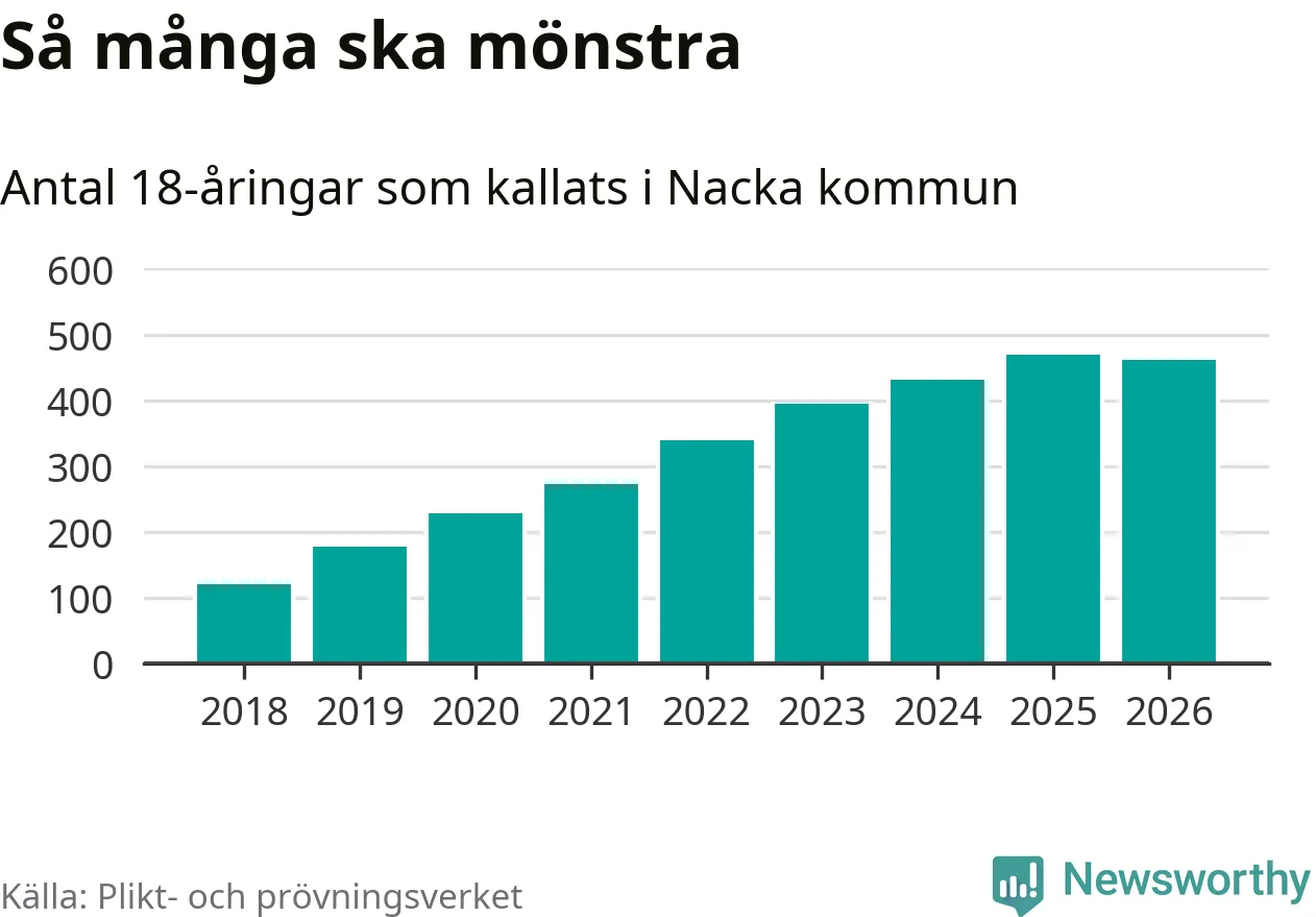 Nu kallas omkring 30 000 svenskar födda 2008 till mönstring. Och 462 av dem kommer från Nacka, enligt ny statistik från Plikt- och prövningsverket. Det innebär att mer än var fjärde invånare i åldersgruppen i kommunen kallas till mönstring. Det är en högre andel än i Stockholms län totalt. I riket som helhet kallas nästan var fjärde person i årskullen.