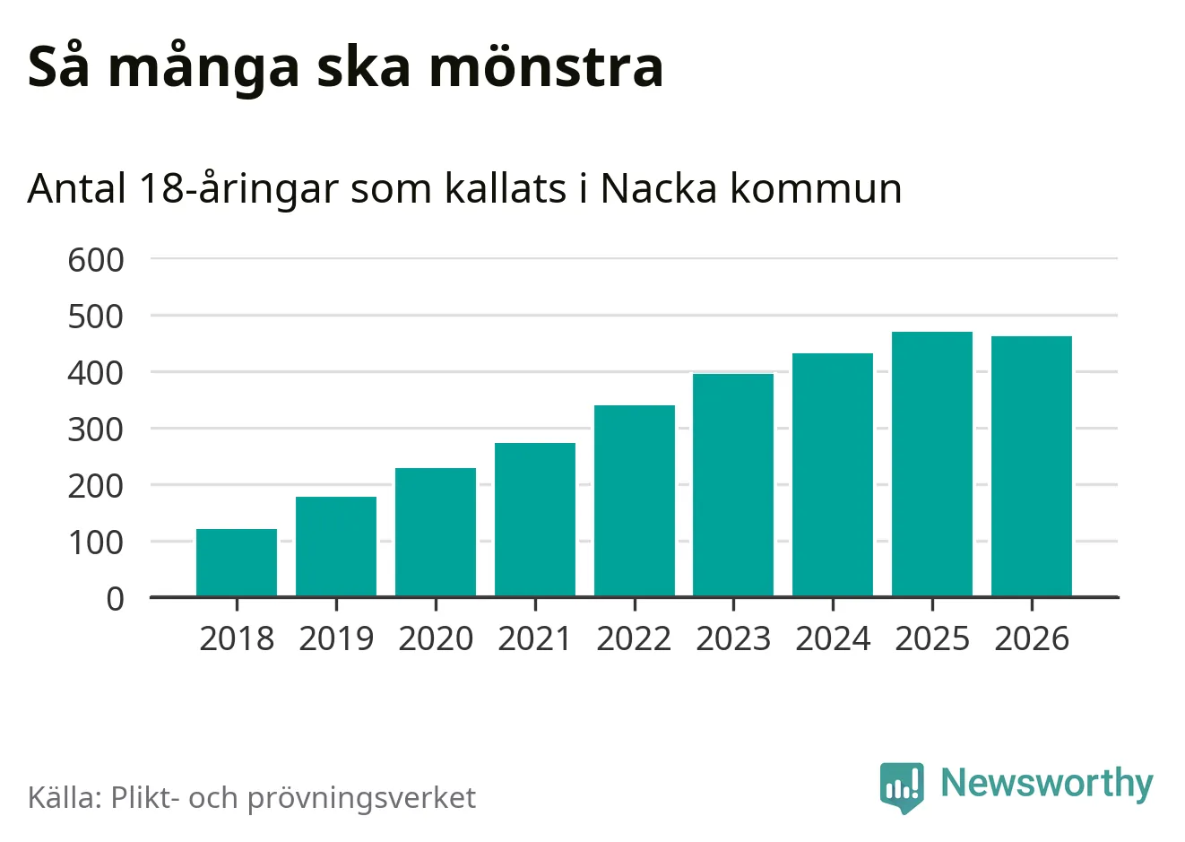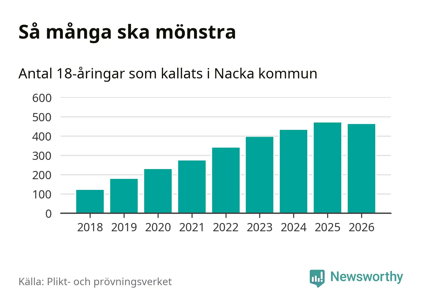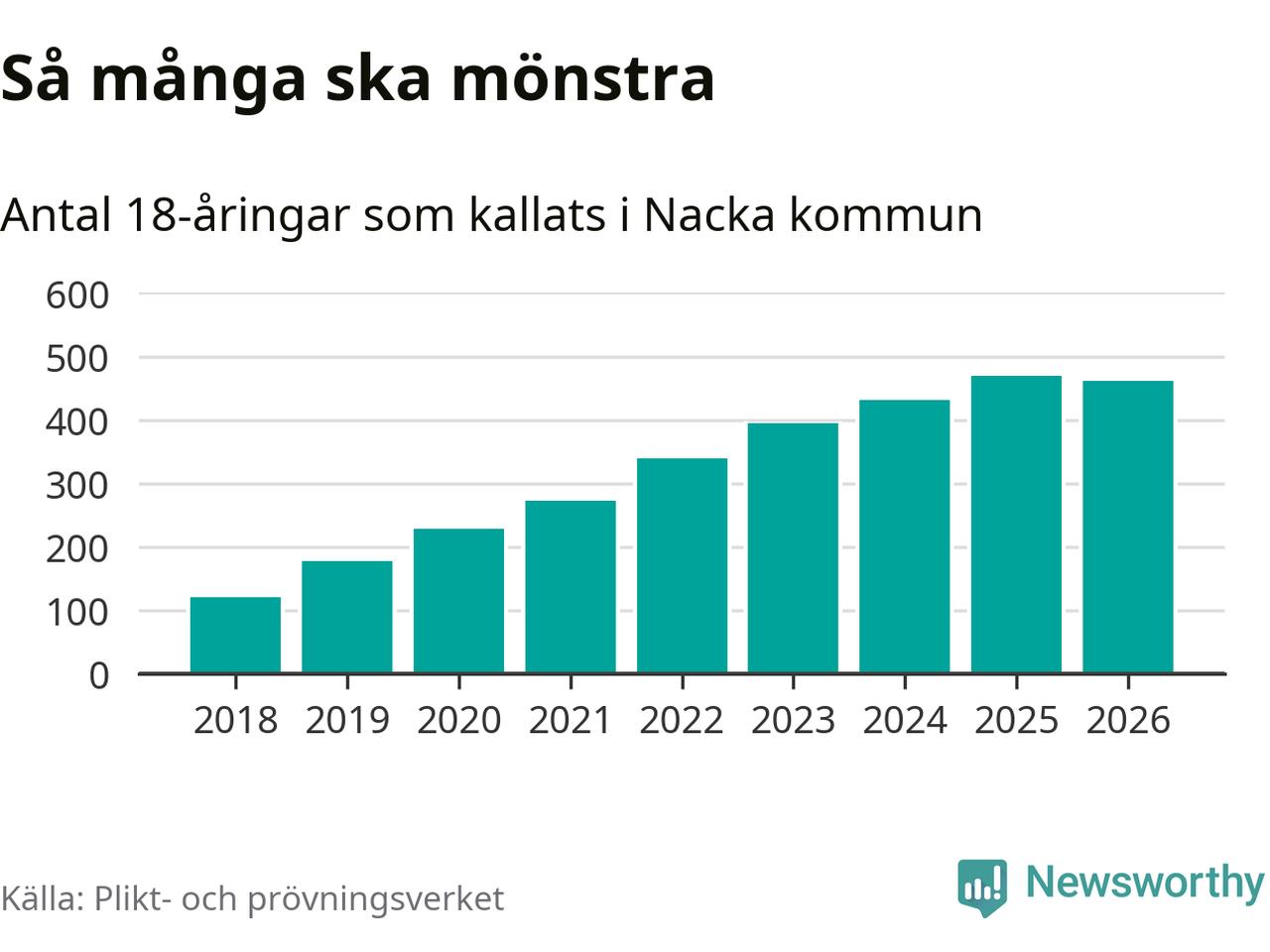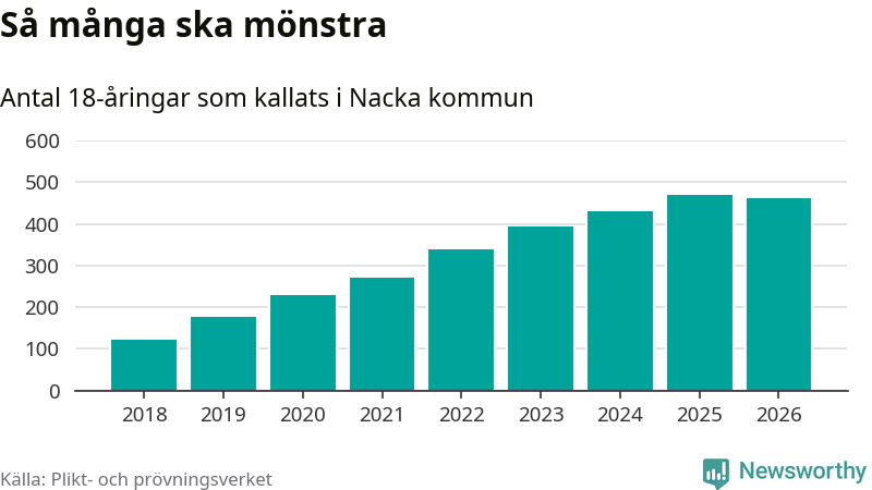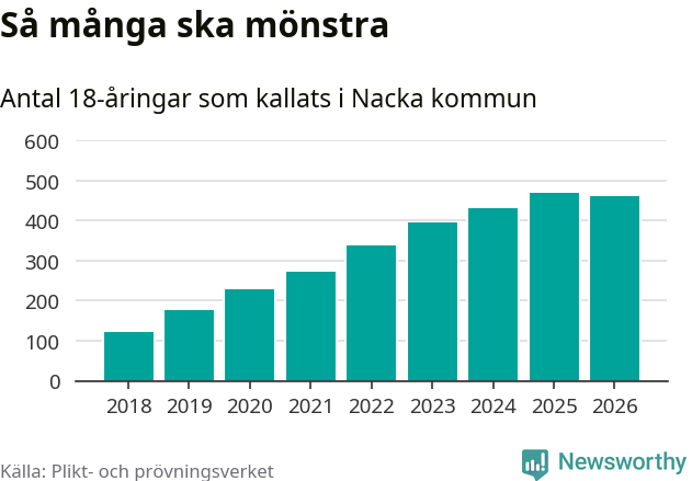Nu kallas omkring 30 000 svenskar födda 2008 till mönstring. Och 462 av dem kommer från Nacka, enligt ny statistik från Plikt- och prövningsverket. Det innebär att mer än var fjärde invånare i åldersgruppen i kommunen kallas till mönstring. Det är en högre andel än i Stockholms län totalt. I riket som helhet kallas nästan var fjärde person i årskullen.
