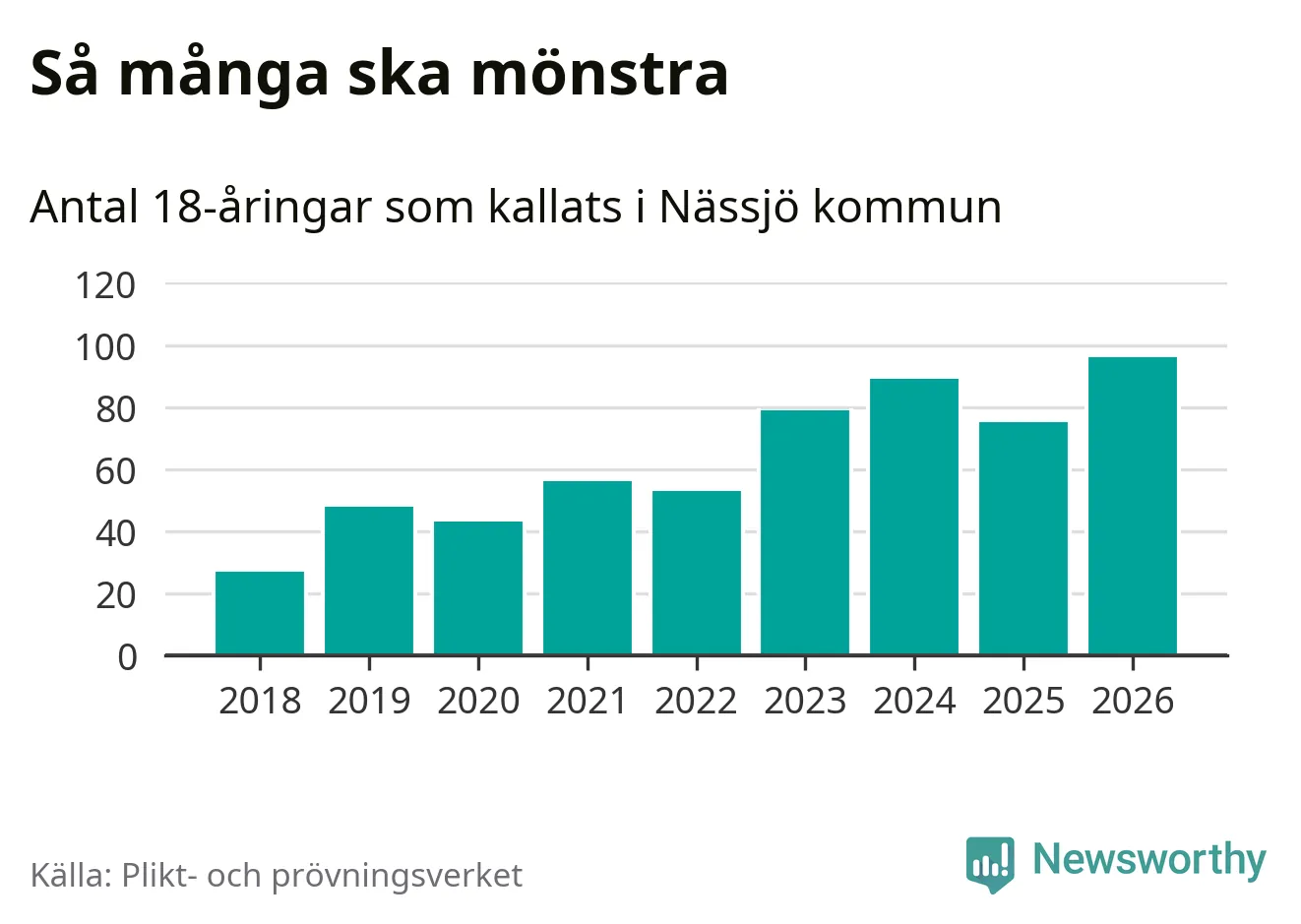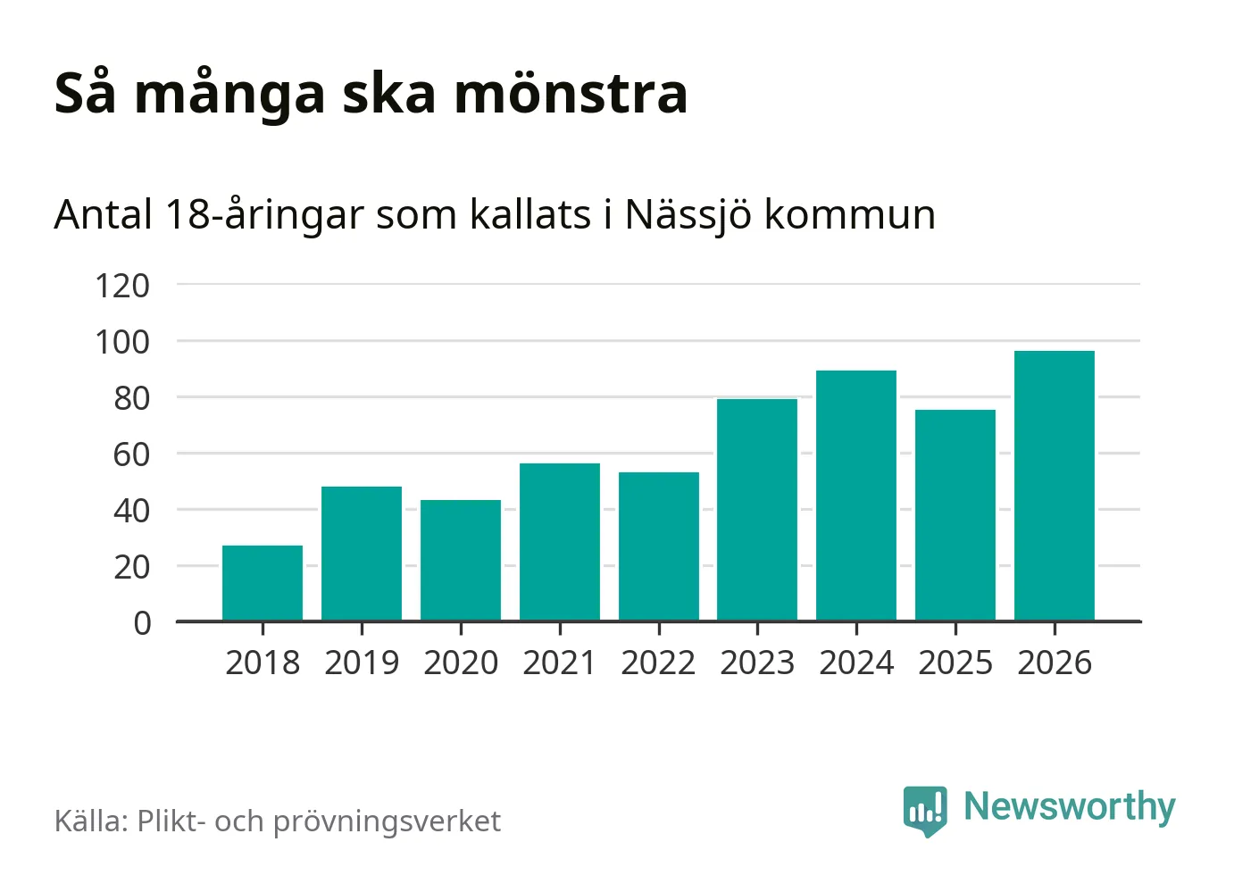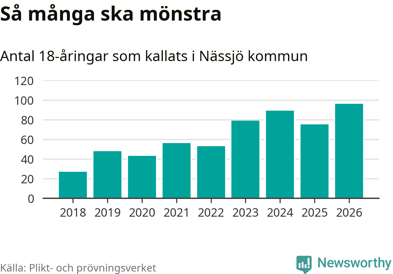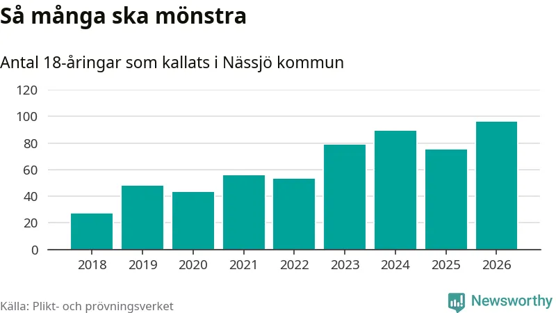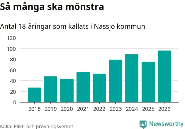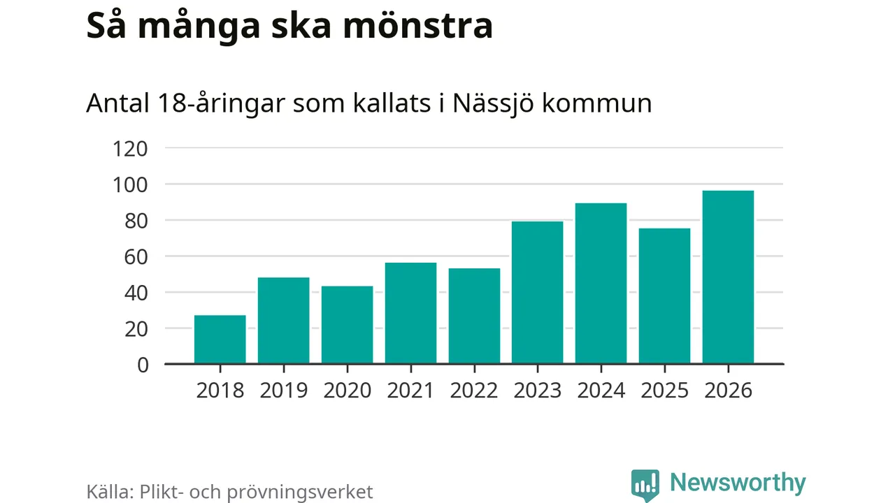 96 personer är det högsta antalet kallade i Nässjö sedan 2018, som är första året med statistik på kommunnivå (värnplikten återinfördes 2017), och 21 mönstrande fler än 2025. Totalt från Jönköpings län kallas 1 124 personer i år.