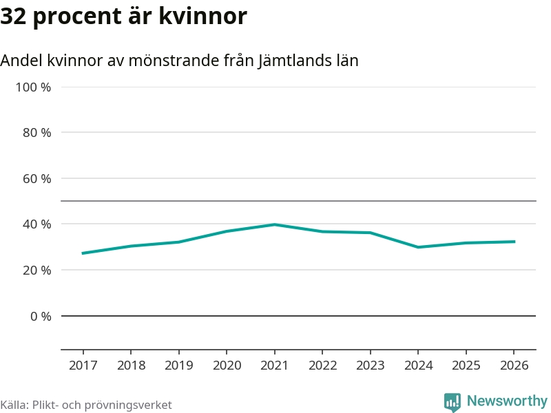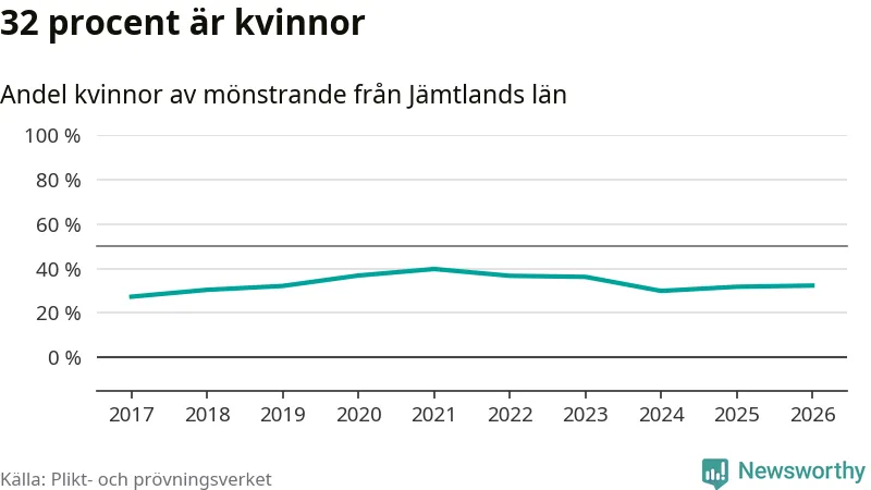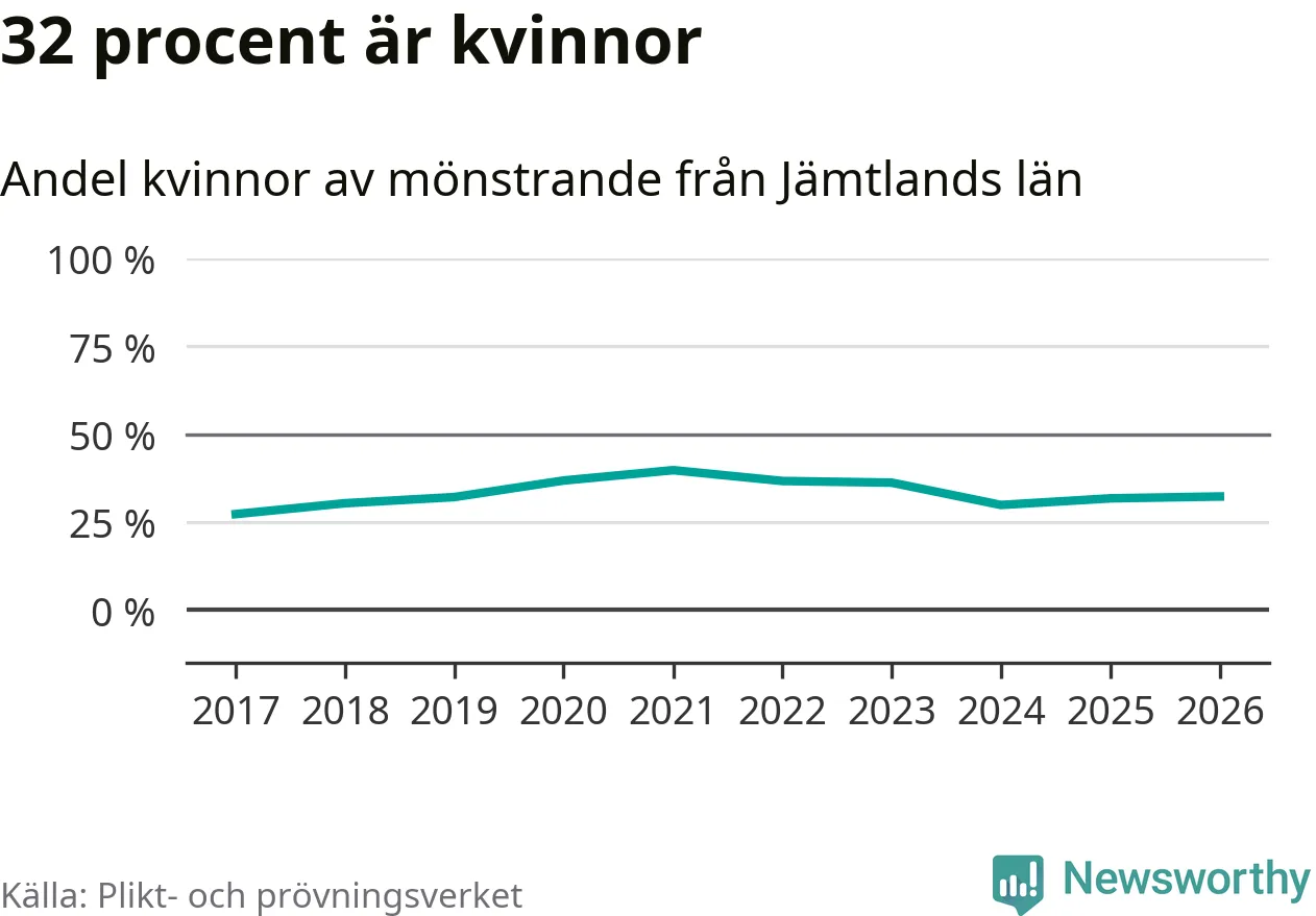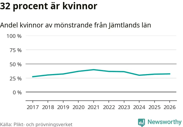 174 av de som kallats till mönstring från Jämtland är kvinnor, vilket motsvarar 32 procent av de mönstrande. I absoluta tal är det fler kvinnor än något år sedan värnplikten återinfördes, men 2021 var en större andel av de mönstrande från länet kvinnor (40 procent). I riket som helhet är 28 procent av de mönstrande tjejer.