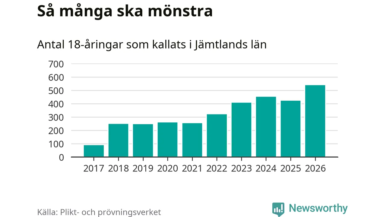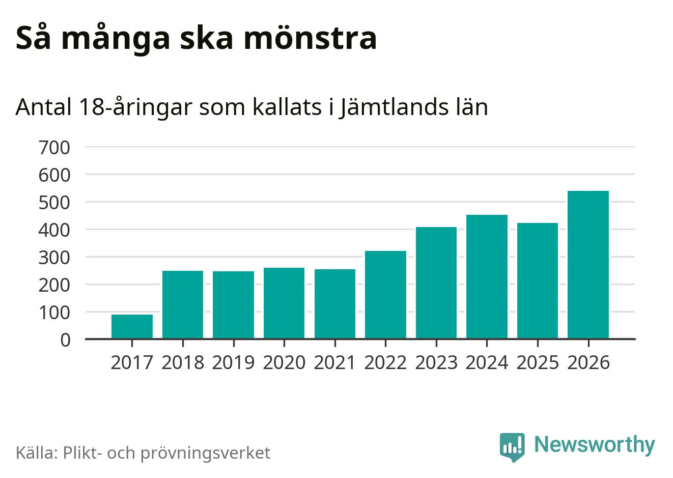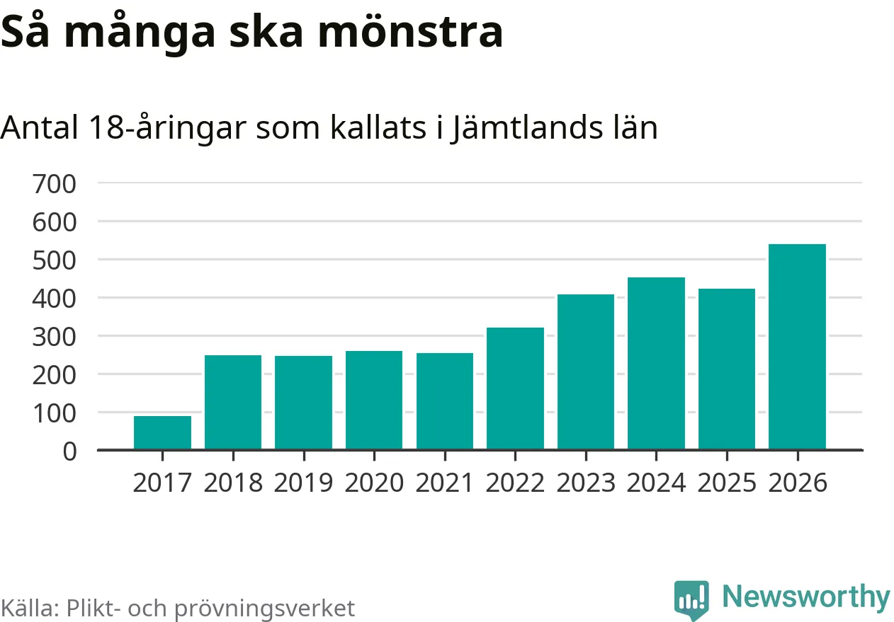 539 personer är det högsta antalet kallade i Jämtland sedan värnplikten återinfördes 2017 och 117 mönstrande fler än 2025.
