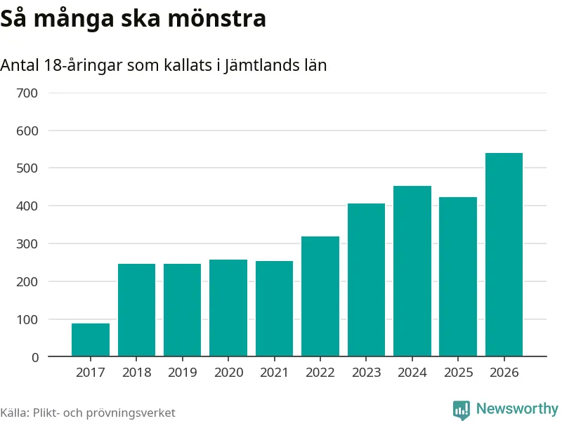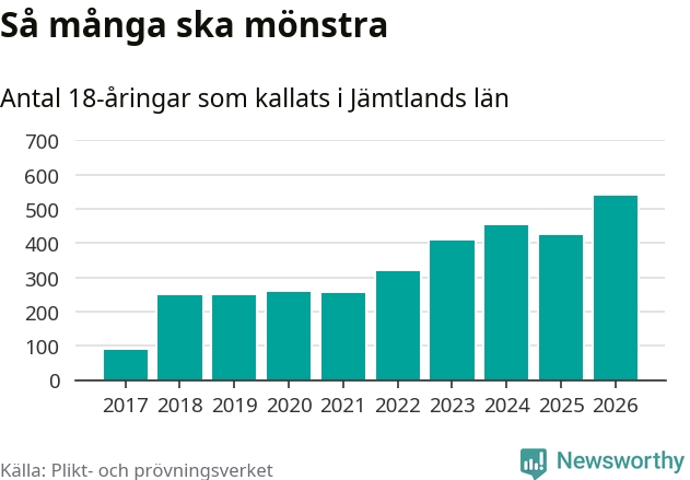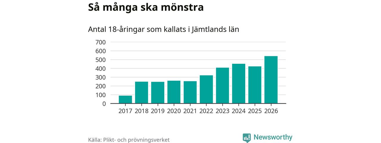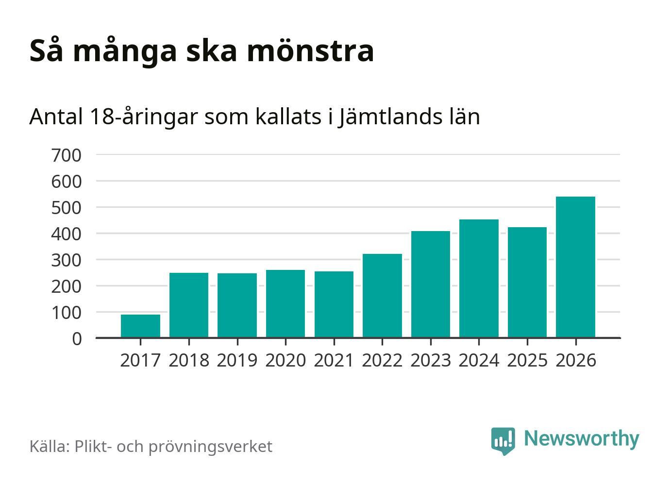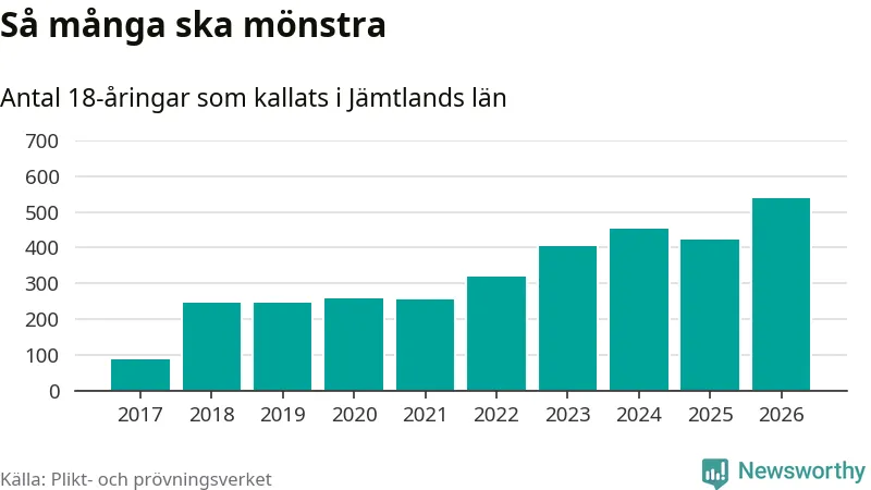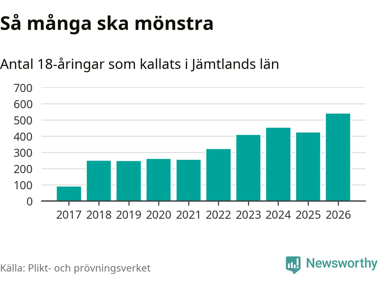 539 personer är det högsta antalet kallade i Jämtland sedan värnplikten återinfördes 2017 och 117 mönstrande fler än 2025.