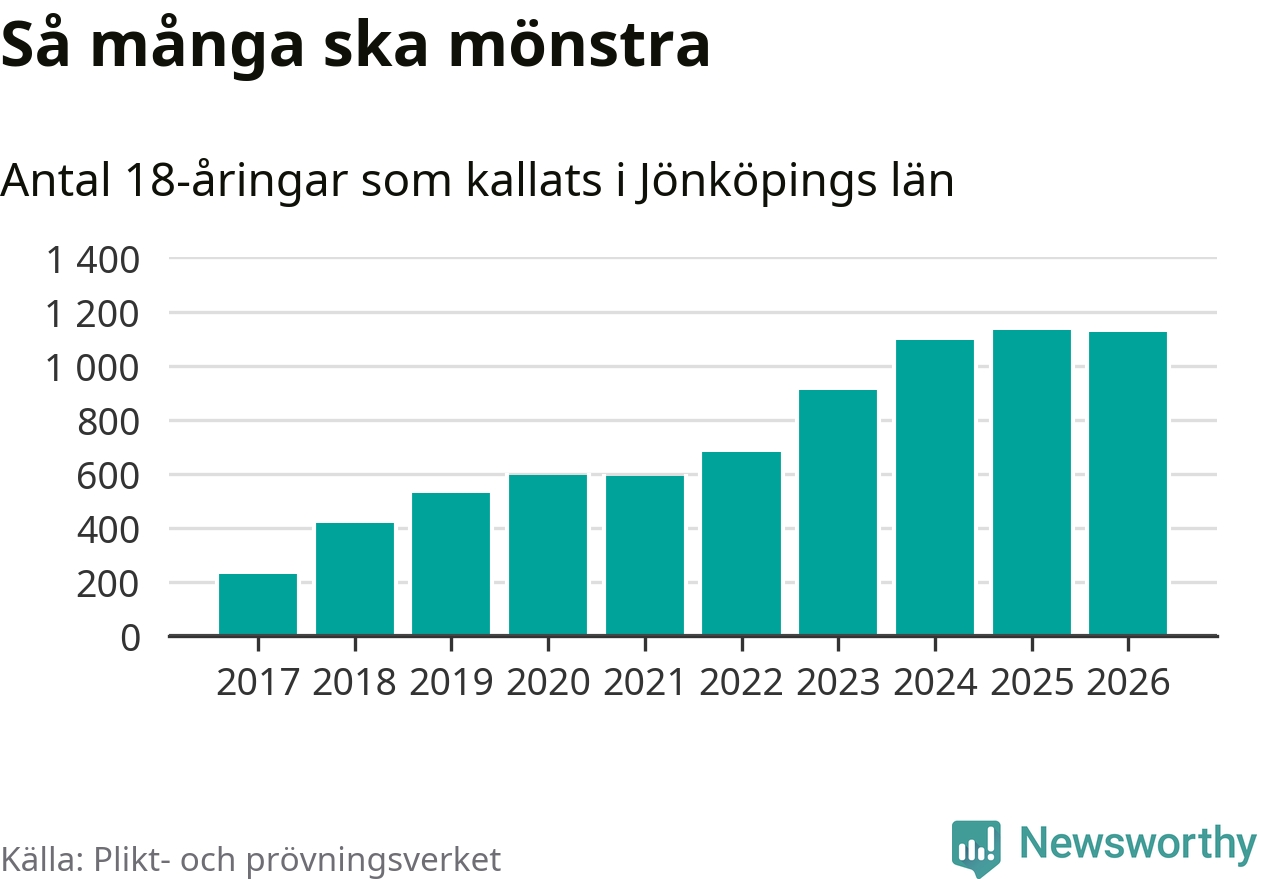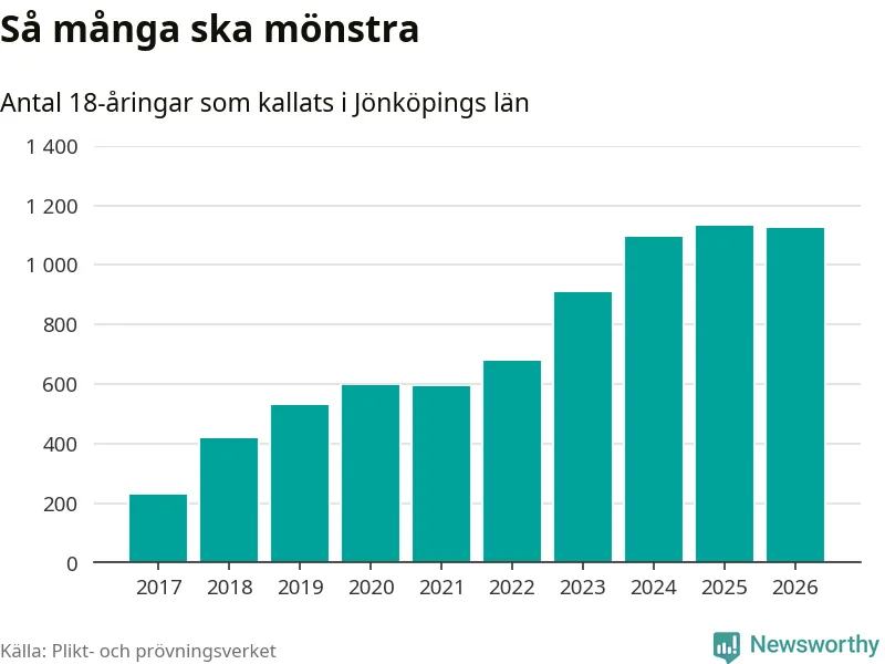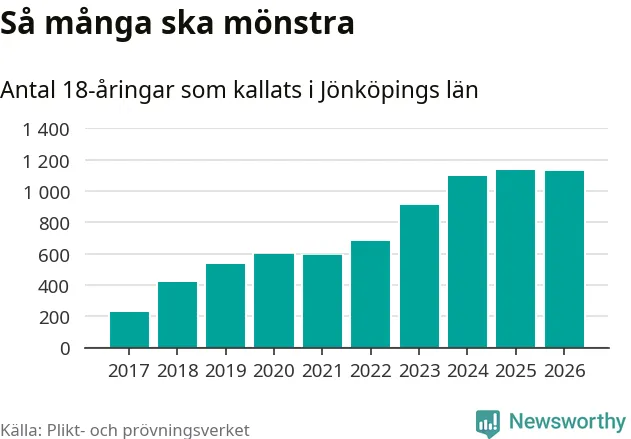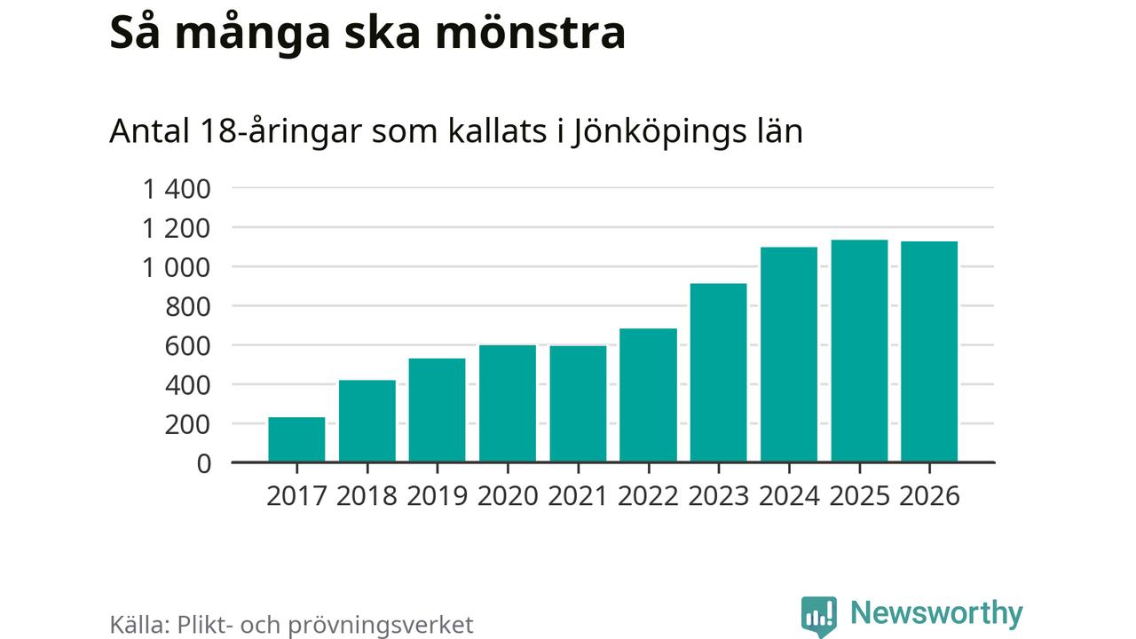 Nu kallas omkring 30 000 svenskar födda 2008 till mönstring. Och 1 124 av dem kommer från Jönköpings län, enligt ny statistik från Plikt- och prövningsverket. Det innebär att nästan var fjärde invånare i åldersgruppen i länet kallas till mönstring. Även i riket som helhet kallas nästan var fjärde person i årskullen.