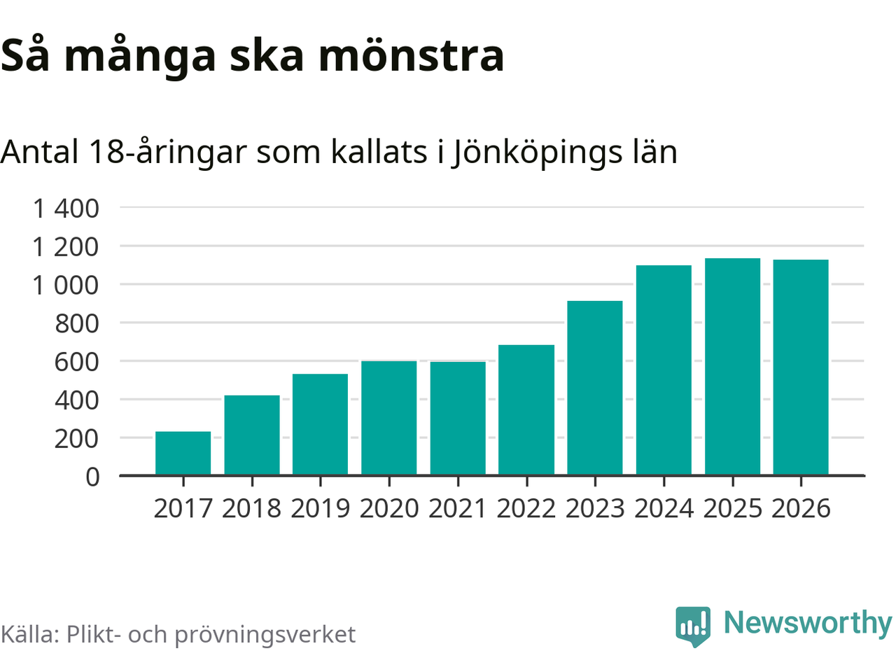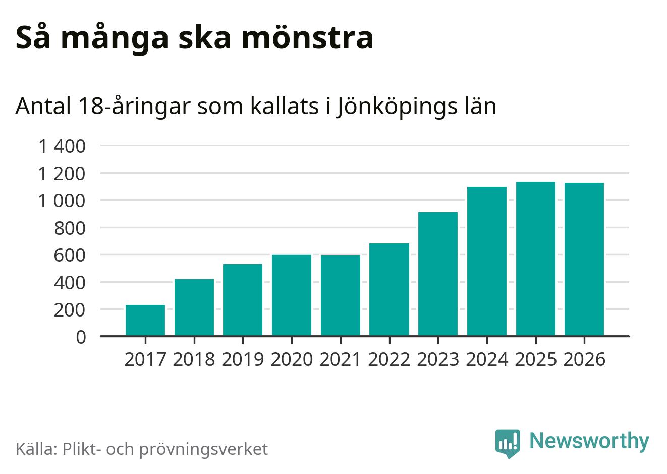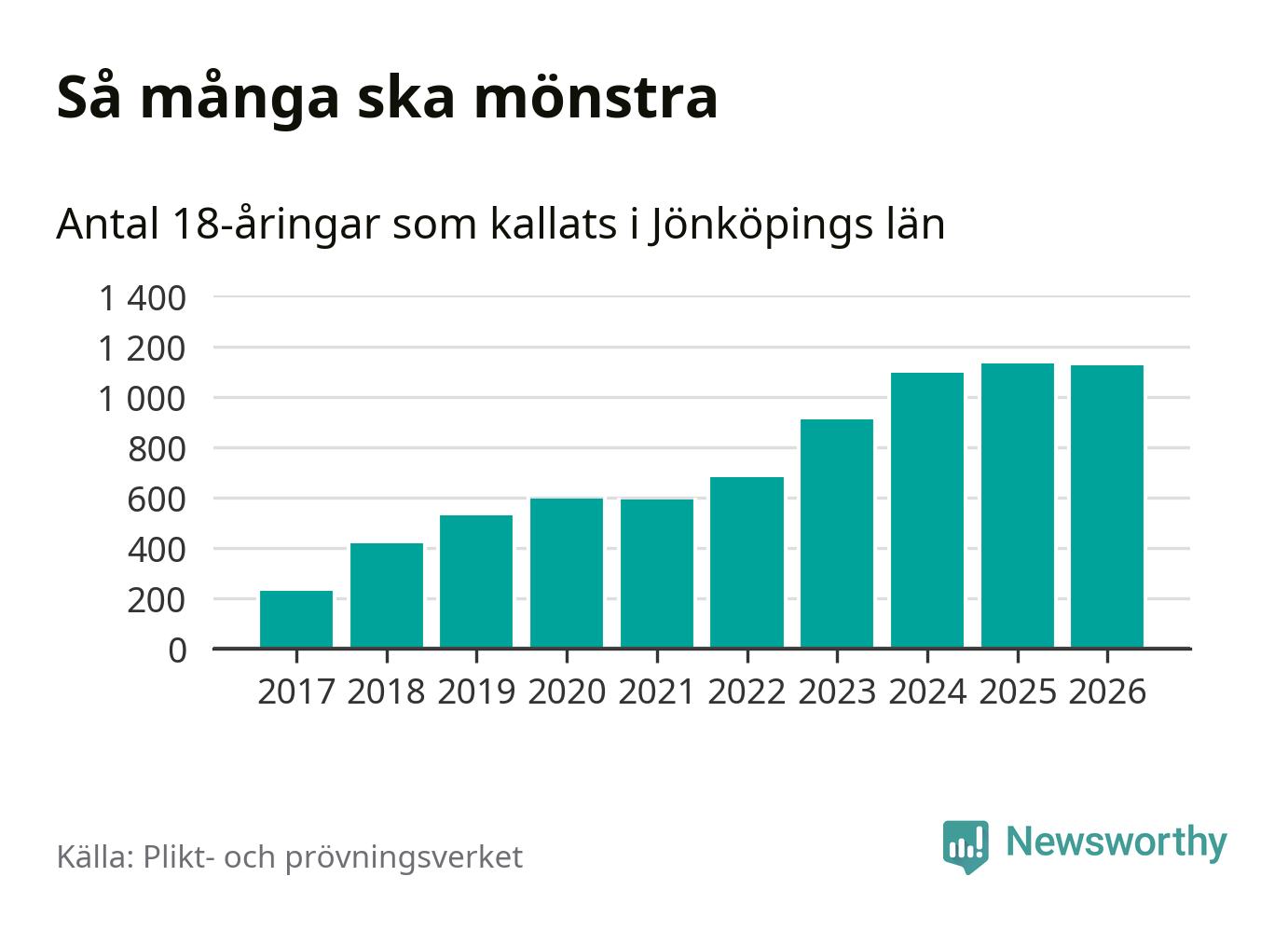 Nu kallas omkring 30 000 svenskar födda 2008 till mönstring. Och 1 124 av dem kommer från Jönköpings län, enligt ny statistik från Plikt- och prövningsverket. Det innebär att nästan var fjärde invånare i åldersgruppen i länet kallas till mönstring. Även i riket som helhet kallas nästan var fjärde person i årskullen.