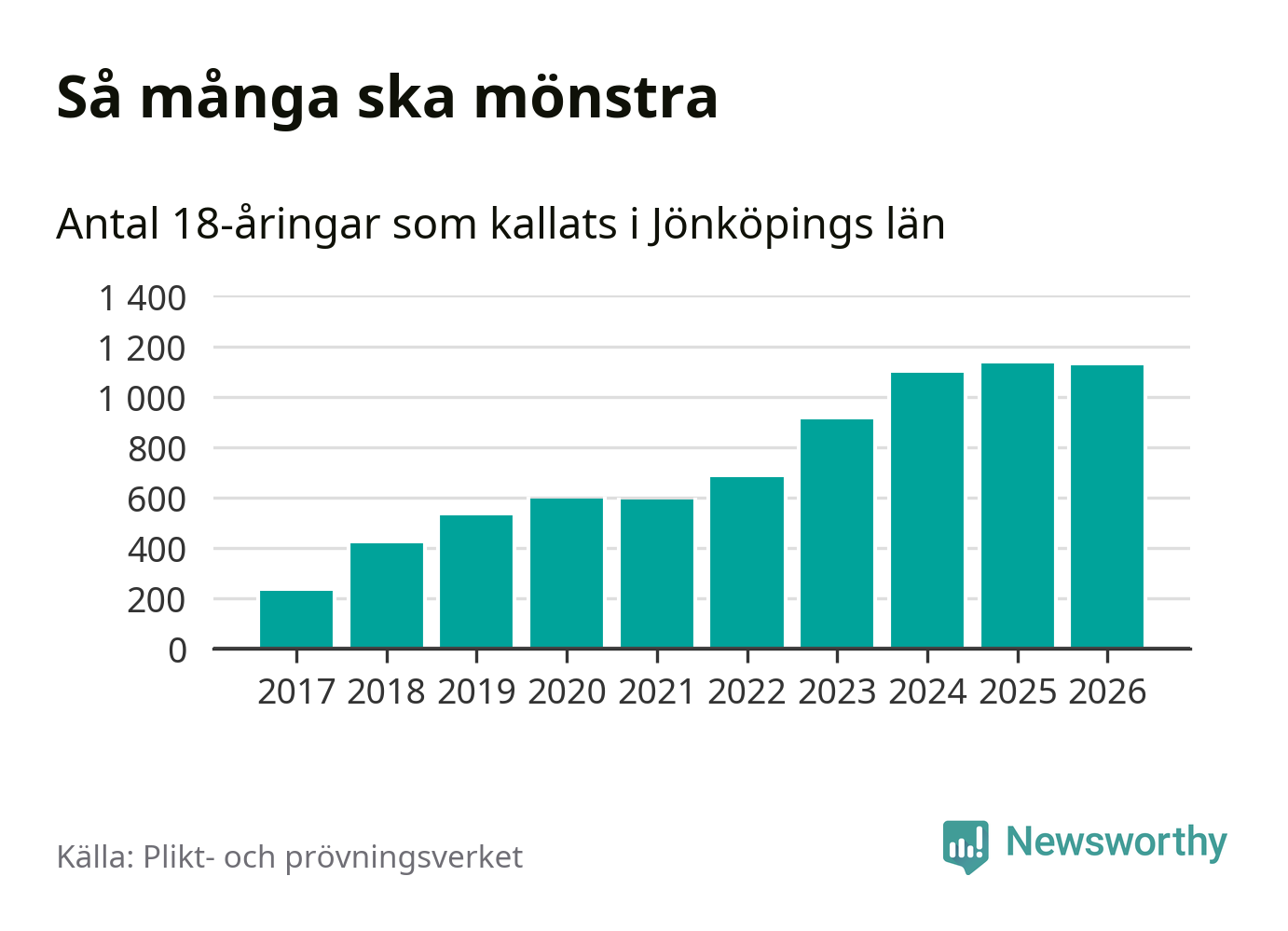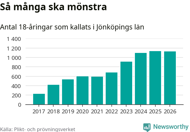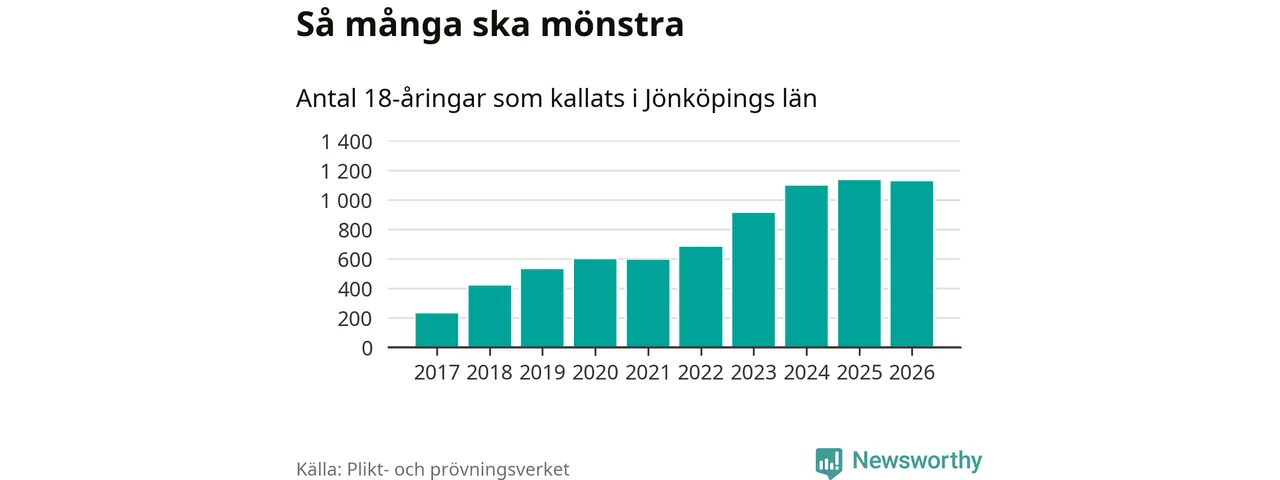 Av de som skrivits in till någon av Försvarmaktens grundutbildningar förra året, 2025, kommer 290 (246 män och 44 kvinnor) från Jönköpings län. 266 av dessa antogs efter att ha kallats till mönstring.