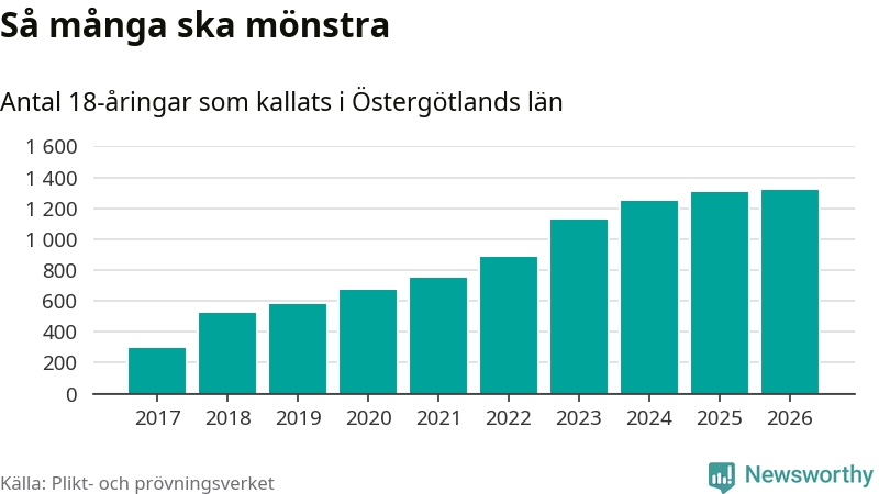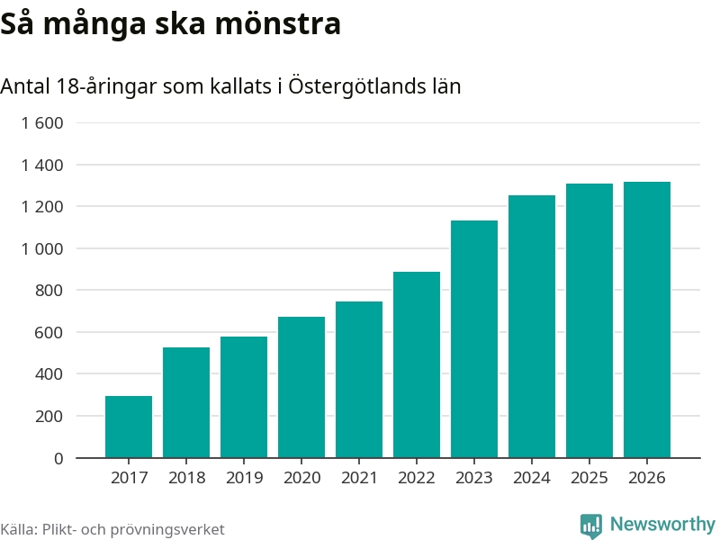 Nu kallas omkring 30 000 svenskar födda 2008 till mönstring. Och 1 318 av dem kommer från Östergötland, enligt ny statistik från Plikt- och prövningsverket. Det innebär att nästan var fjärde invånare i åldersgruppen i länet kallas till mönstring. Även i riket som helhet kallas nästan var fjärde person i årskullen.