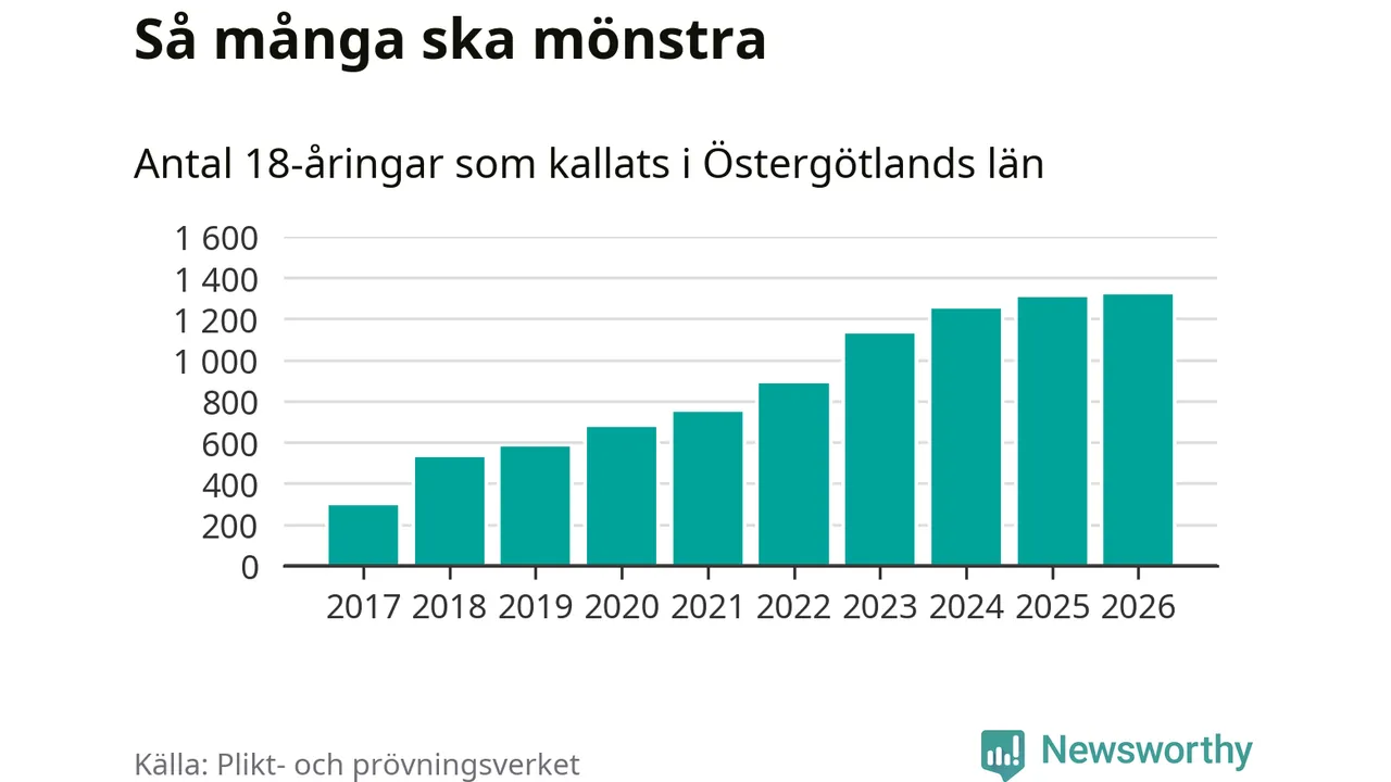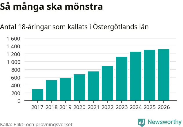 Antalet kallade i Östergötland har ökat varje år sedan värnplikten återinfördes 2017 och jämfört med 2025 är det tolv fler i år.