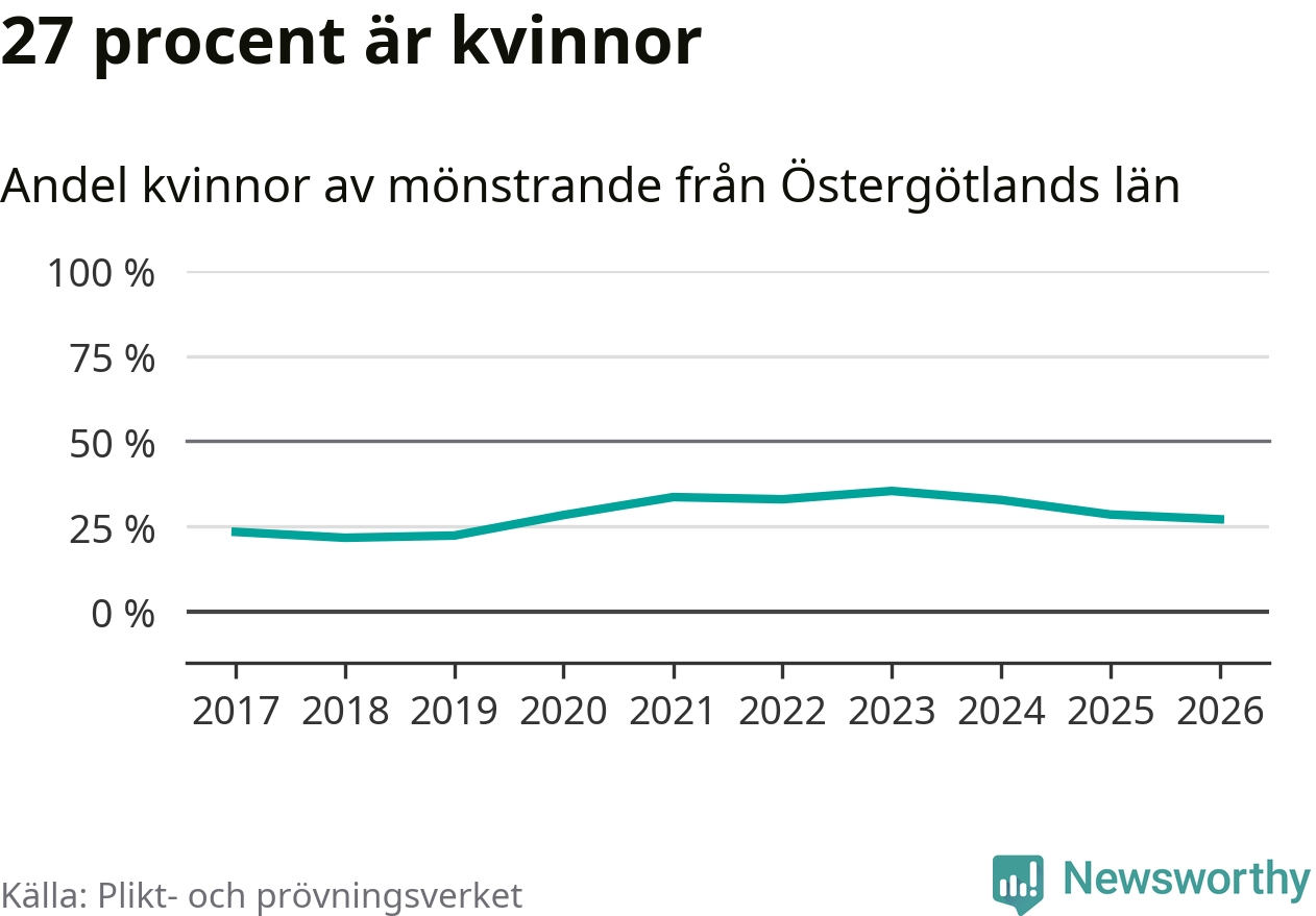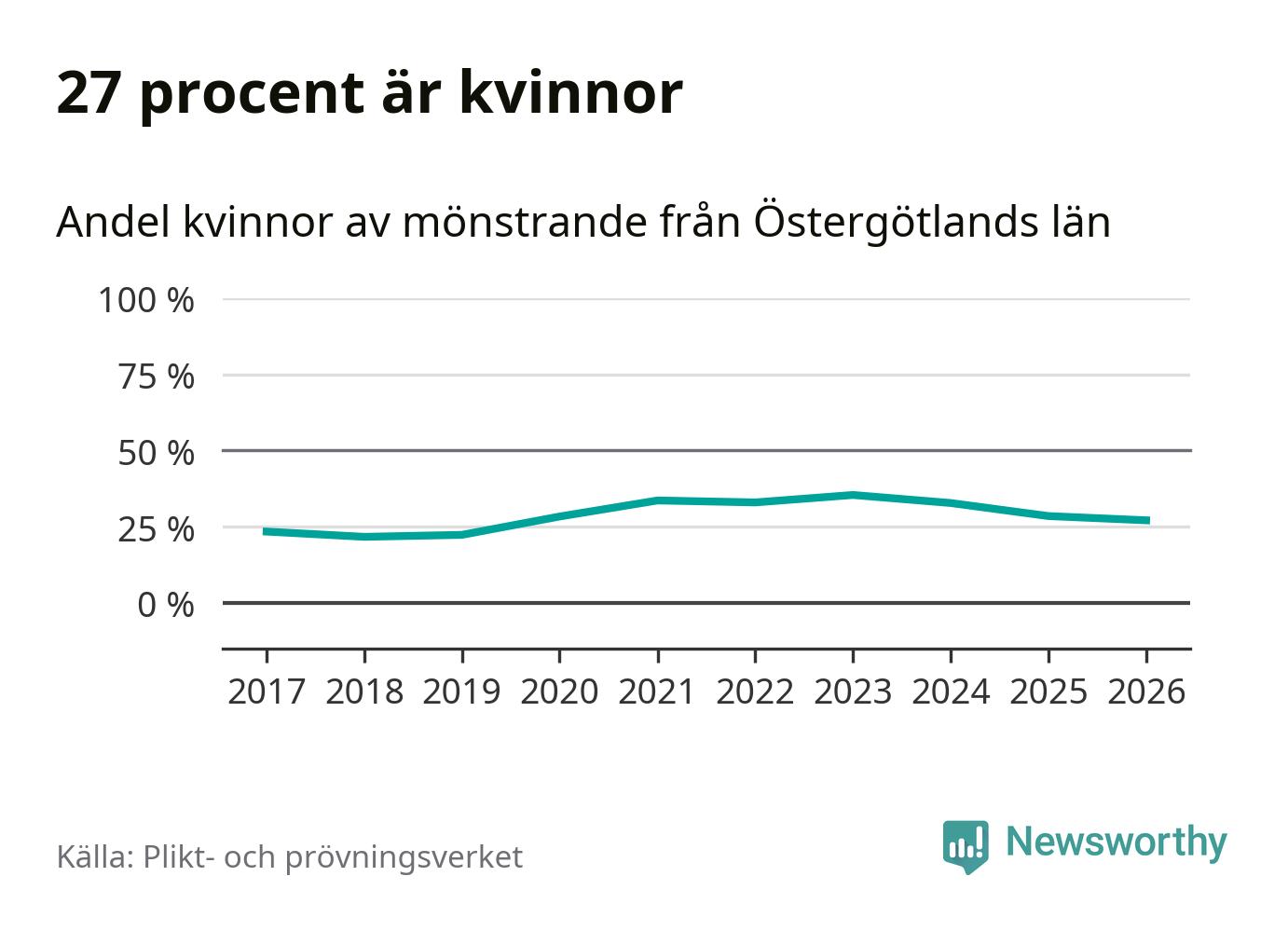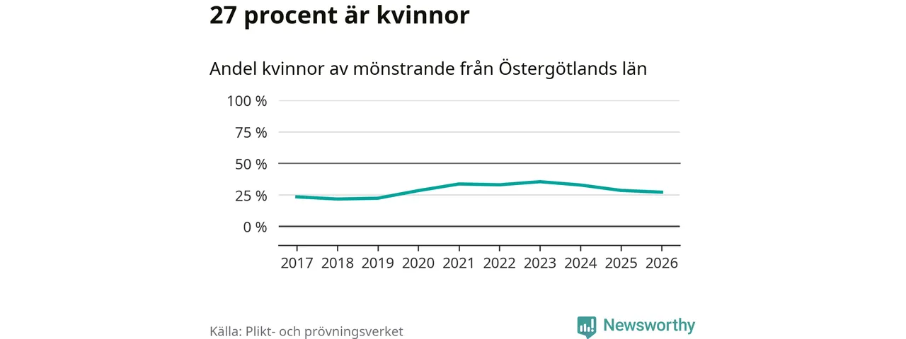 357 av de som kallats till mönstring från Östergötland är kvinnor, vilket motsvarar 27 procent av de mönstrande. Som mest har 410 kvinnor kallats från länet (2024). I riket som helhet är 28 procent av de mönstrande tjejer.