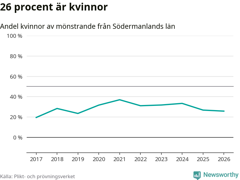 213 av de som kallats till mönstring från Södermanland är kvinnor, vilket motsvarar 26 procent av de mönstrande. Som mest har 273 kvinnor kallats från länet (2024). I riket som helhet är 28 procent av de mönstrande tjejer.