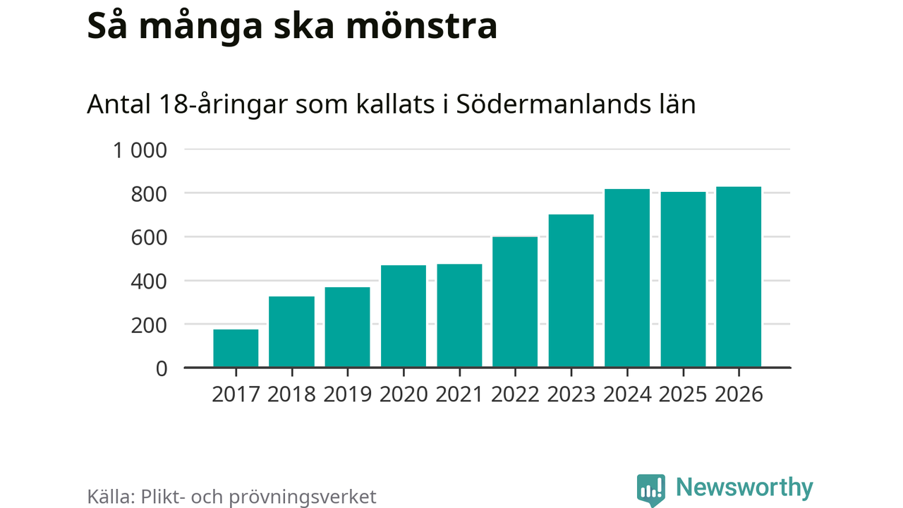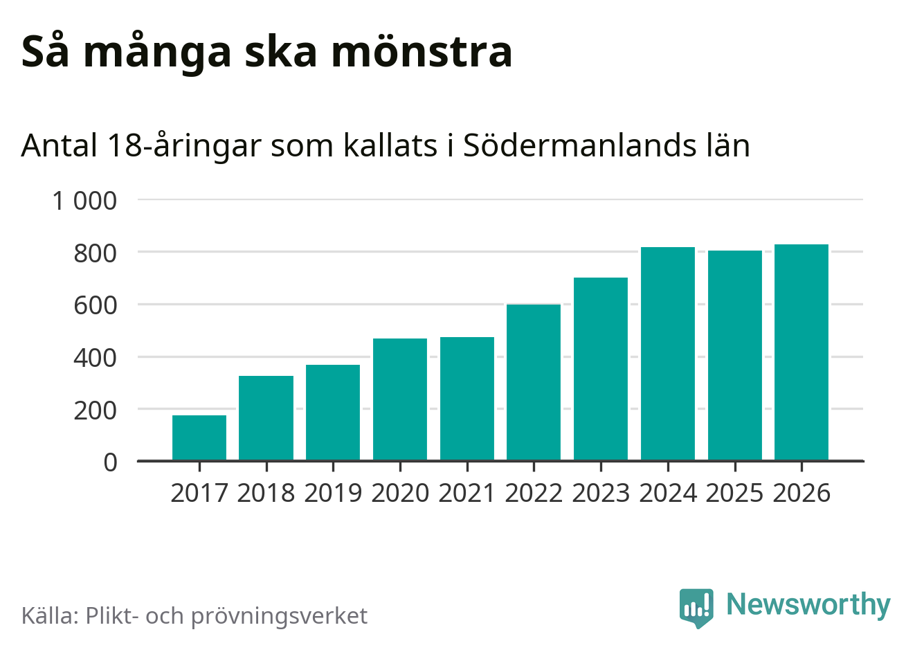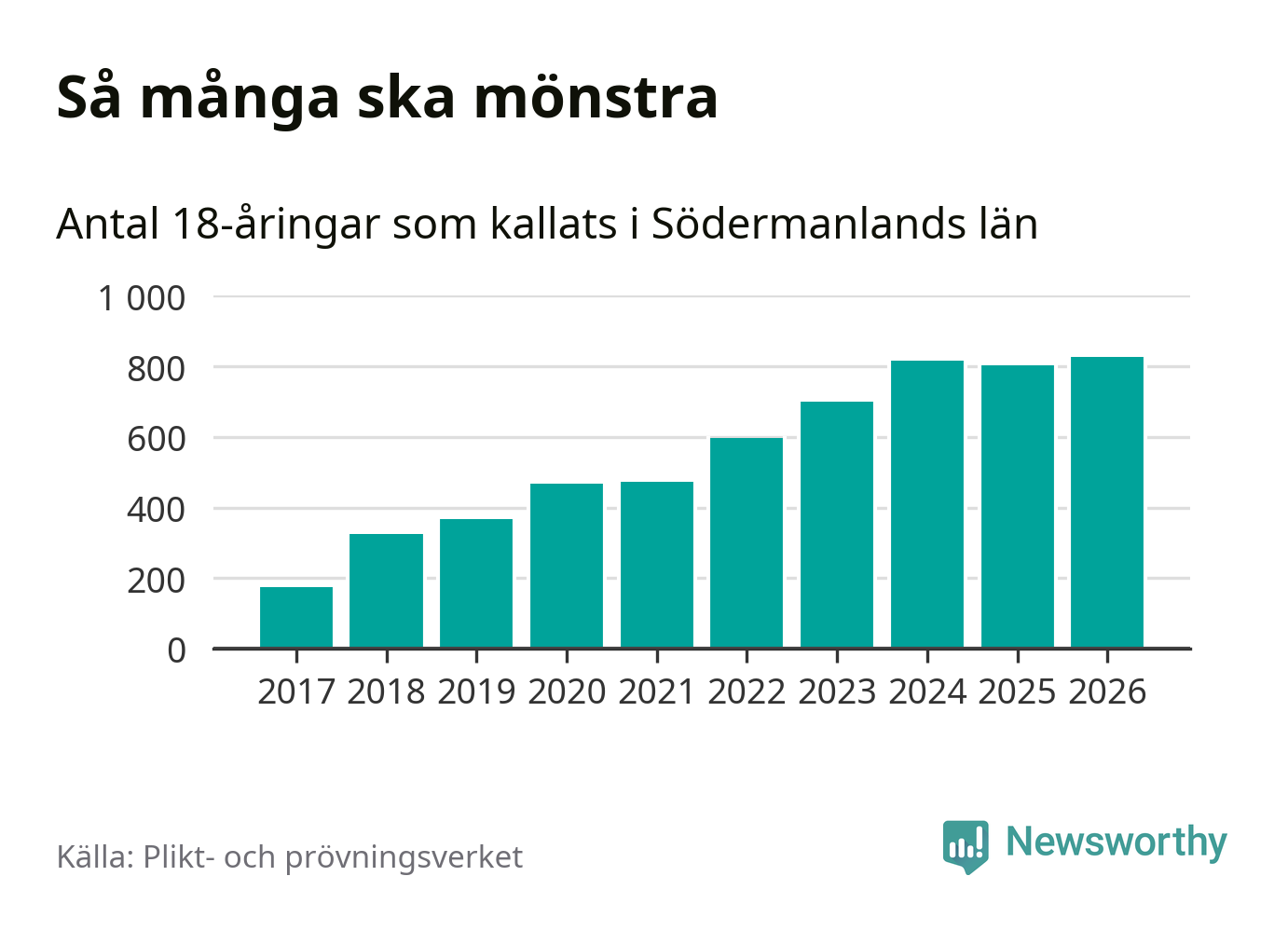 826 personer är det högsta antalet kallade i Södermanland sedan värnplikten återinfördes 2017 och 24 mönstrande fler än 2025.