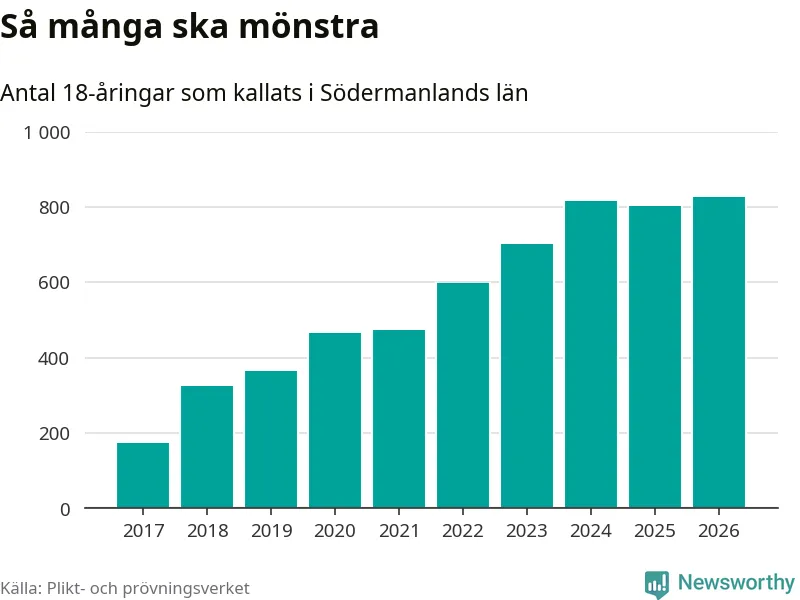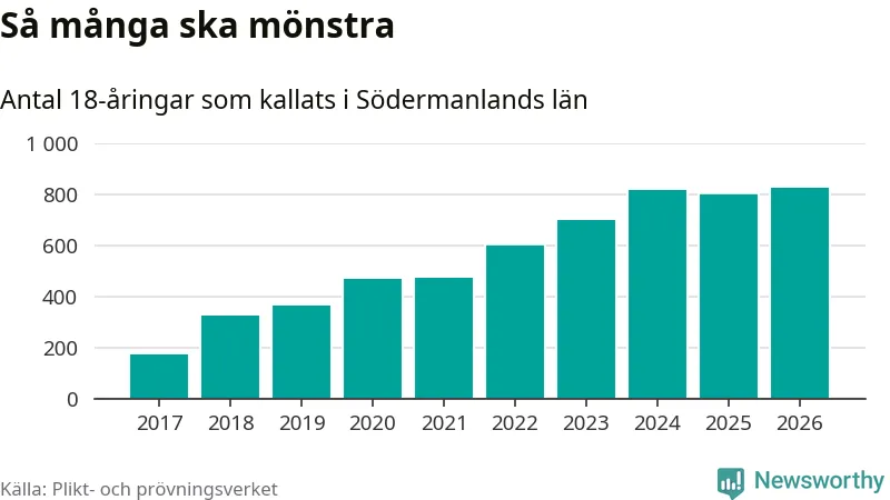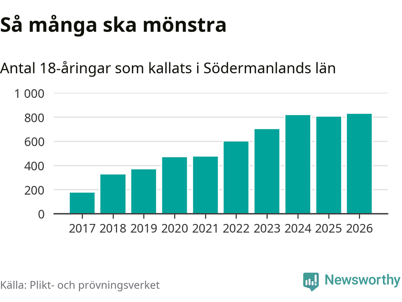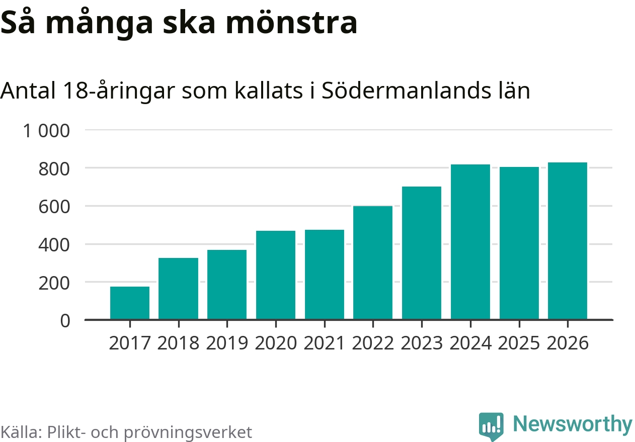 826 personer är det högsta antalet kallade i Södermanland sedan värnplikten återinfördes 2017 och 24 mönstrande fler än 2025.