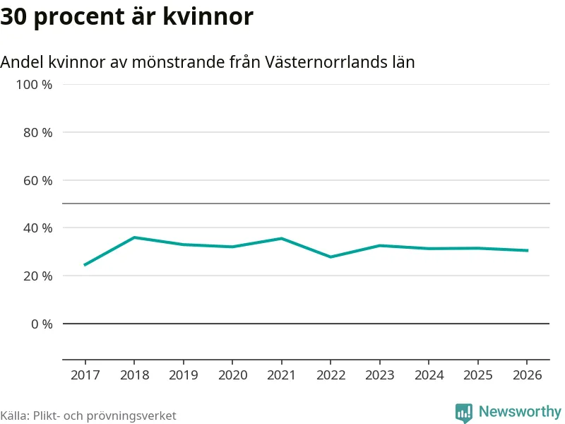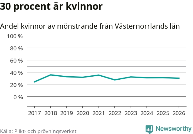 275 av de som kallats till mönstring från Västernorrland är kvinnor, vilket motsvarar 30 procent av de mönstrande. I absoluta tal är det fler kvinnor än något år sedan värnplikten återinfördes, men 2018 var en större andel av de mönstrande från länet kvinnor (36 procent). I riket som helhet är 28 procent av de mönstrande tjejer.