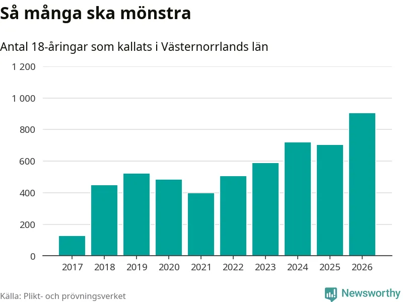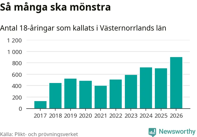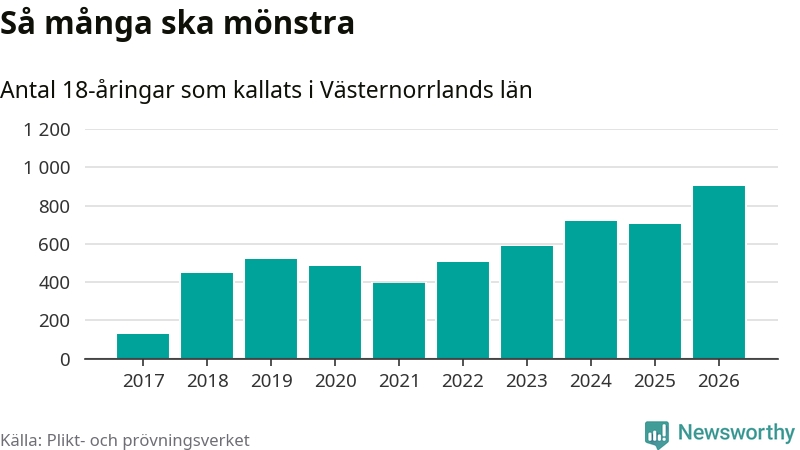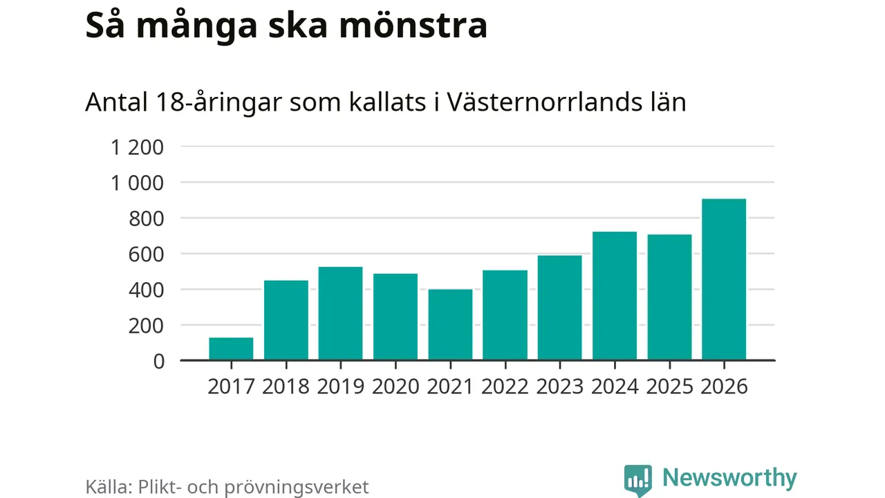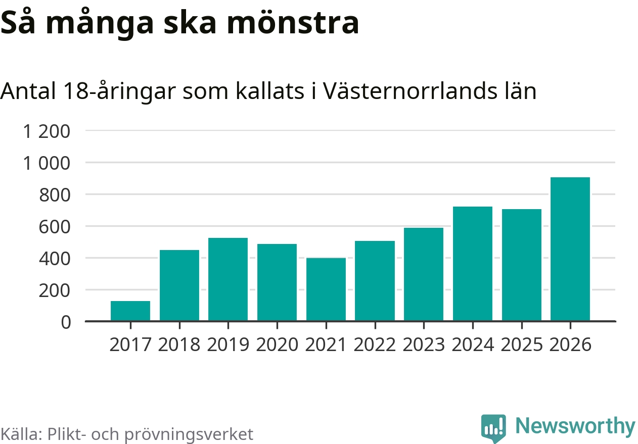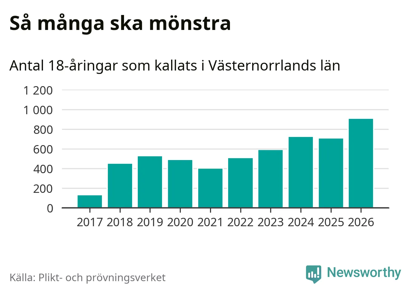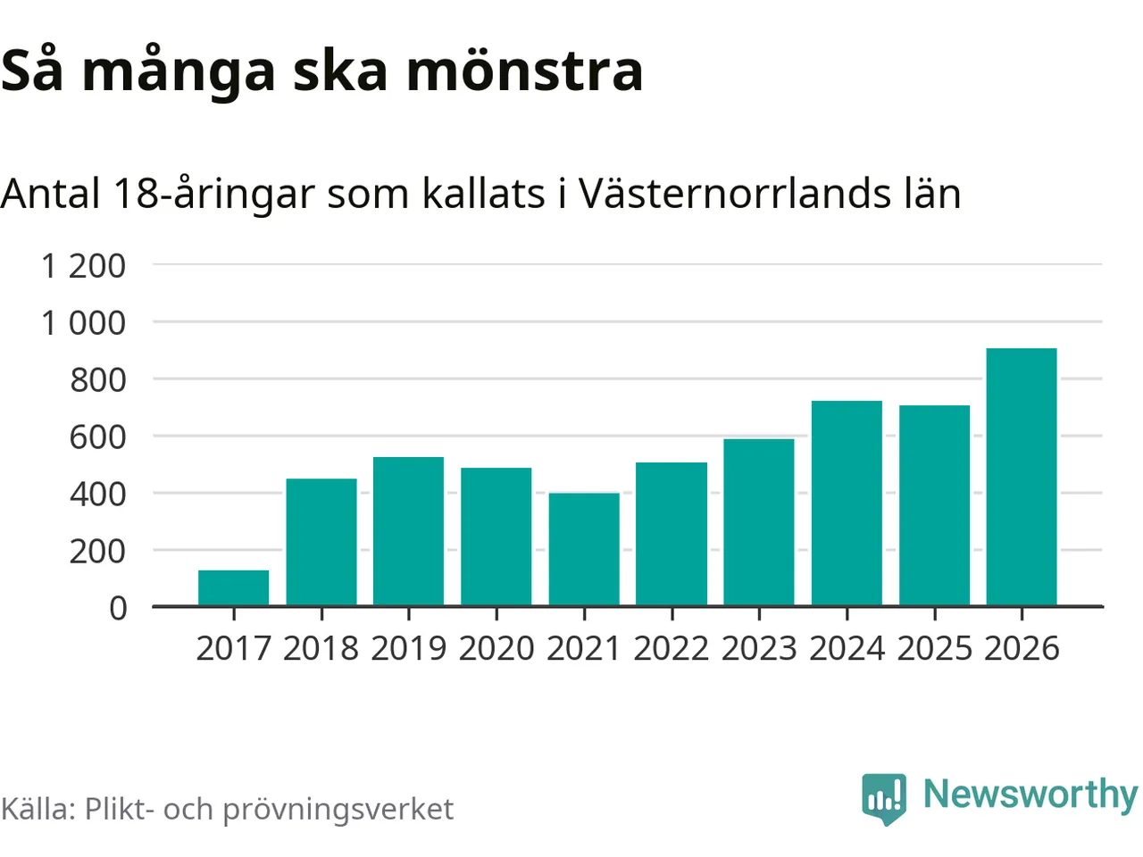 902 personer är det högsta antalet kallade i Västernorrland sedan värnplikten återinfördes 2017 och 199 mönstrande fler än 2025.