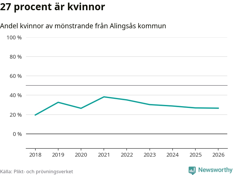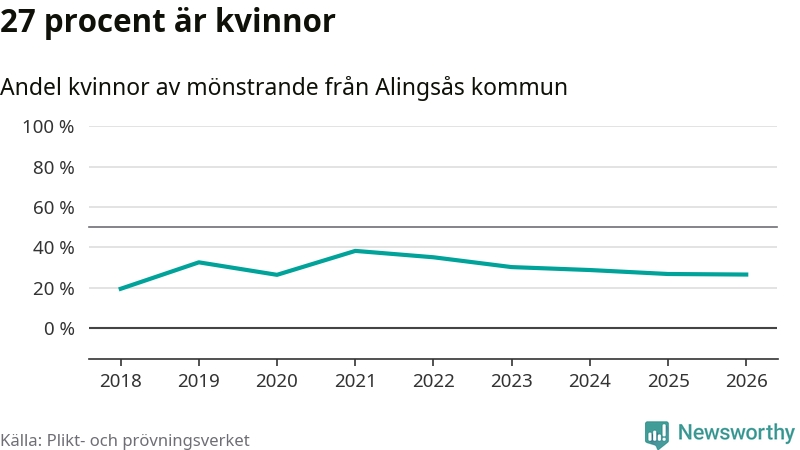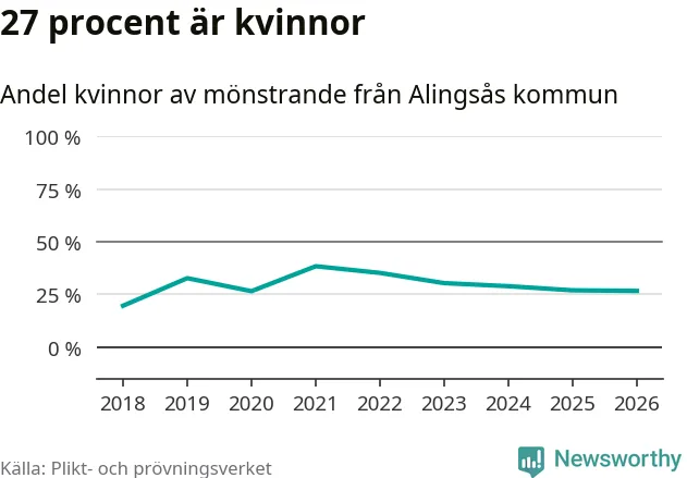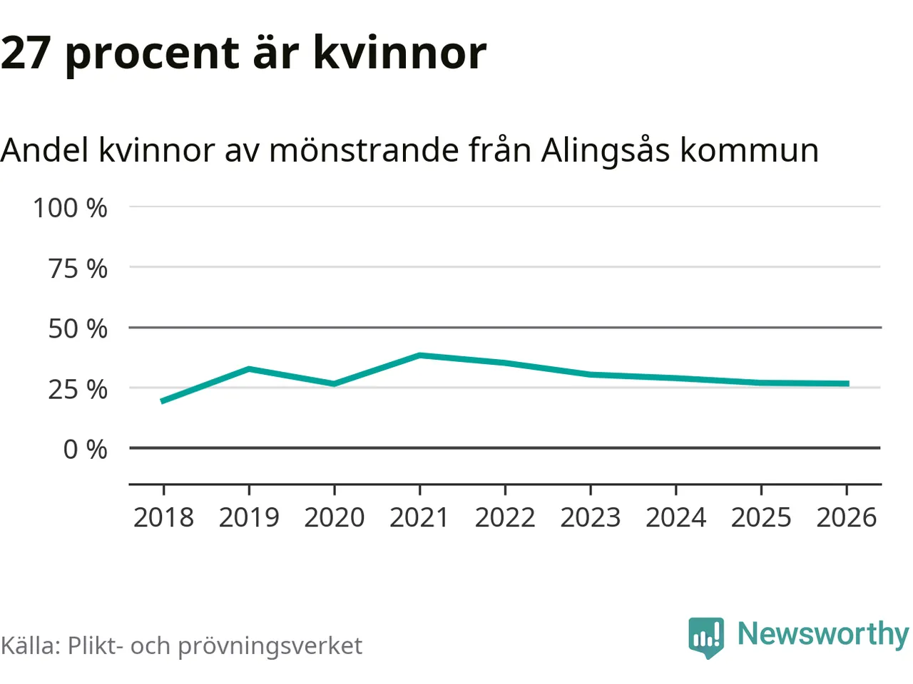 34 av de som kallats till mönstring från Alingsås är kvinnor, vilket motsvarar 27 procent av de mönstrande. Som mest har 36 kvinnor kallats från kommunen (2024 och 2023). I riket som helhet är 28 procent av de mönstrande tjejer.
