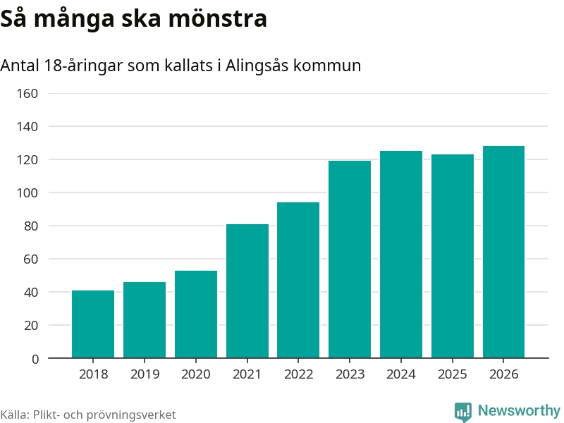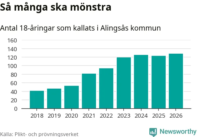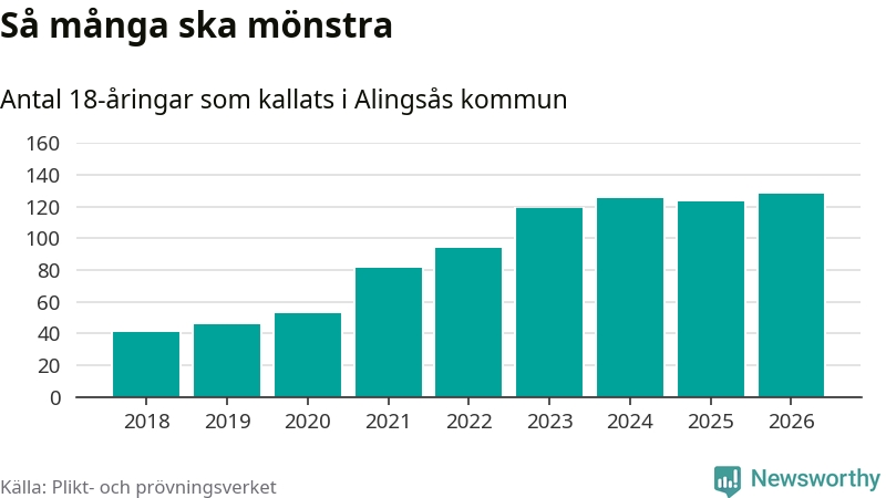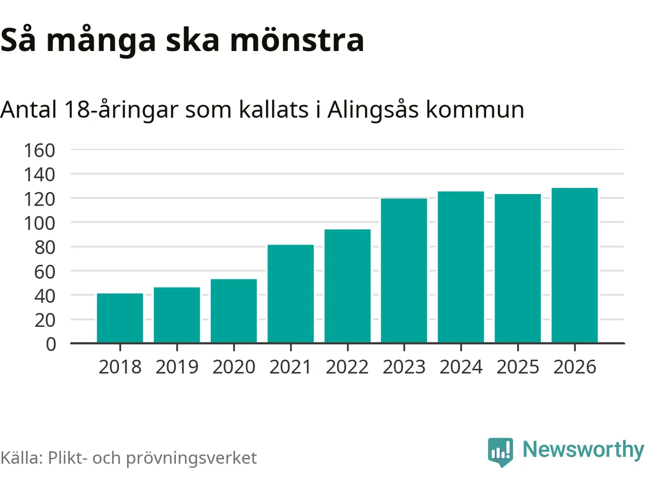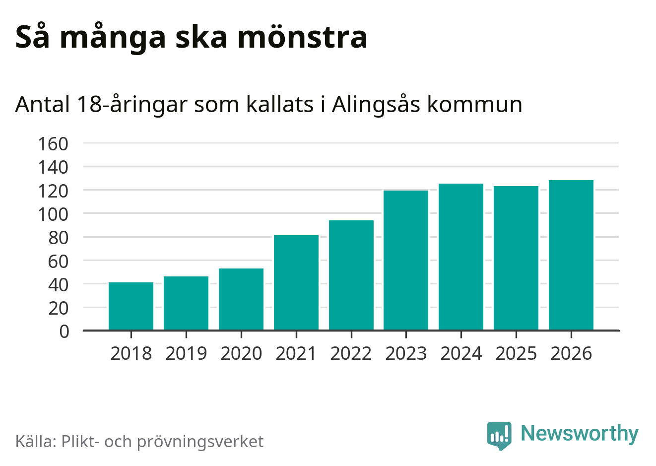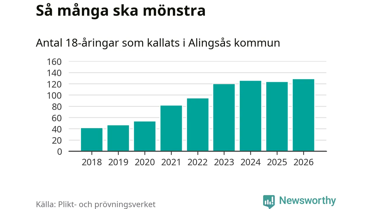 128 personer är det högsta antalet kallade i Alingsås sedan 2018, som är första året med statistik på kommunnivå (värnplikten återinfördes 2017), och fem mönstrande fler än 2025. Totalt från Västra Götalands län kallas 4 609 personer i år.