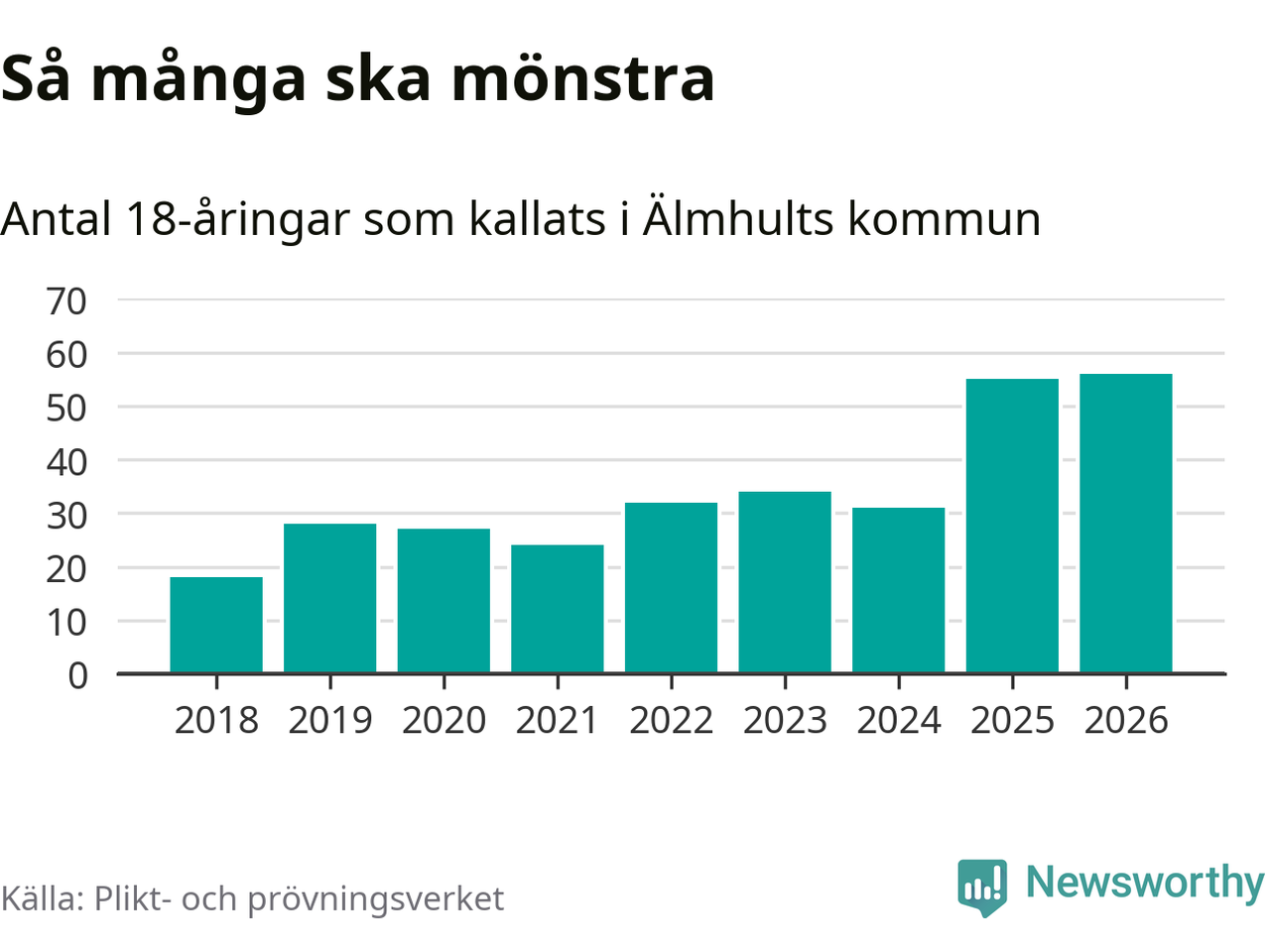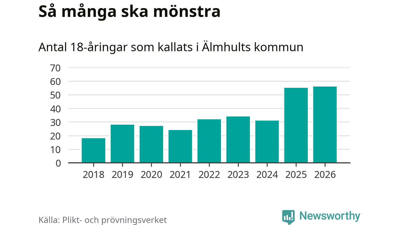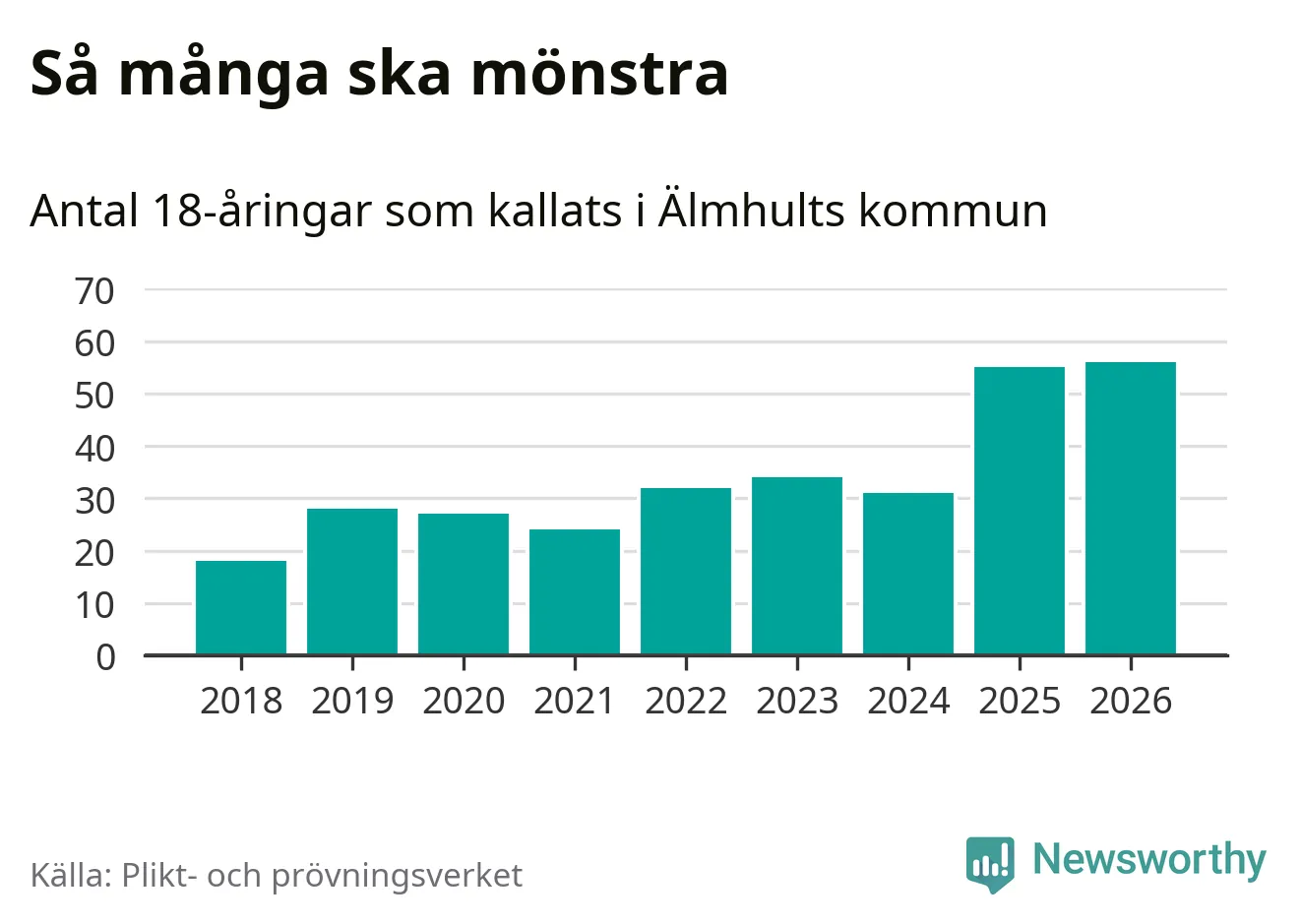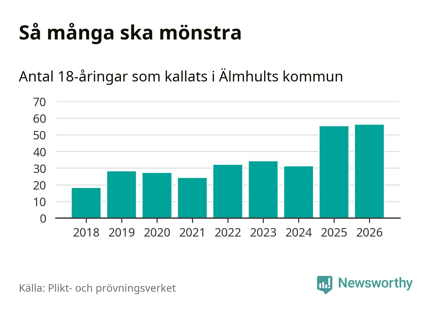 56 personer är det högsta antalet kallade i Älmhult sedan 2018, som är första året med statistik på kommunnivå (värnplikten återinfördes 2017), och en mönstrande fler än 2025. Totalt från Kronobergs län kallas 584 personer i år.