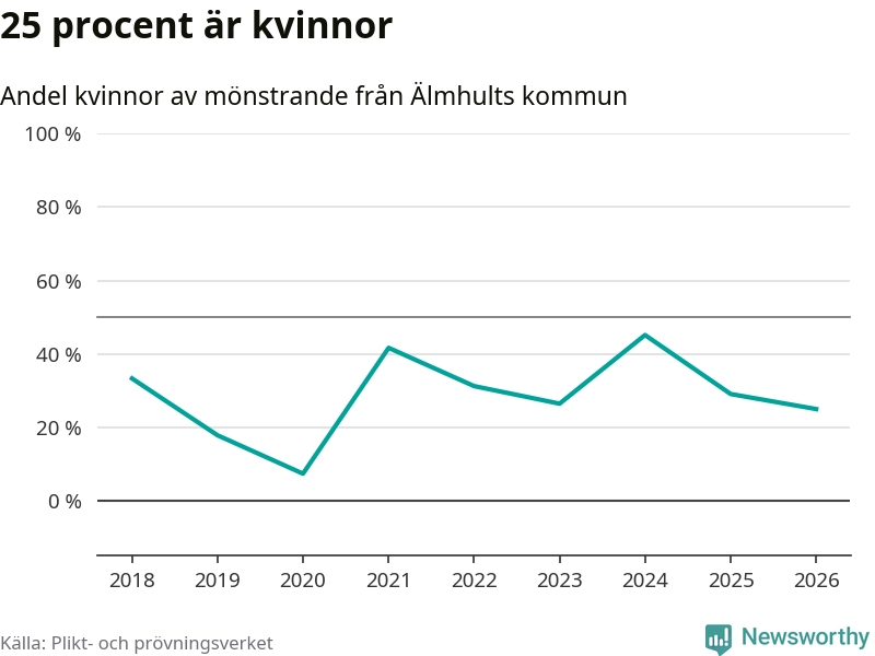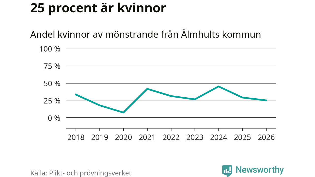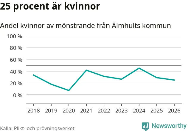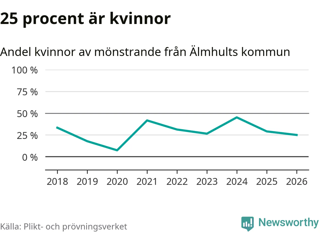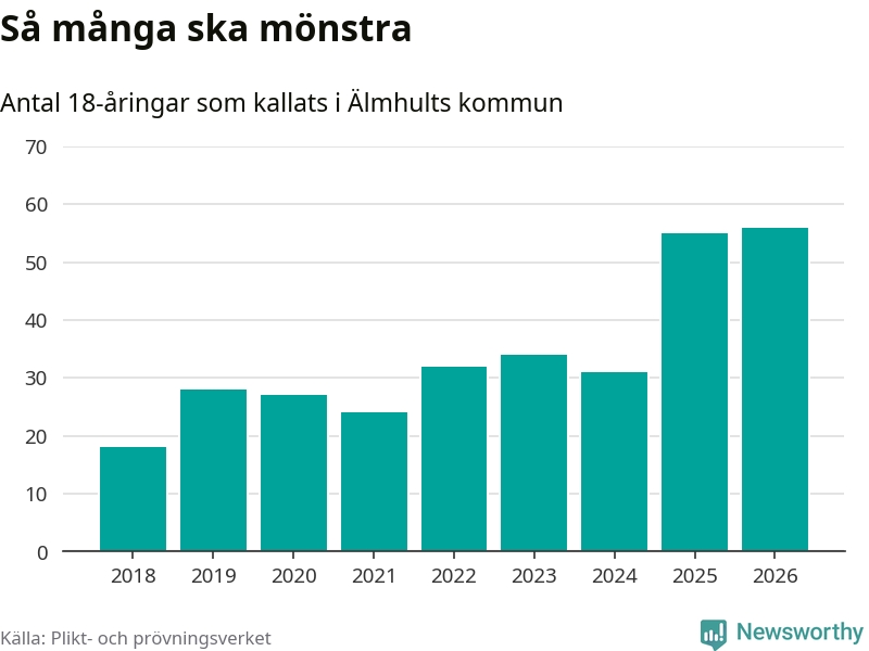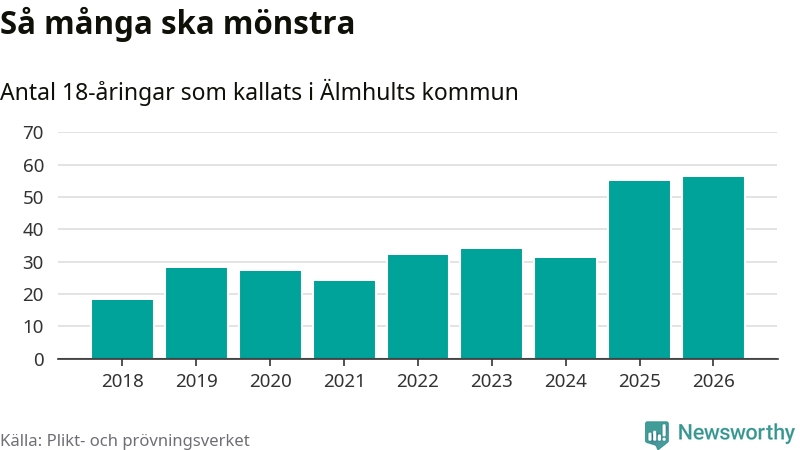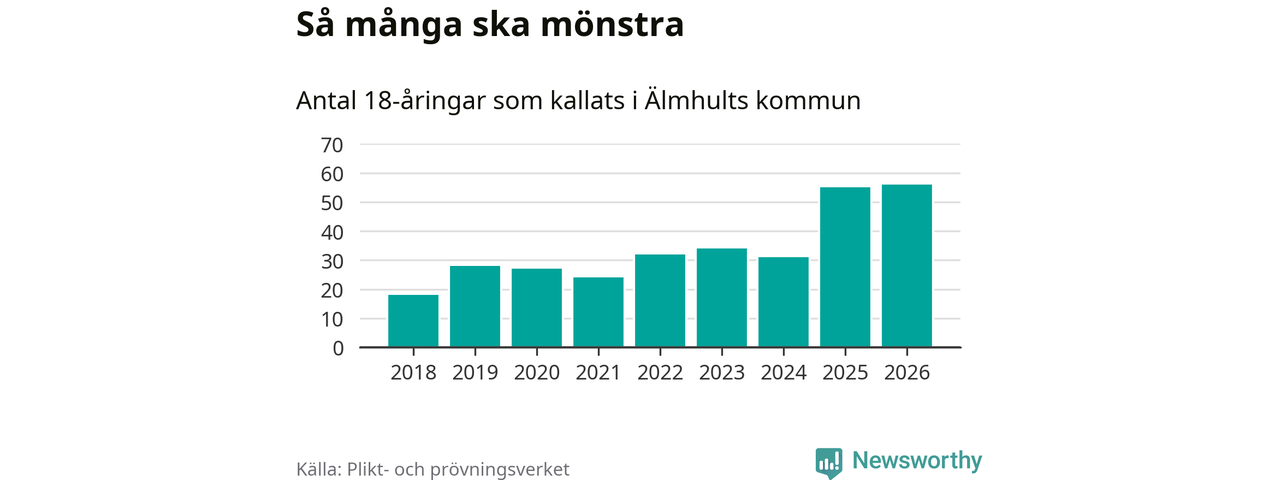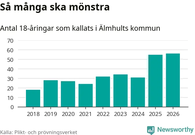 56 personer är det högsta antalet kallade i Älmhult sedan 2018, som är första året med statistik på kommunnivå (värnplikten återinfördes 2017), och en mönstrande fler än 2025. Totalt från Kronobergs län kallas 584 personer i år.