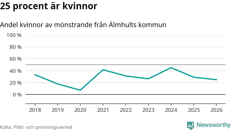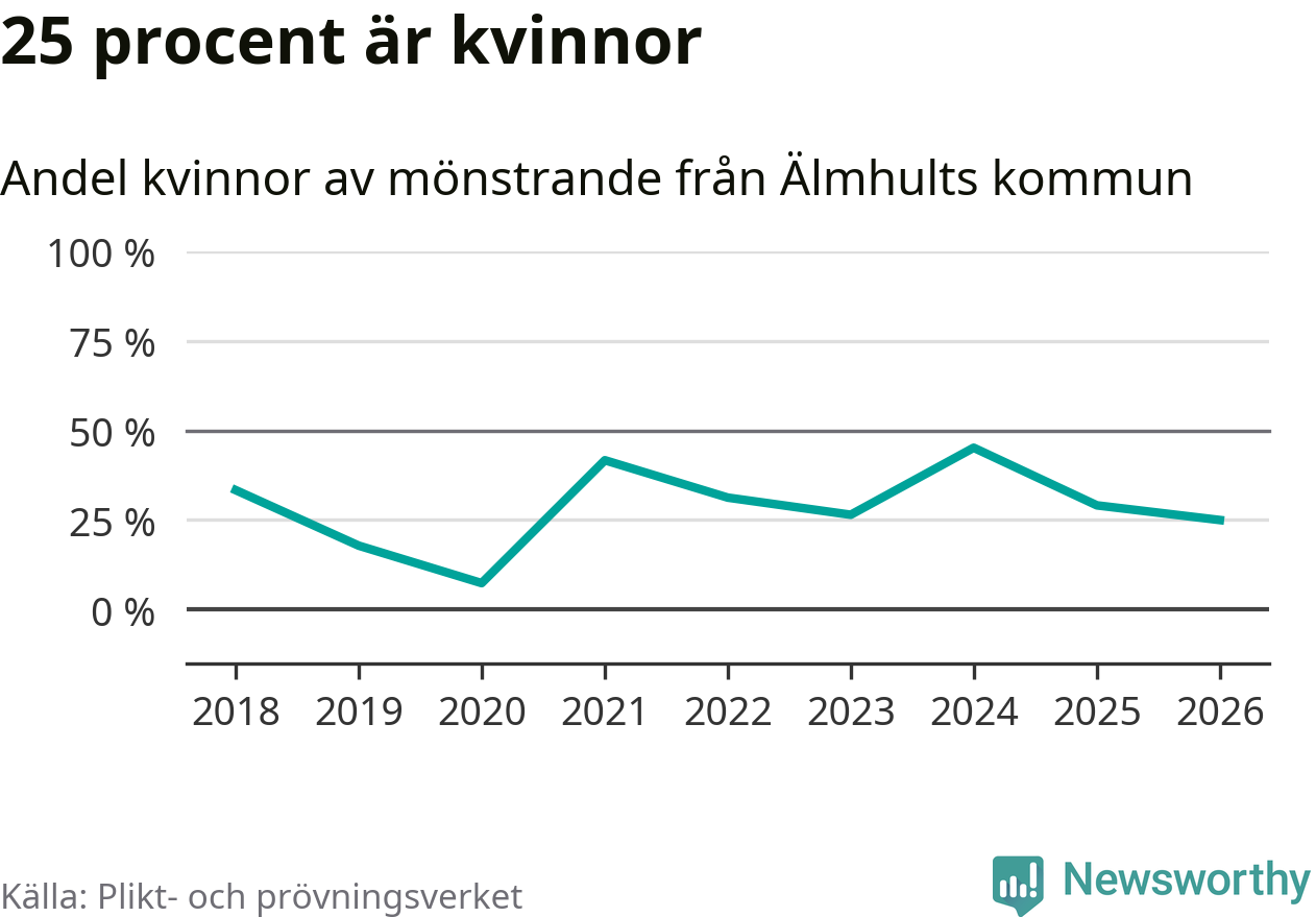 14 av de som kallats till mönstring från Älmhult är kvinnor, vilket motsvarar 25 procent av de mönstrande. Som mest har 16 kvinnor kallats från kommunen (2025). I riket som helhet är 28 procent av de mönstrande tjejer.
