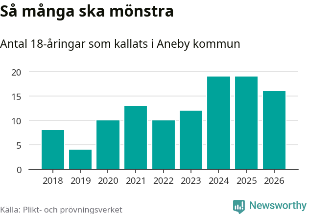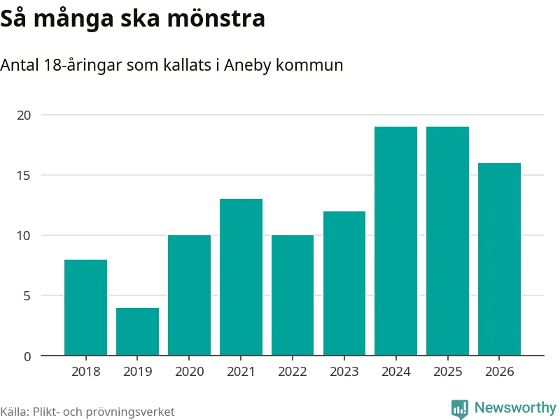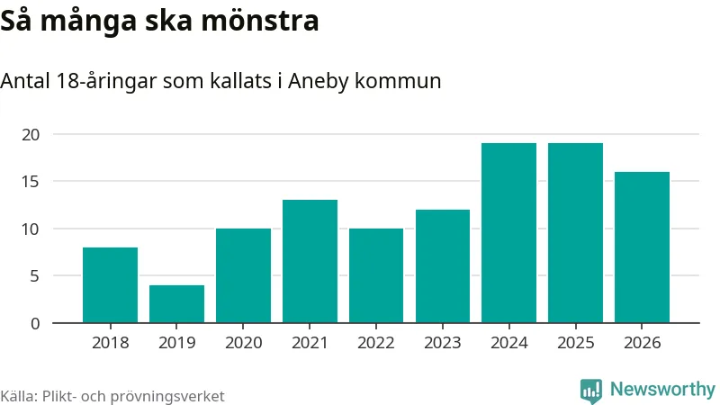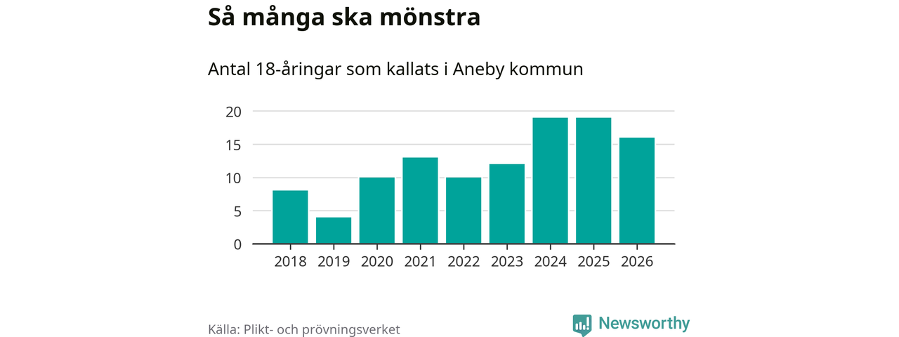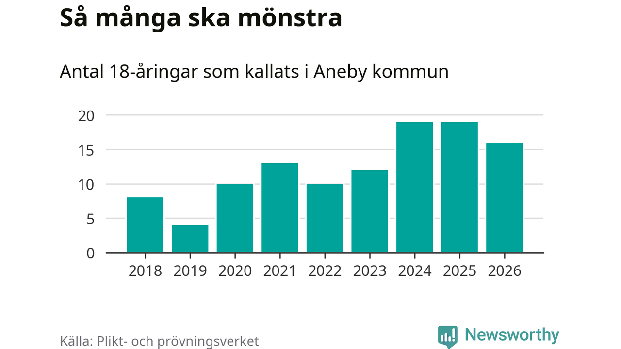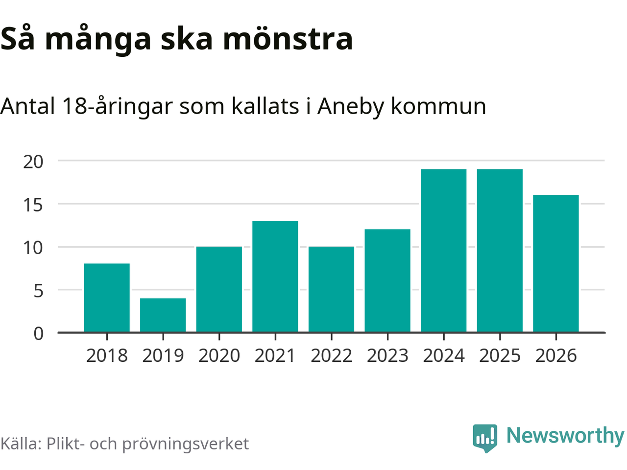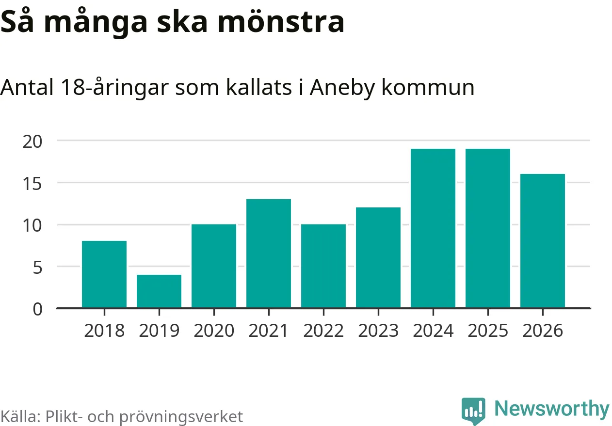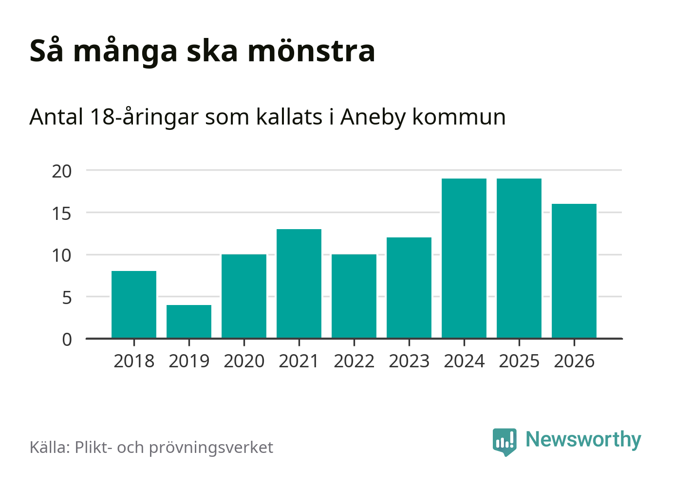Nu kallas omkring 30 000 svenskar födda 2008 till mönstring. Och 16 av dem kommer från Aneby, enligt ny statistik från Plikt- och prövningsverket. Det innebär att var femte invånare i åldersgruppen i kommunen kallas till mönstring. Det är en lägre andel än i Jönköpings län totalt. I riket som helhet kallas nästan var fjärde person i årskullen.