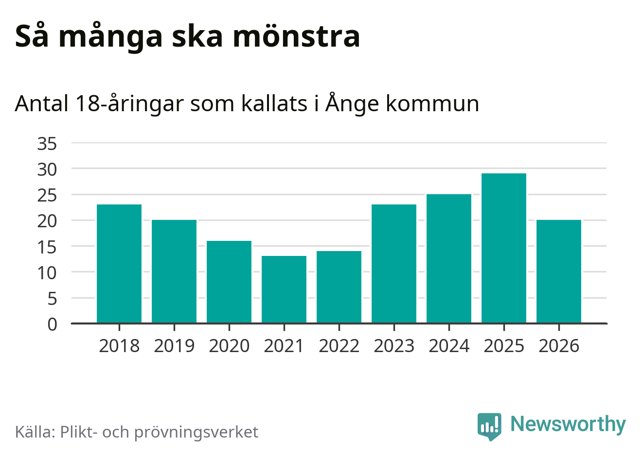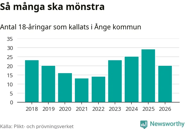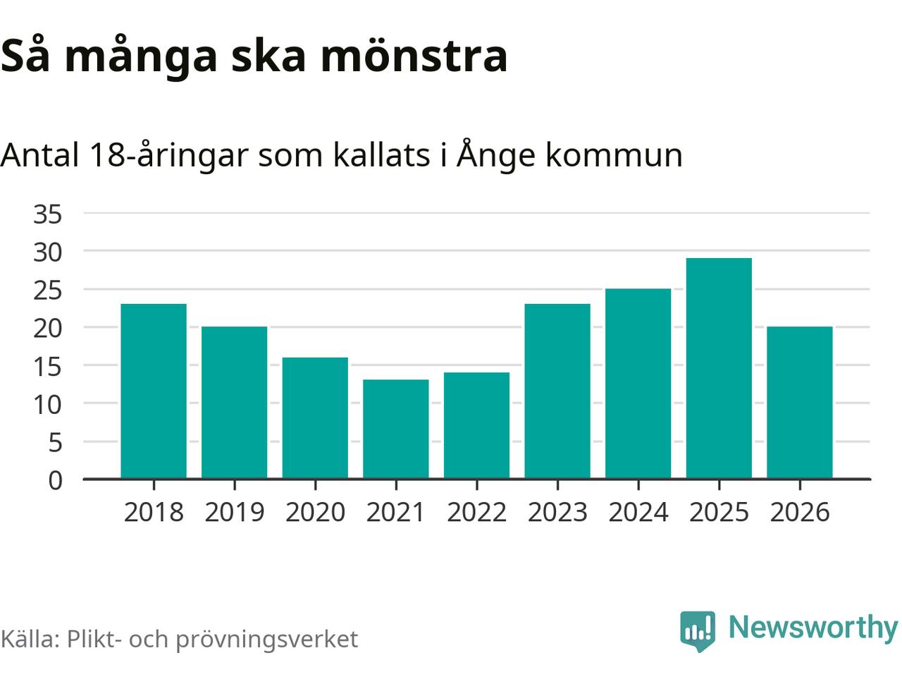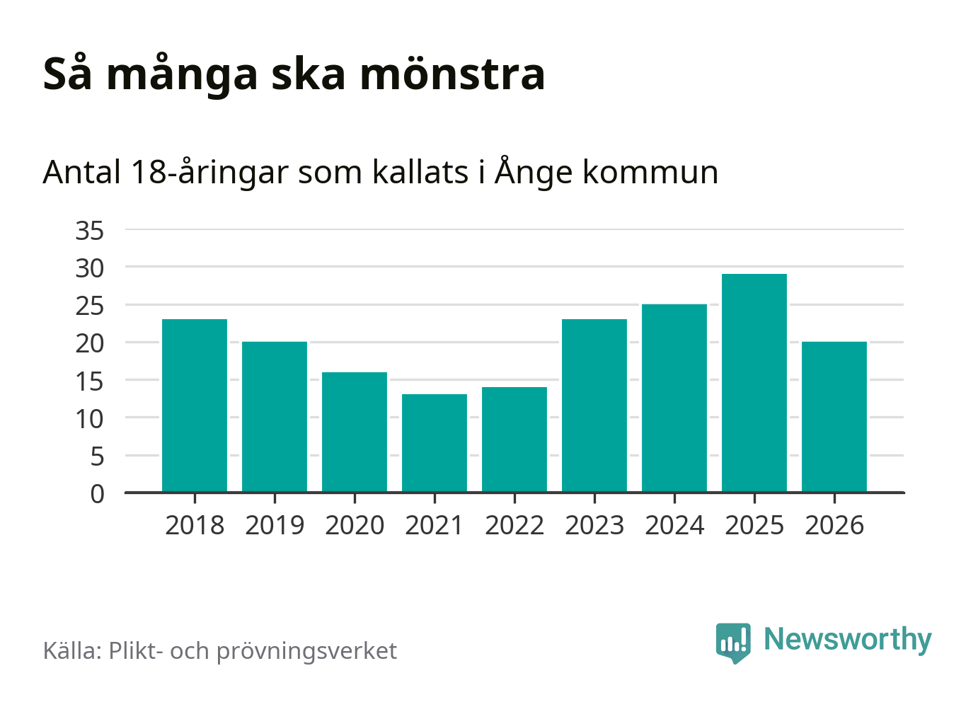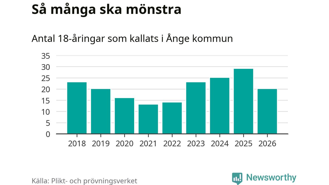 Nu kallas omkring 30 000 svenskar födda 2008 till mönstring. Och 20 av dem kommer från Ånge, enligt ny statistik från Plikt- och prövningsverket. Det innebär att nästan var fjärde invånare i åldersgruppen i kommunen kallas till mönstring. Det är en lägre andel än i Västernorrland totalt. Även i riket som helhet kallas nästan var fjärde person i årskullen.
