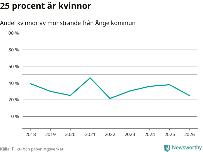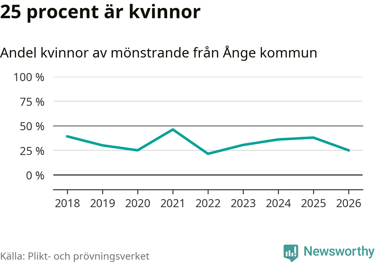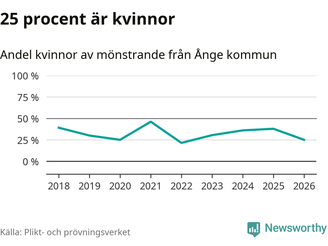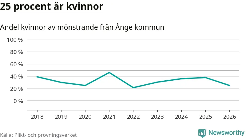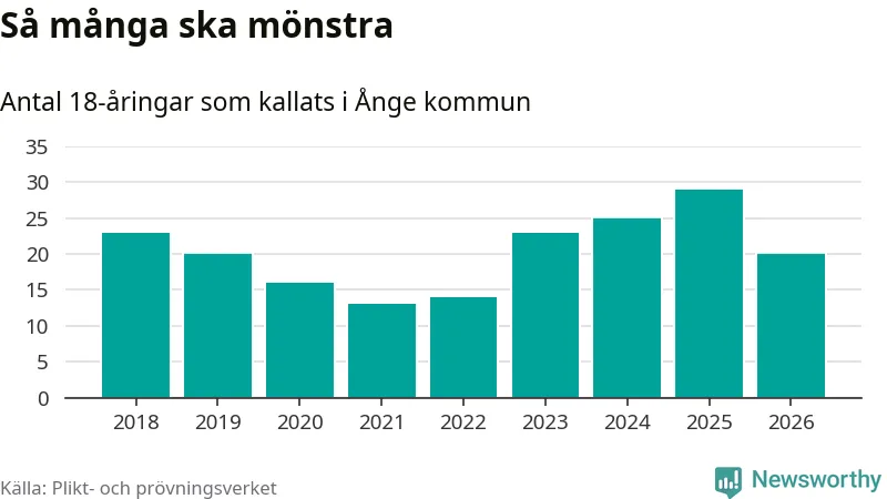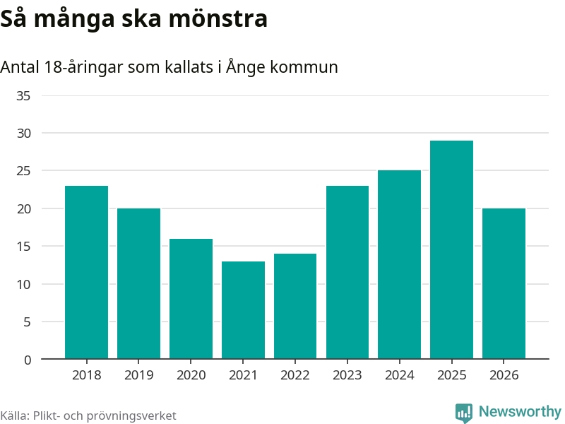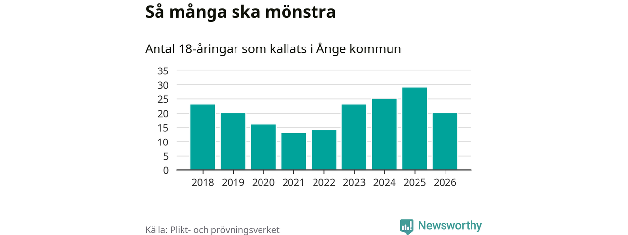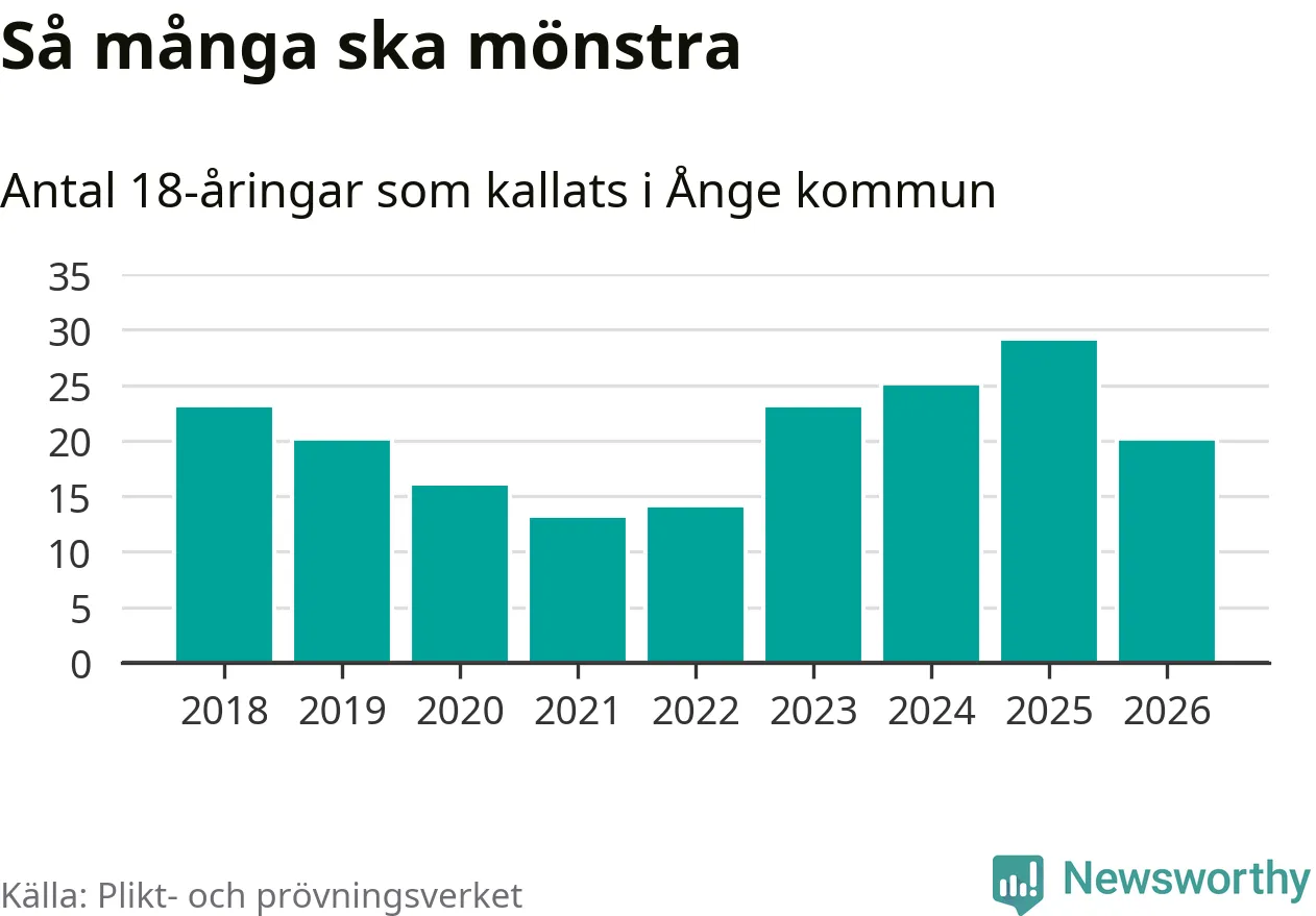 Nu kallas omkring 30 000 svenskar födda 2008 till mönstring. Och 20 av dem kommer från Ånge, enligt ny statistik från Plikt- och prövningsverket. Det innebär att nästan var fjärde invånare i åldersgruppen i kommunen kallas till mönstring. Det är en lägre andel än i Västernorrland totalt. Även i riket som helhet kallas nästan var fjärde person i årskullen.