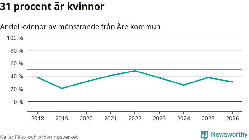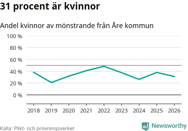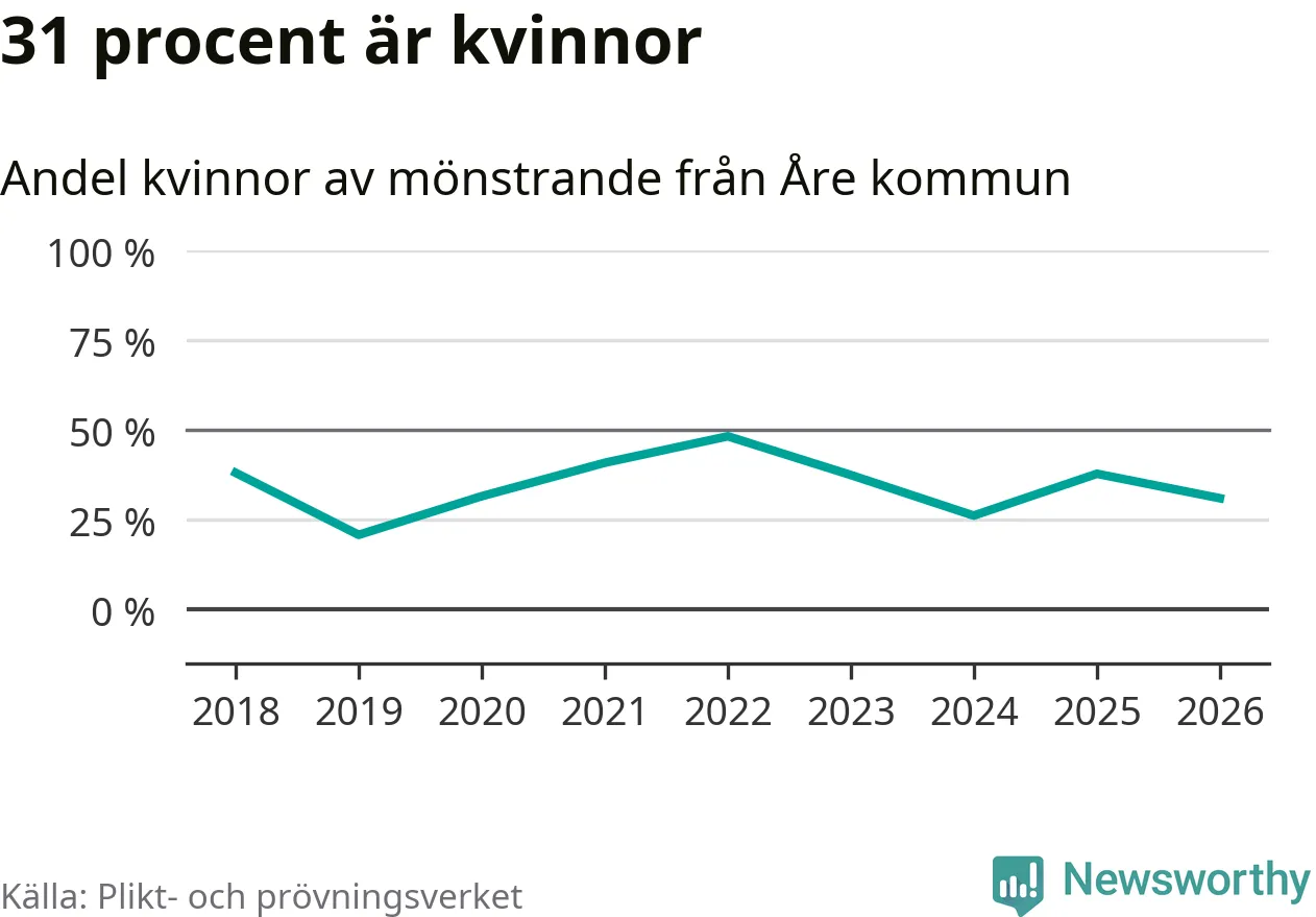 18 av de som kallats till mönstring från Åre är kvinnor, vilket motsvarar 31 procent av de mönstrande. I absoluta tal är det fler kvinnor än något år sedan värnplikten återinfördes, men 2022 var en större andel av de mönstrande från kommunen kvinnor (48 procent). I riket som helhet är 28 procent av de mönstrande tjejer.
