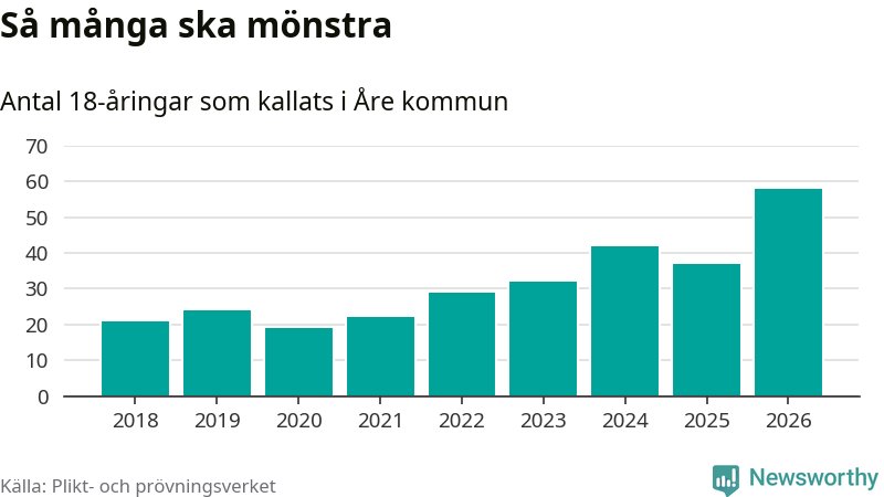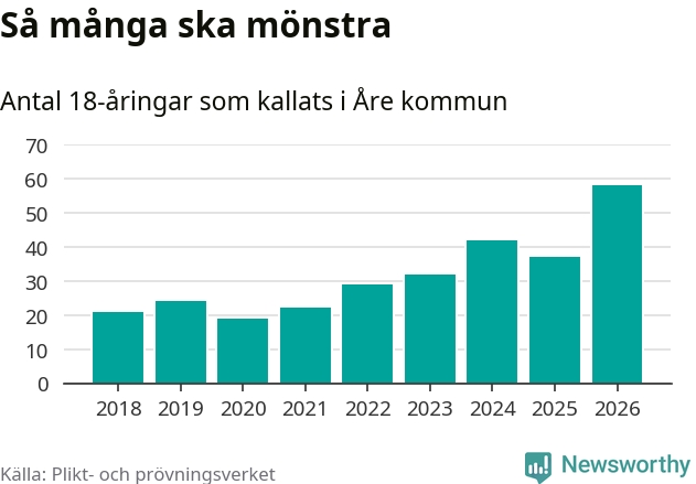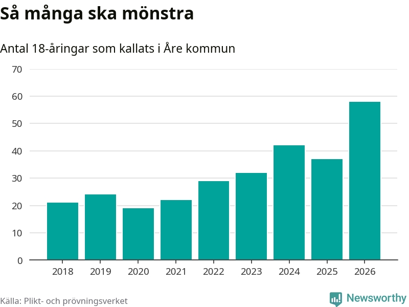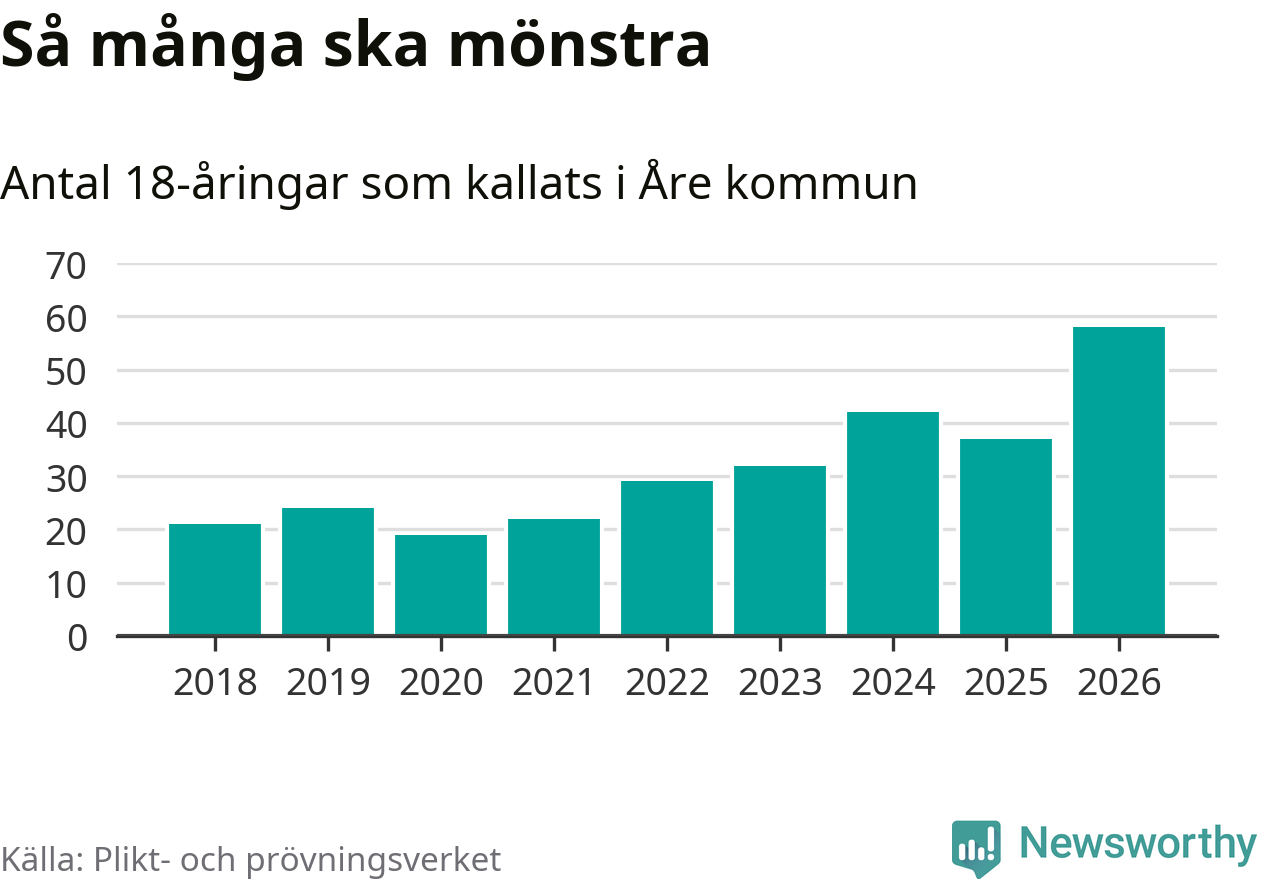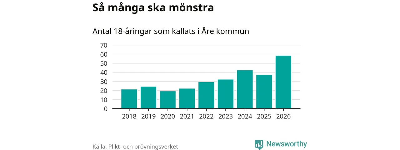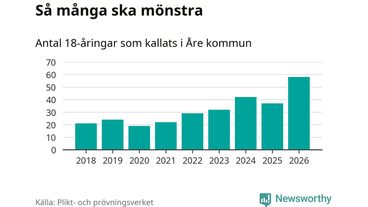 58 personer är det högsta antalet kallade i Åre sedan 2018, som är första året med statistik på kommunnivå (värnplikten återinfördes 2017), och 21 mönstrande fler än 2025. Totalt från Jämtlands län kallas 539 personer i år.