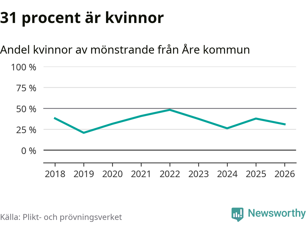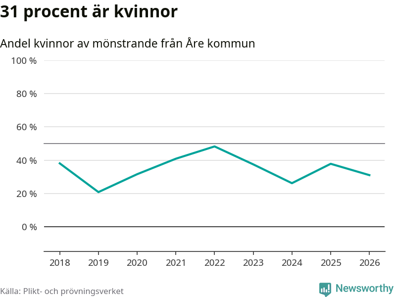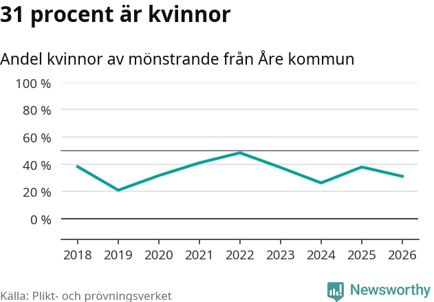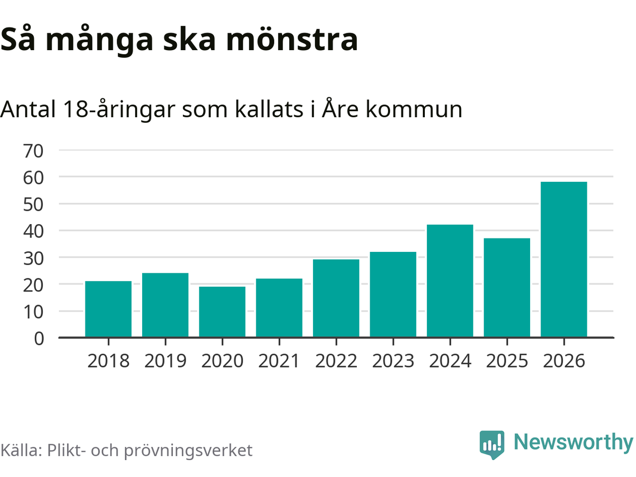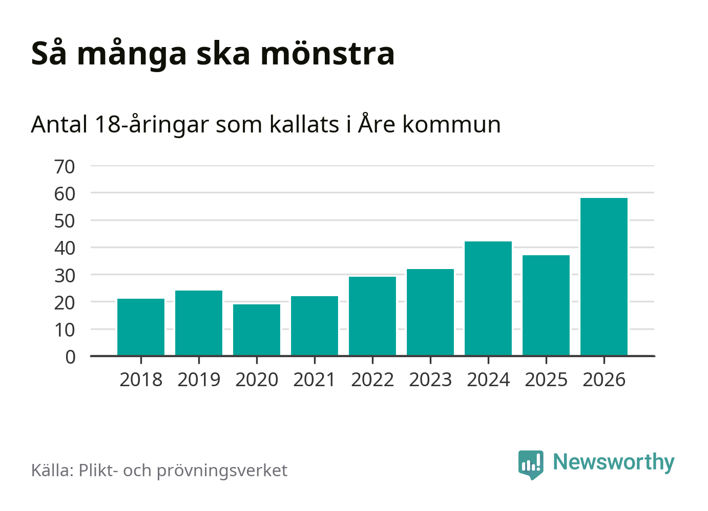 58 personer är det högsta antalet kallade i Åre sedan 2018, som är första året med statistik på kommunnivå (värnplikten återinfördes 2017), och 21 mönstrande fler än 2025. Totalt från Jämtlands län kallas 539 personer i år.