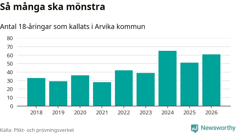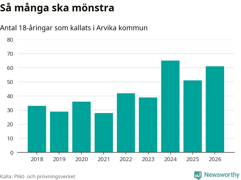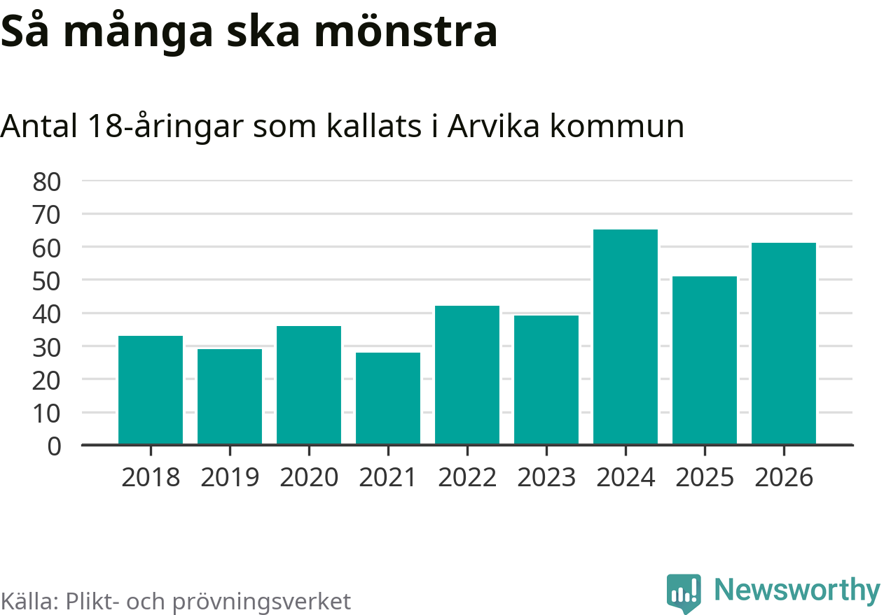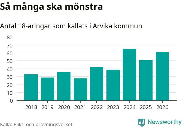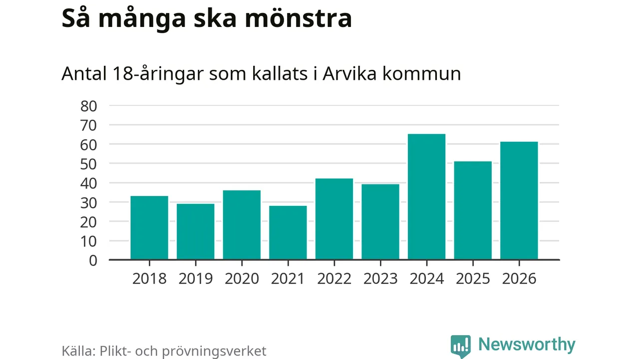 61 personer är tio fler än 2025. Som mest har 65 personer från en årskull kommunen mönstrat (2024). Totalt från Värmlands län kallas 730 personer i år.