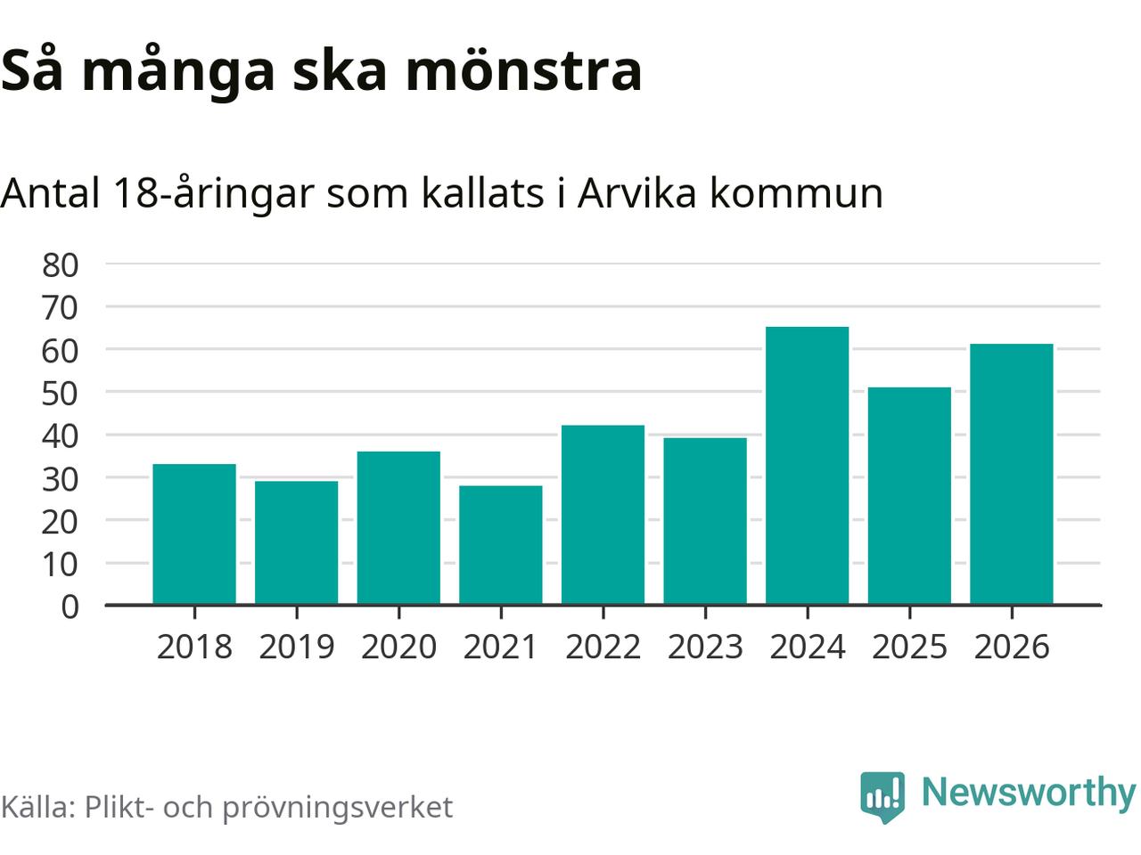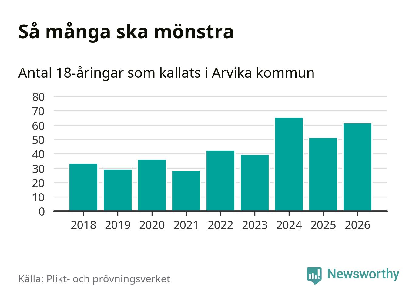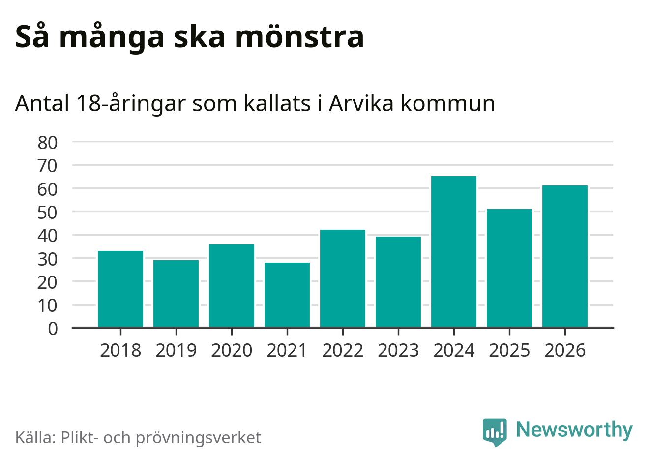61 personer är tio fler än 2025. Som mest har 65 personer från en årskull kommunen mönstrat (2024). Totalt från Värmlands län kallas 730 personer i år.