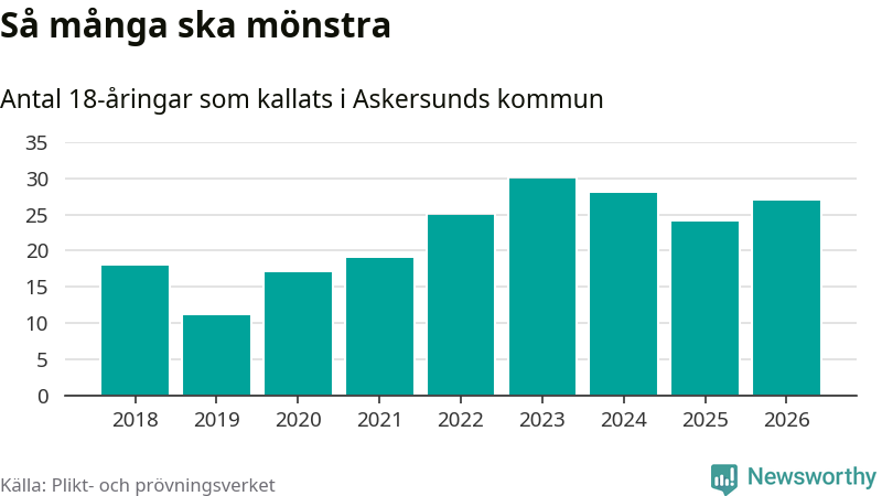 27 personer är tre fler än 2025. Som mest har 30 personer från en årskull kommunen mönstrat (2023). Totalt från Örebro län kallas 850 personer i år.