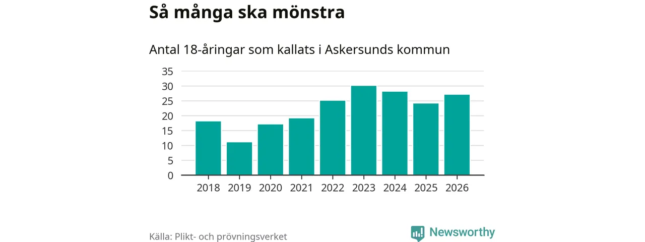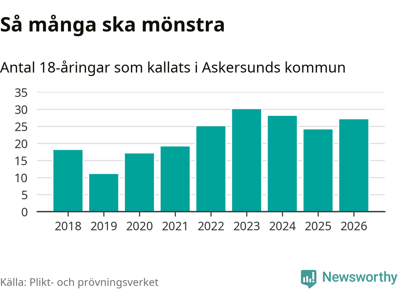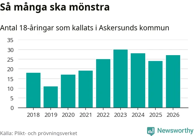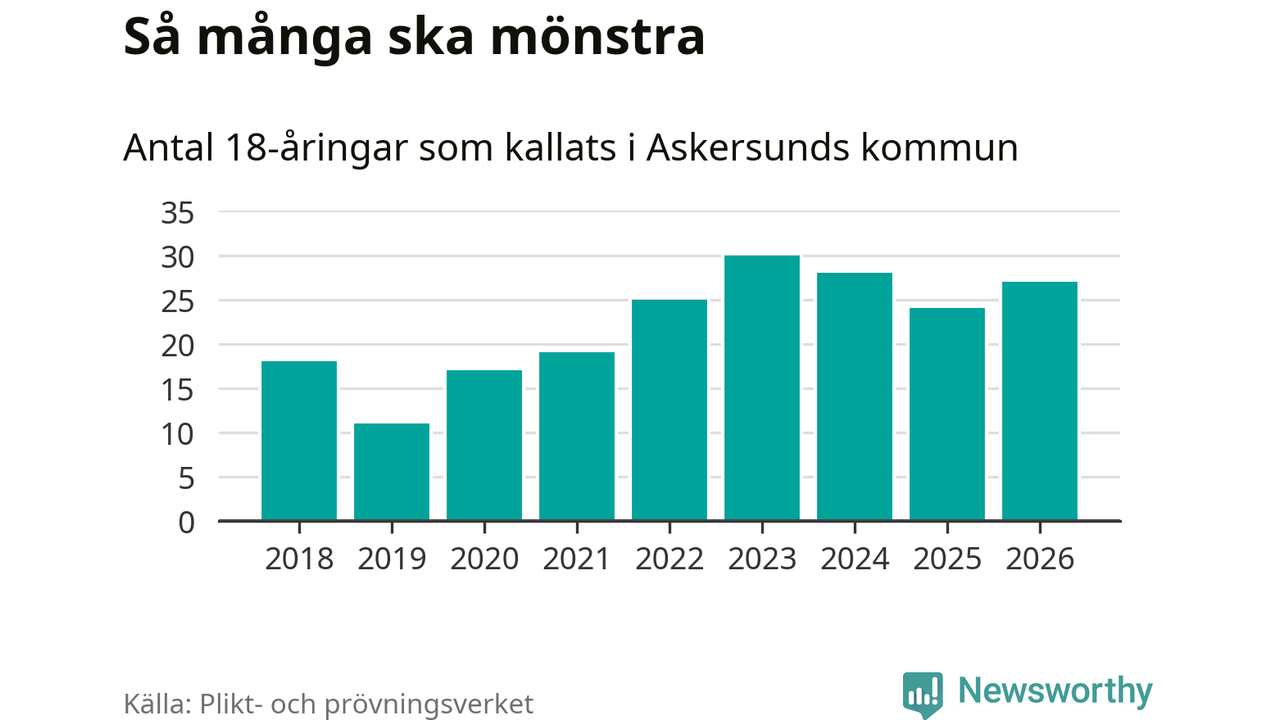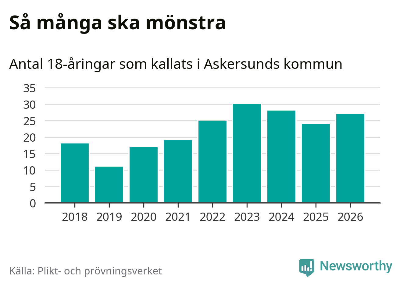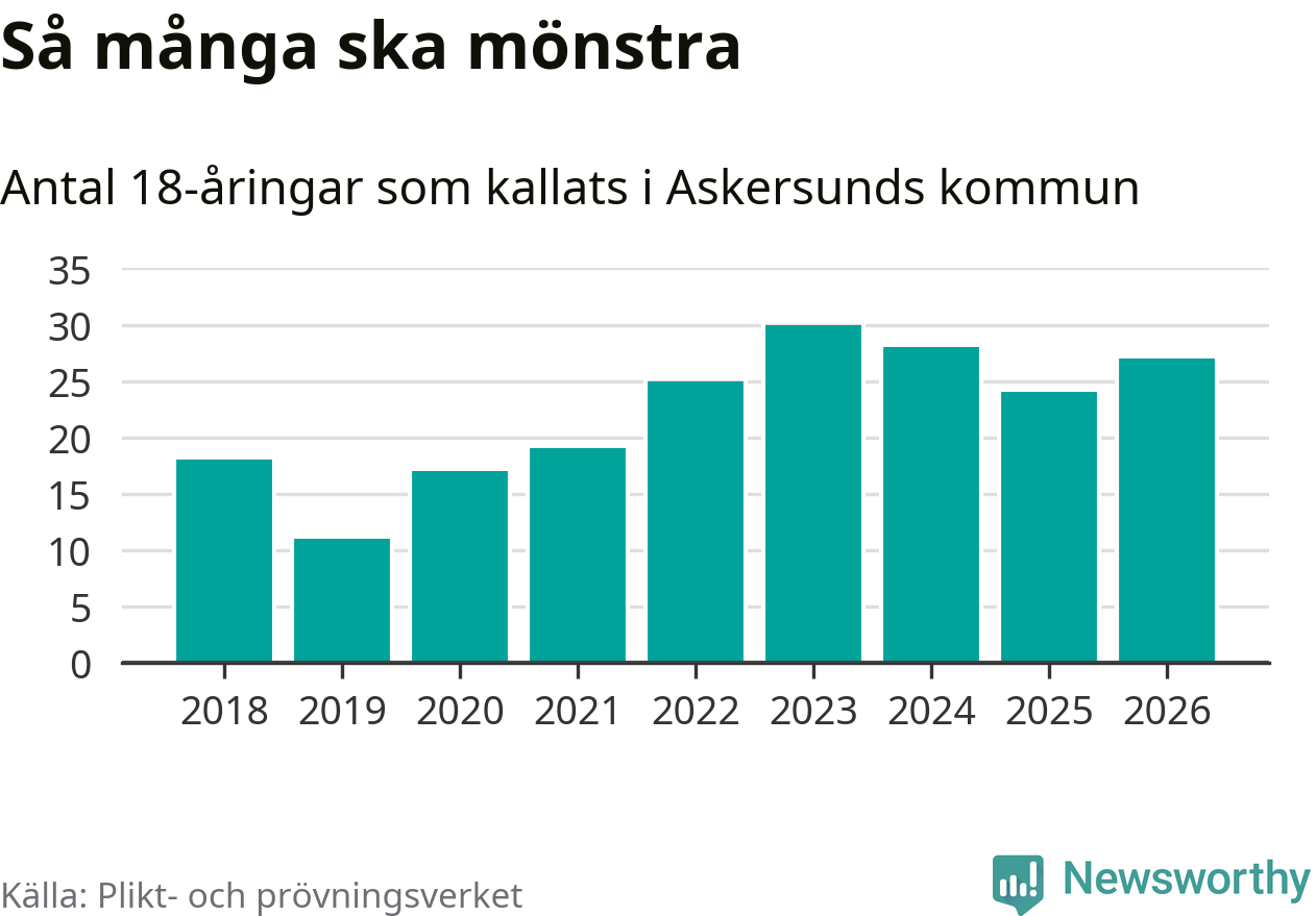 Av de som skrivits in till någon av Försvarmaktens grundutbildningar förra året, 2025, kommer 13 (elva män och två kvinnor) från Askersund. Tolv av dessa antogs efter att ha kallats till mönstring.