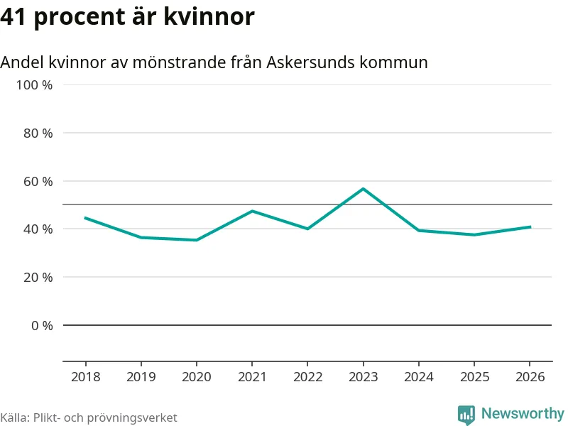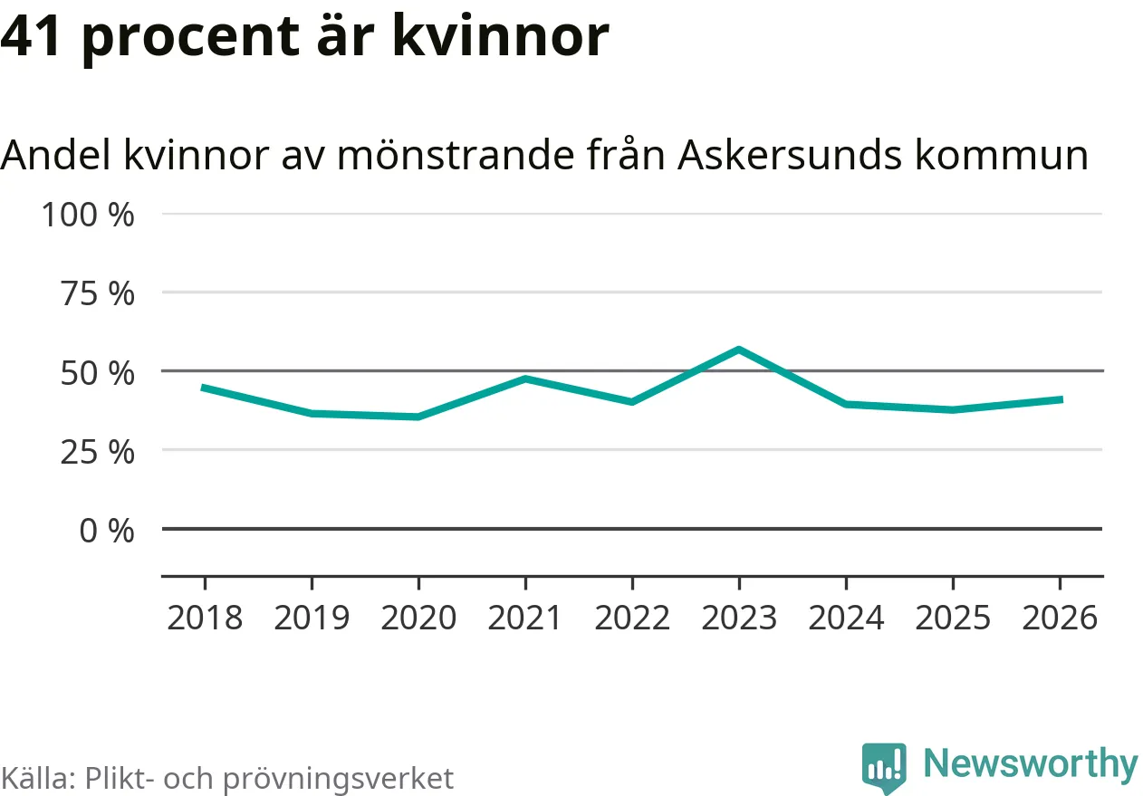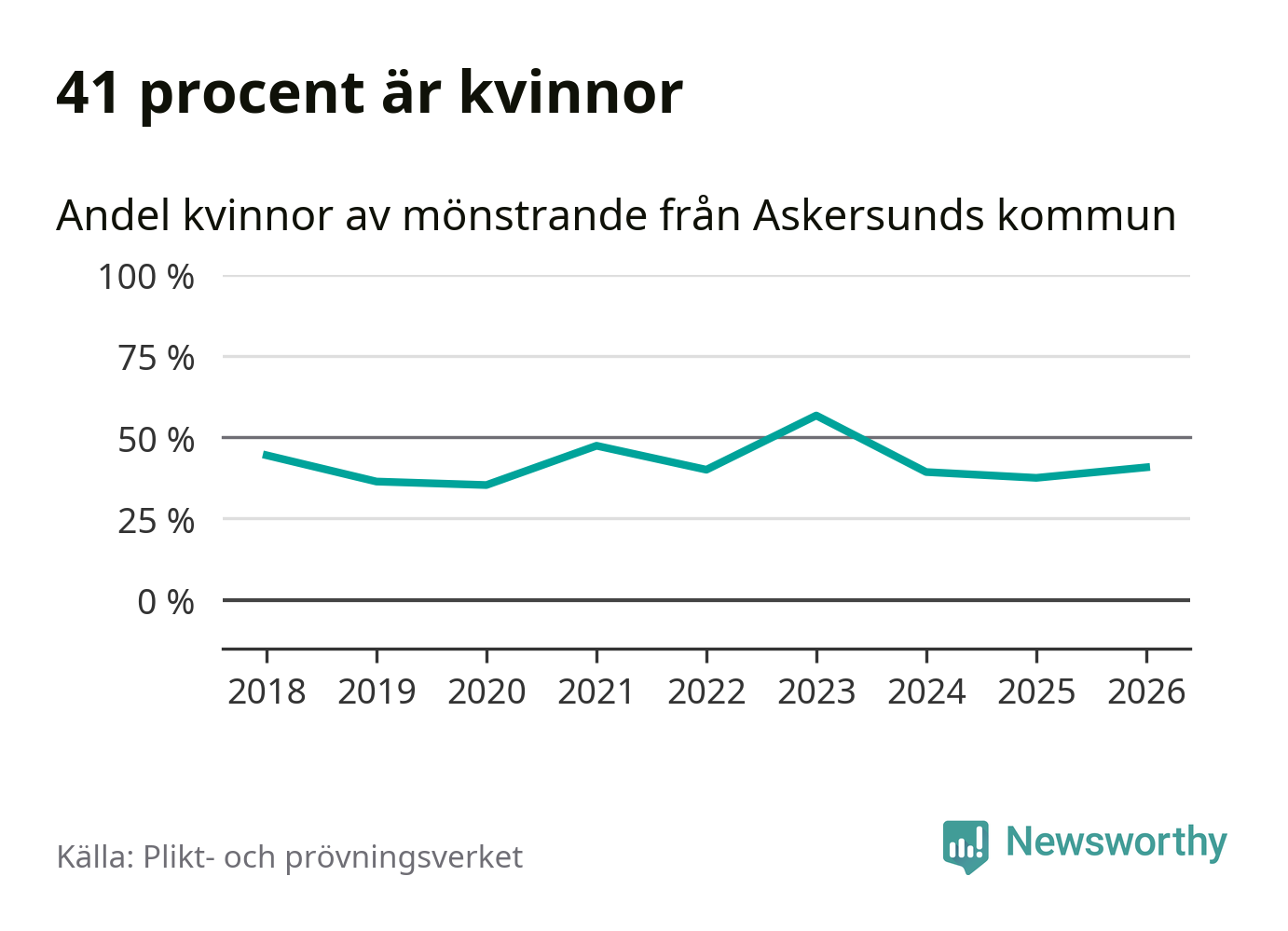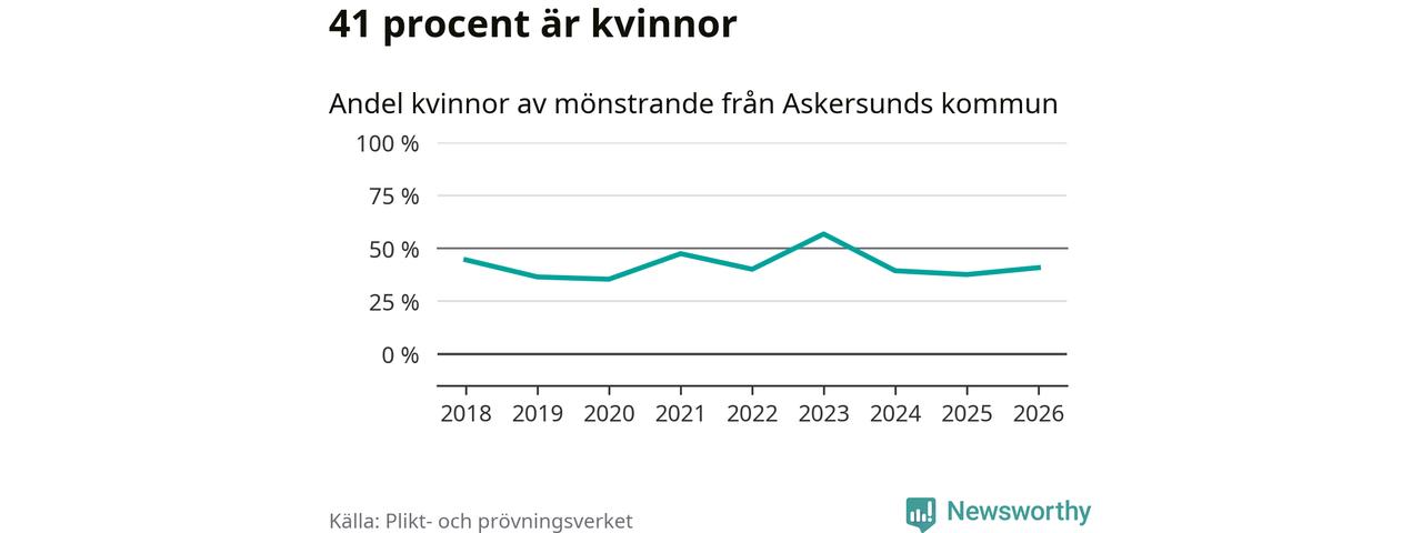 Elva av de som kallats till mönstring från Askersund är kvinnor, vilket motsvarar 41 procent av de mönstrande. Som mest har 17 kvinnor kallats från kommunen (2023). I riket som helhet är 28 procent av de mönstrande tjejer.