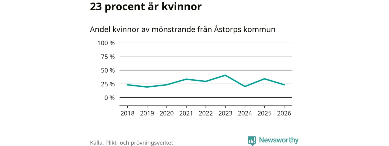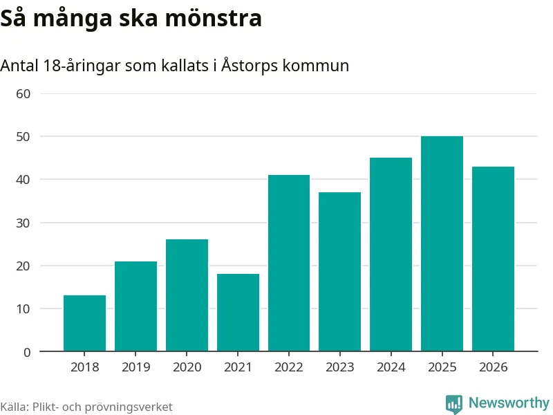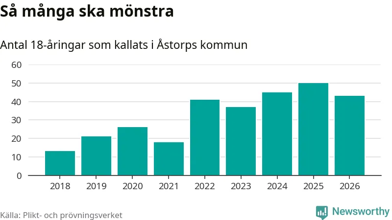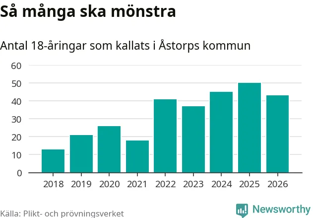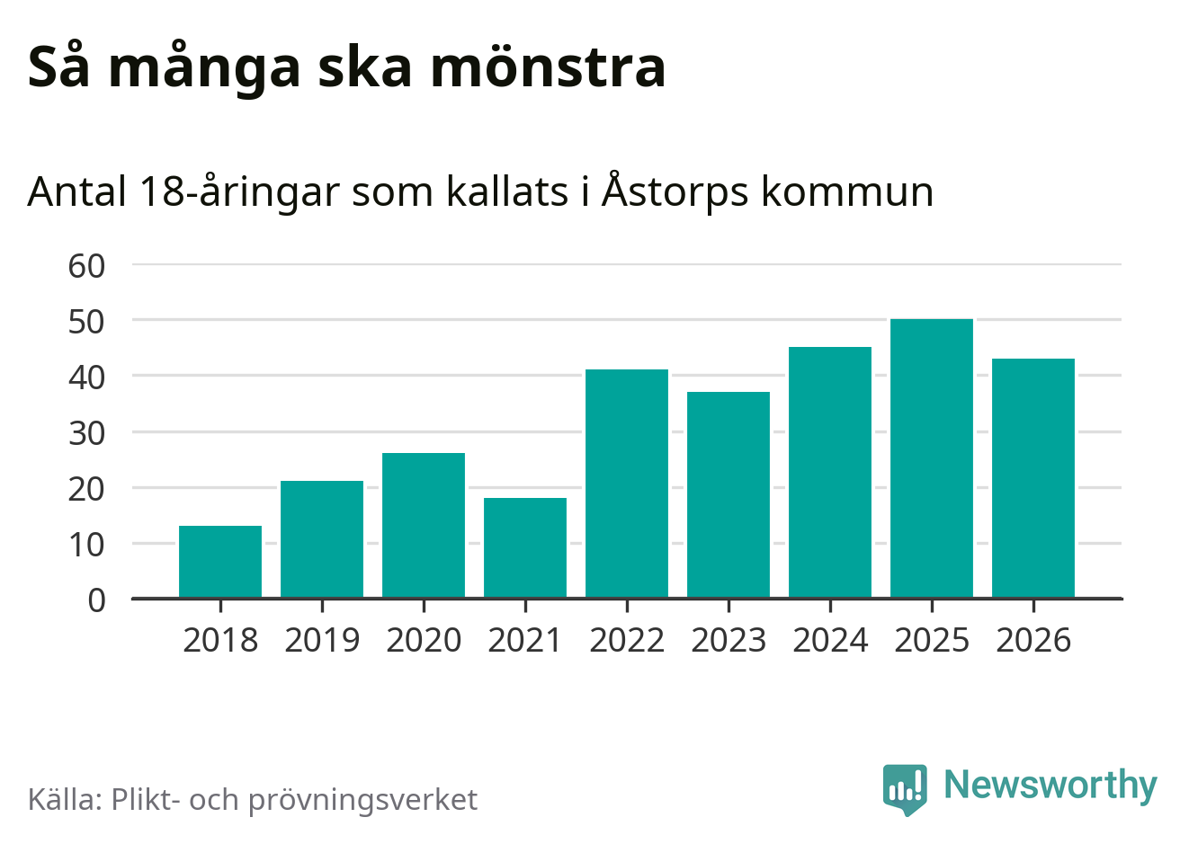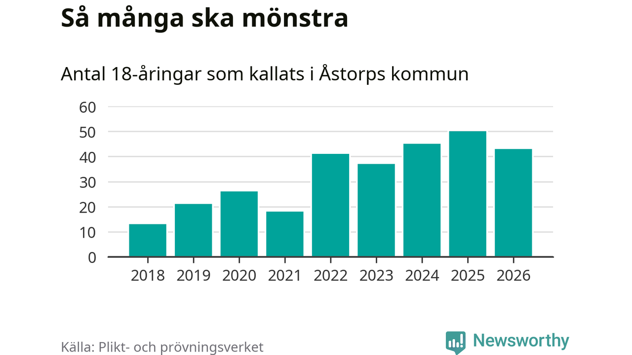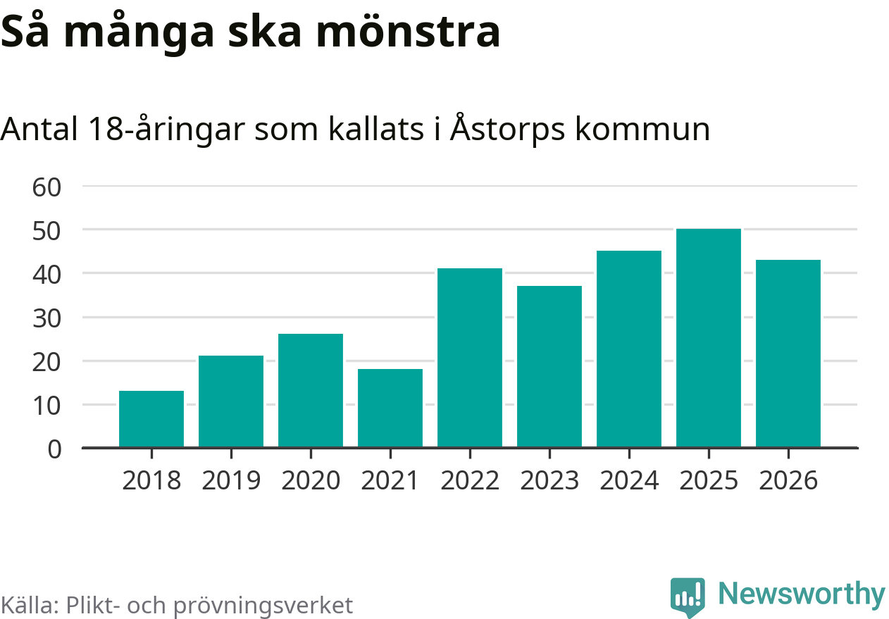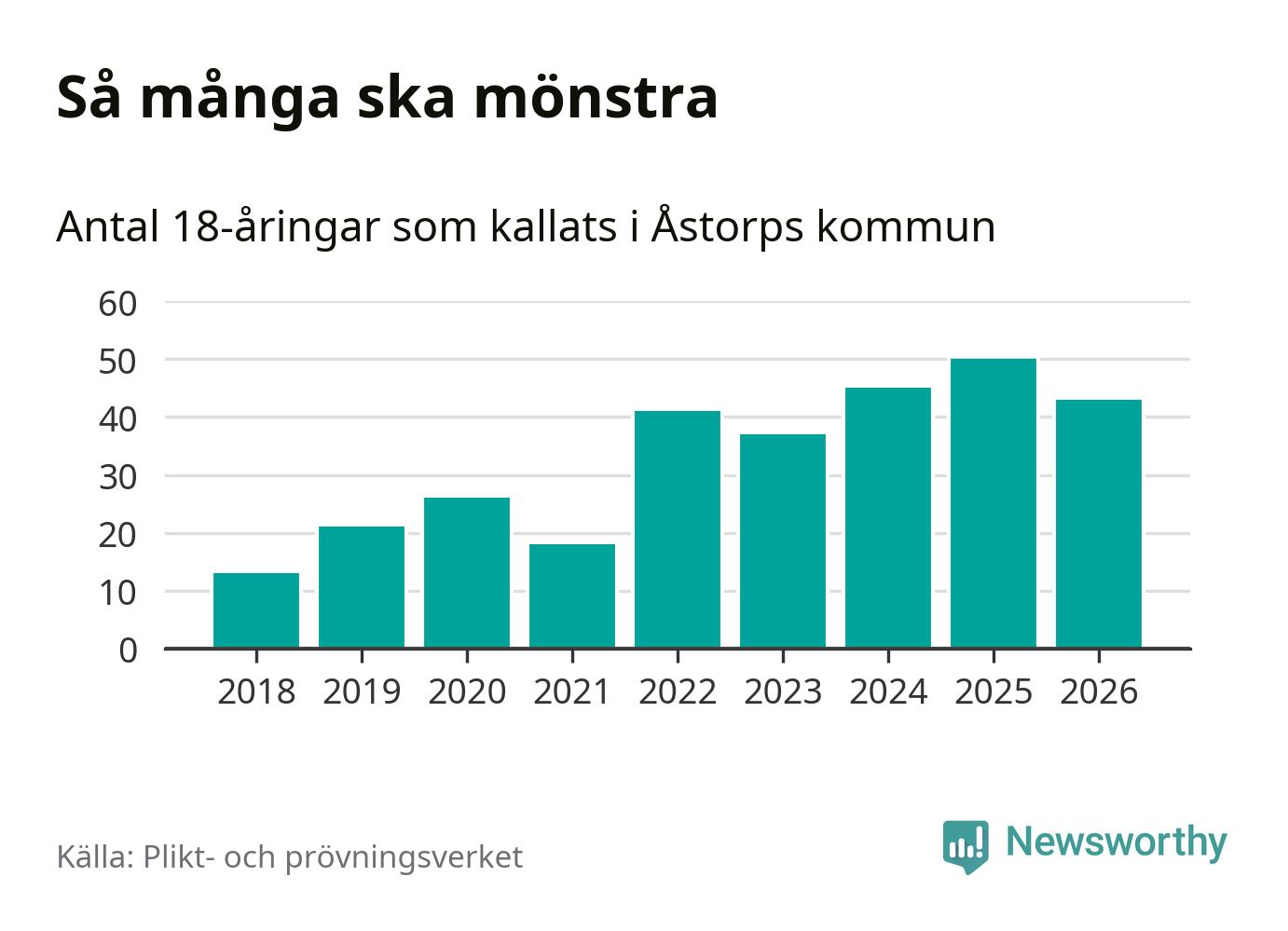 Nu kallas omkring 30 000 svenskar födda 2008 till mönstring. Och 43 av dem kommer från Åstorp, enligt ny statistik från Plikt- och prövningsverket. Det innebär att var sjätte invånare i åldersgruppen i kommunen kallas till mönstring. Det är en lägre andel än i Skåne totalt. I riket som helhet kallas nästan var fjärde person i årskullen.