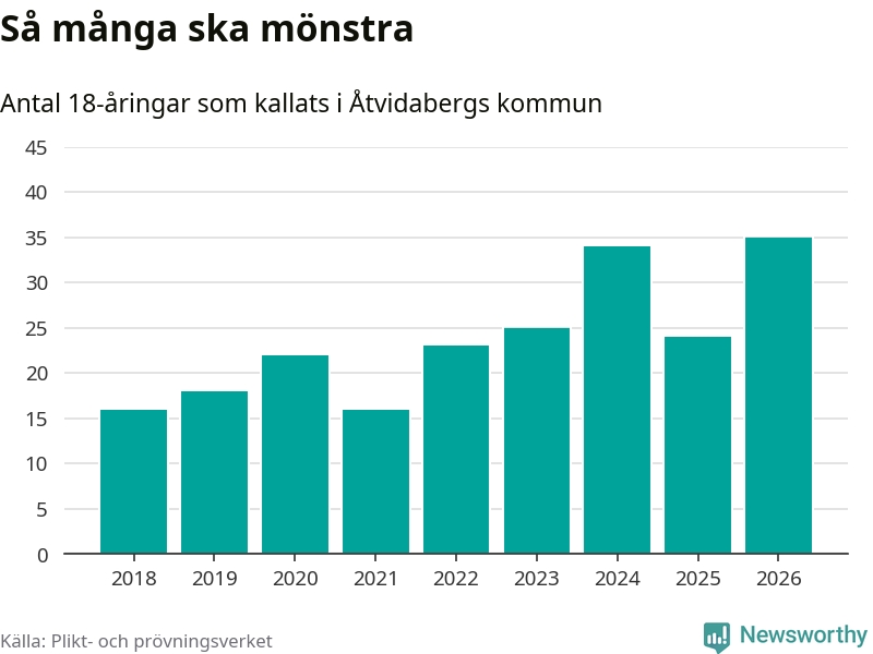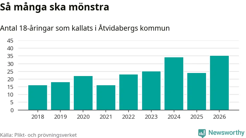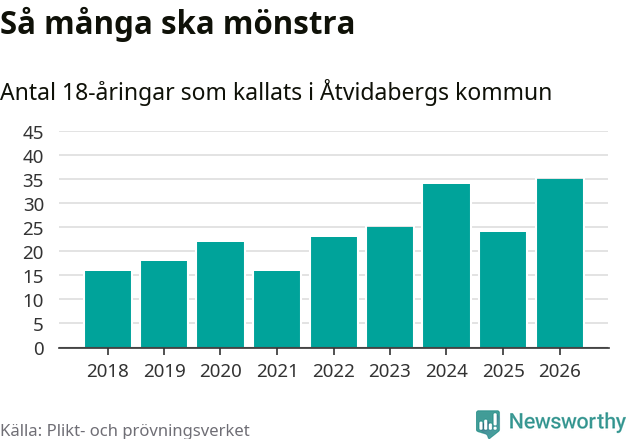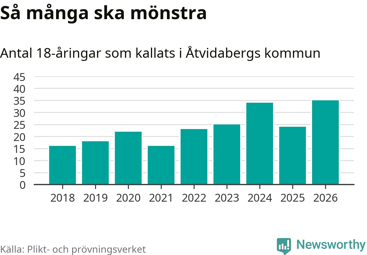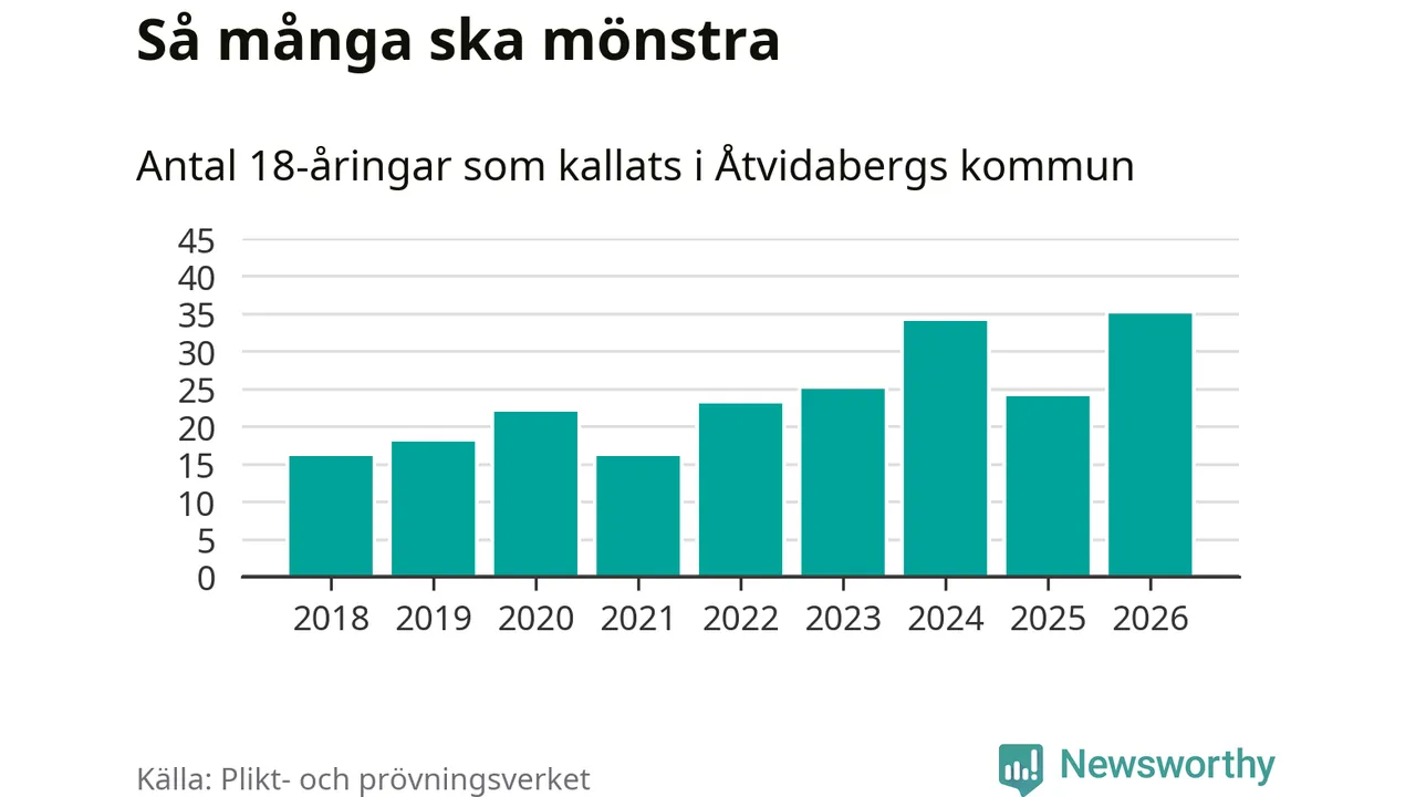 35 personer är det högsta antalet kallade i Åtvidaberg sedan 2018, som är första året med statistik på kommunnivå (värnplikten återinfördes 2017), och elva mönstrande fler än 2025. Totalt från Östergötlands län kallas 1 318 personer i år.